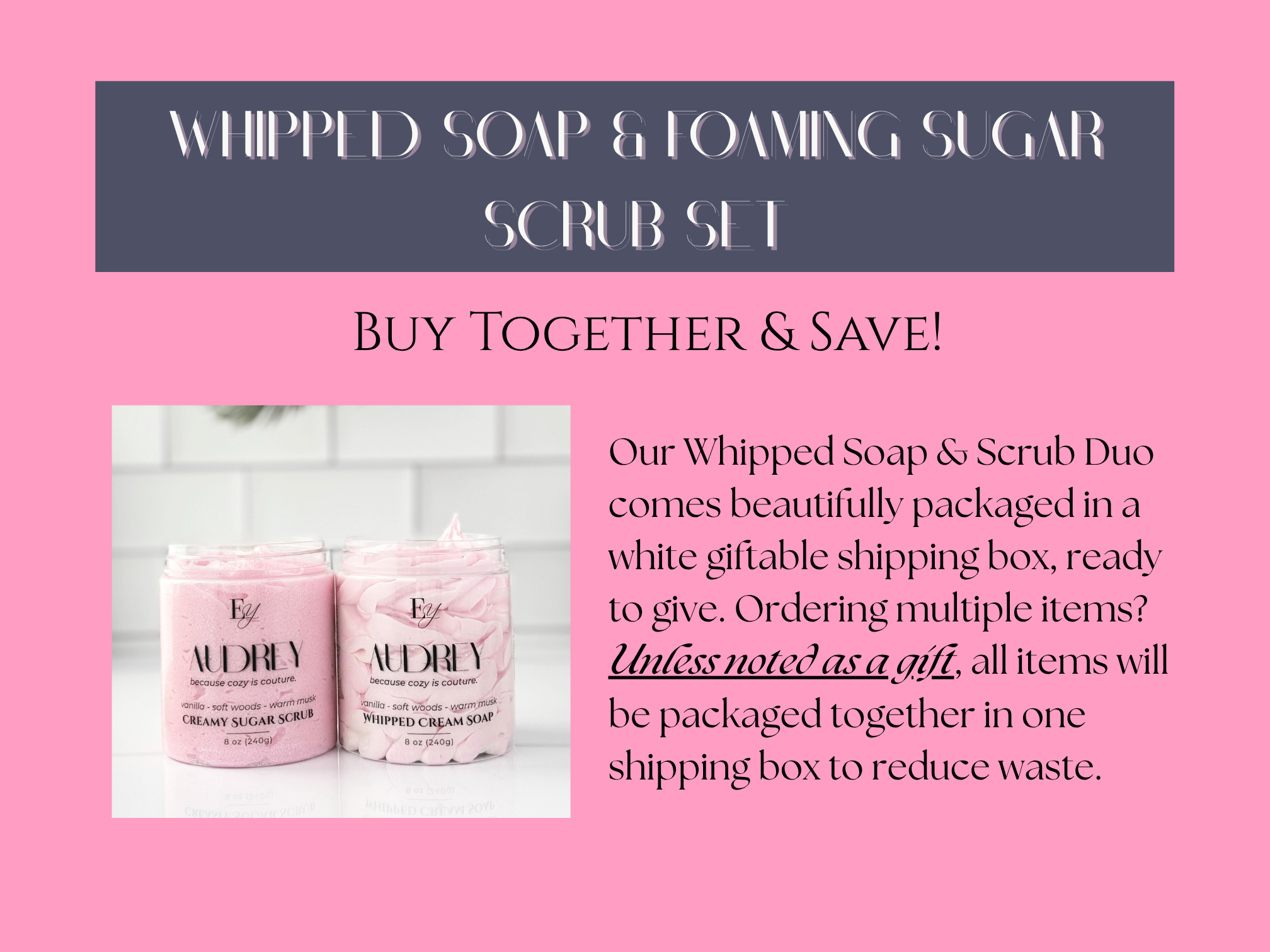 Get the best of both worlds! Pair the whipped soap and sugar scrub for the ultimate self-care ritual or the ultimate gift with special bundle savings.