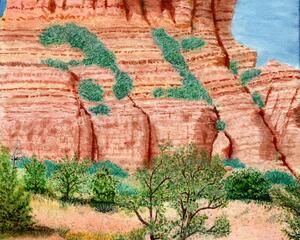 This 11in. x 14in. realistic watercolor landscape painting depicts a rustic barn nestled amidst rolling hills and mountains under a vibrant blue sky. The barn, rendered in warm hues of brown and red, stands out against the lush green hills and the distant mountains. Wispy white clouds in the sky and a jumbled yellow flowering plant add a touch of whimsy to the scene.