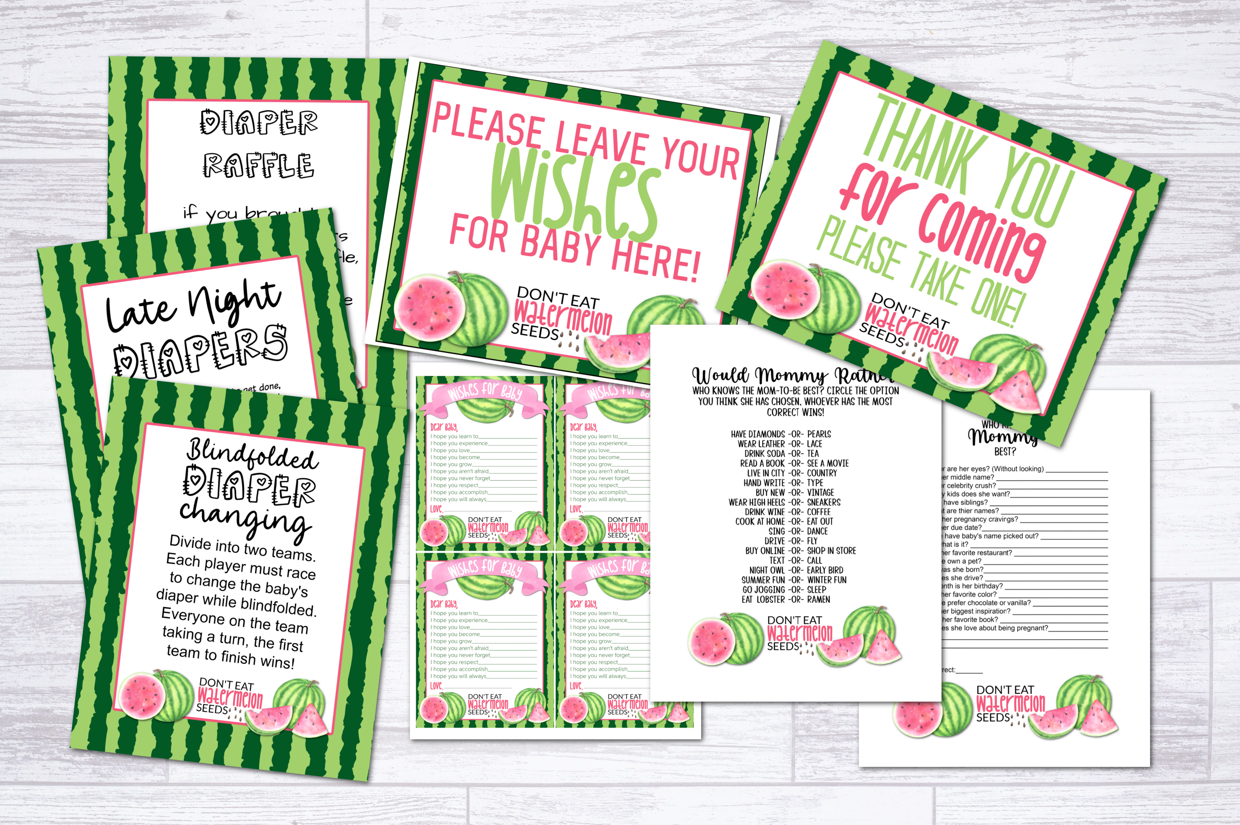 This set includes games and signs for your "Don't eat watermelon seeds" baby shower! *PLEASE NOTE* This is a digital download product, and no physical item will be shipped to you. Simply purchase, download and print. You can print at home or at a print shop. Images are 300dpi. For best results print on 8.5x11 semi-gloss cardstock.