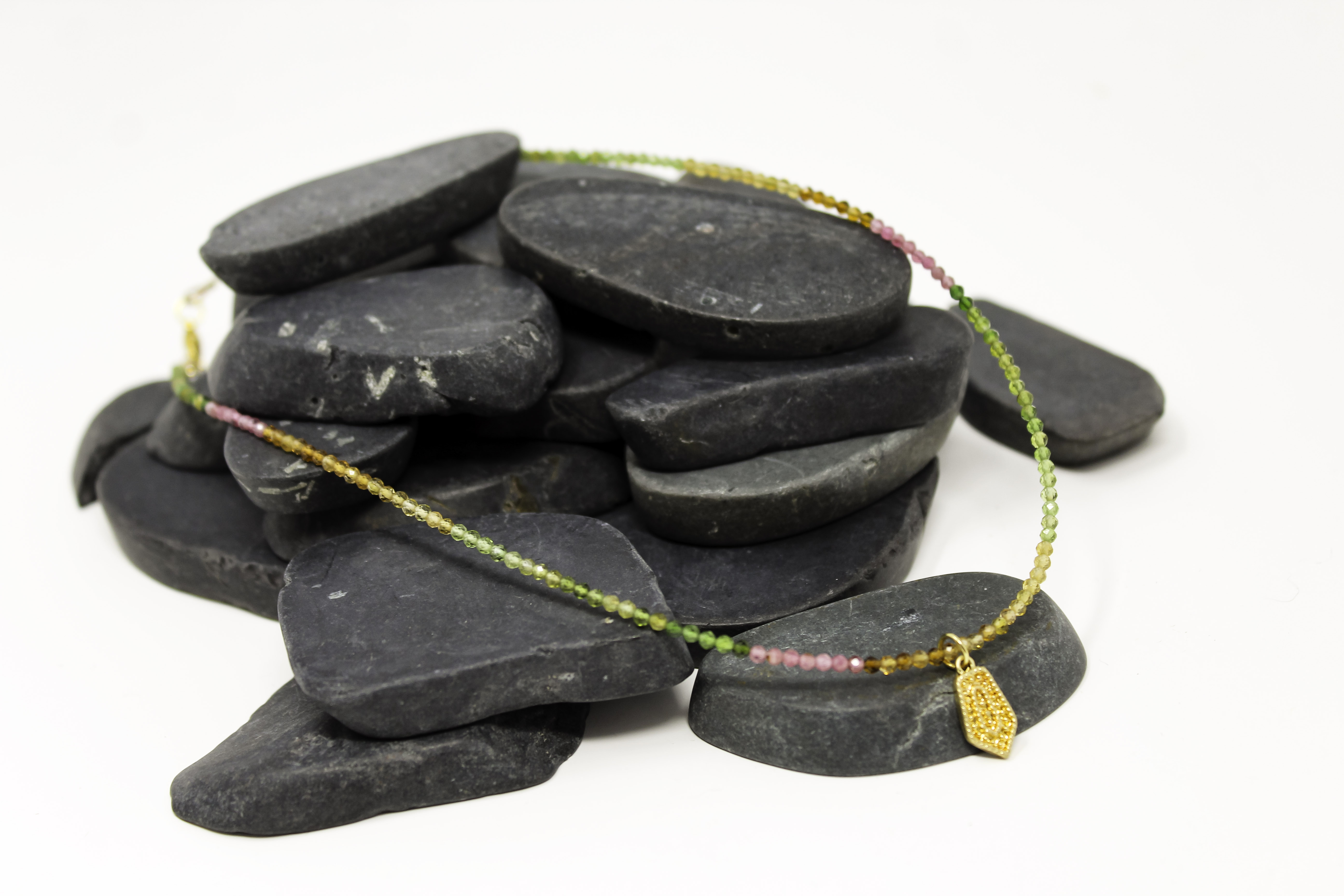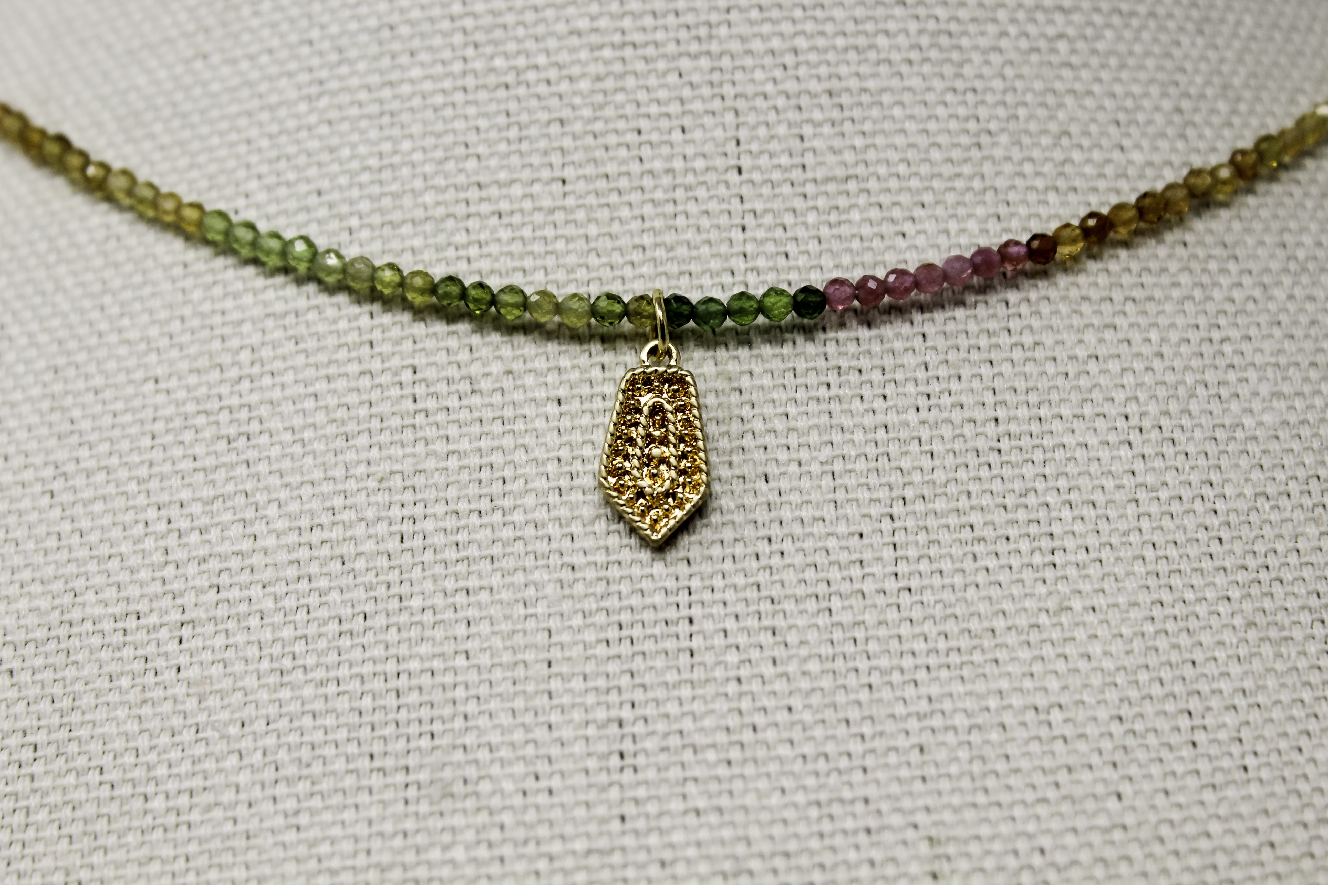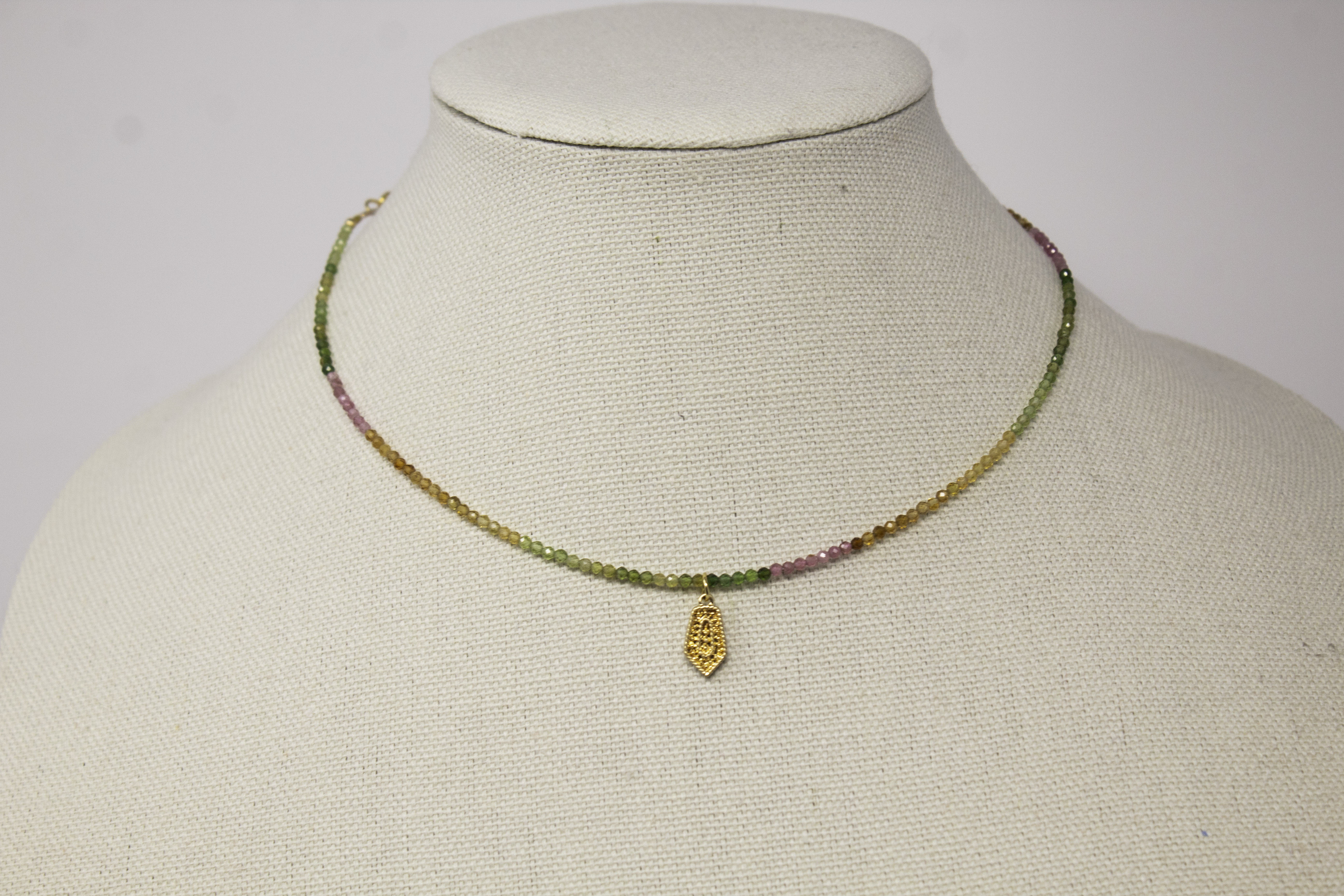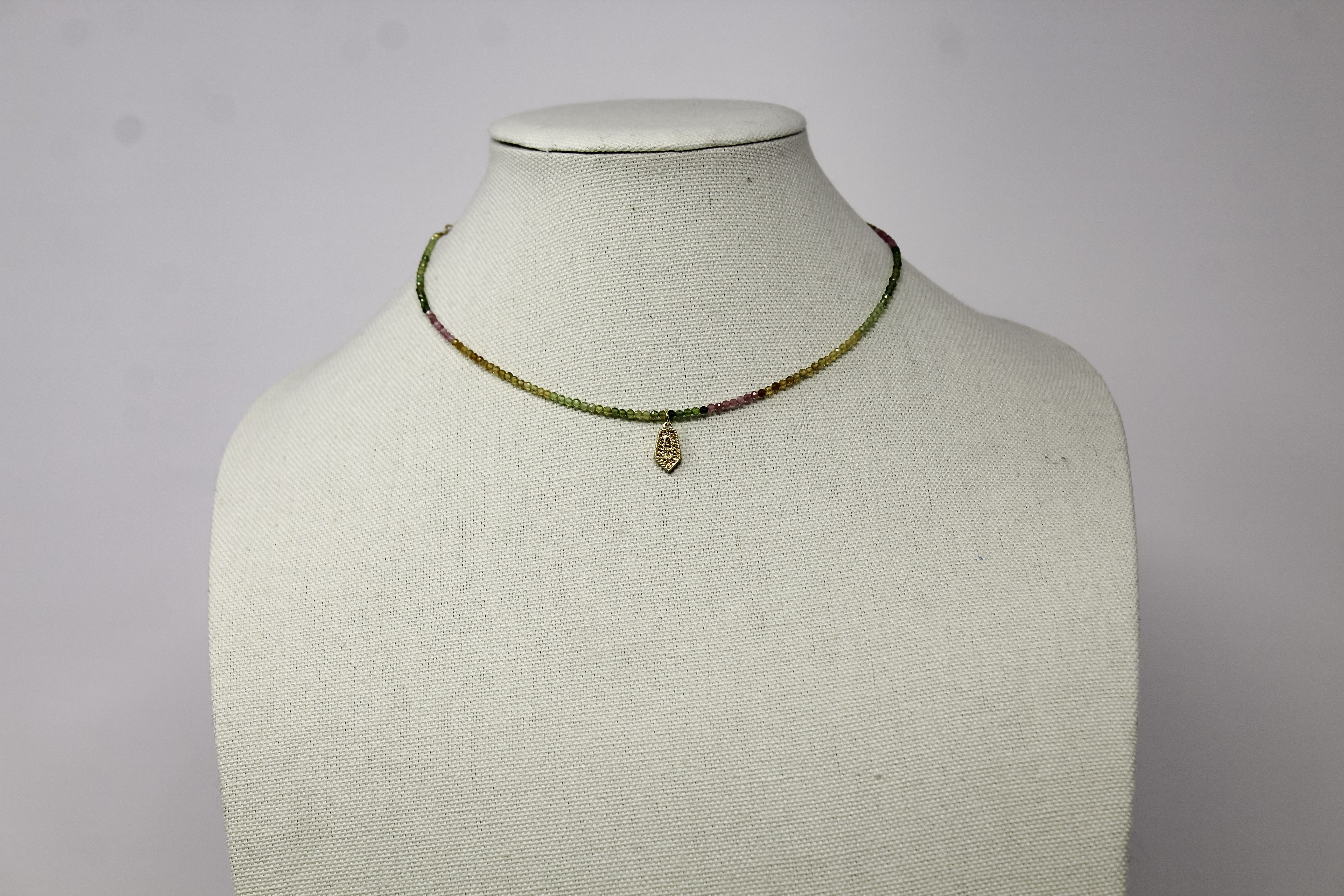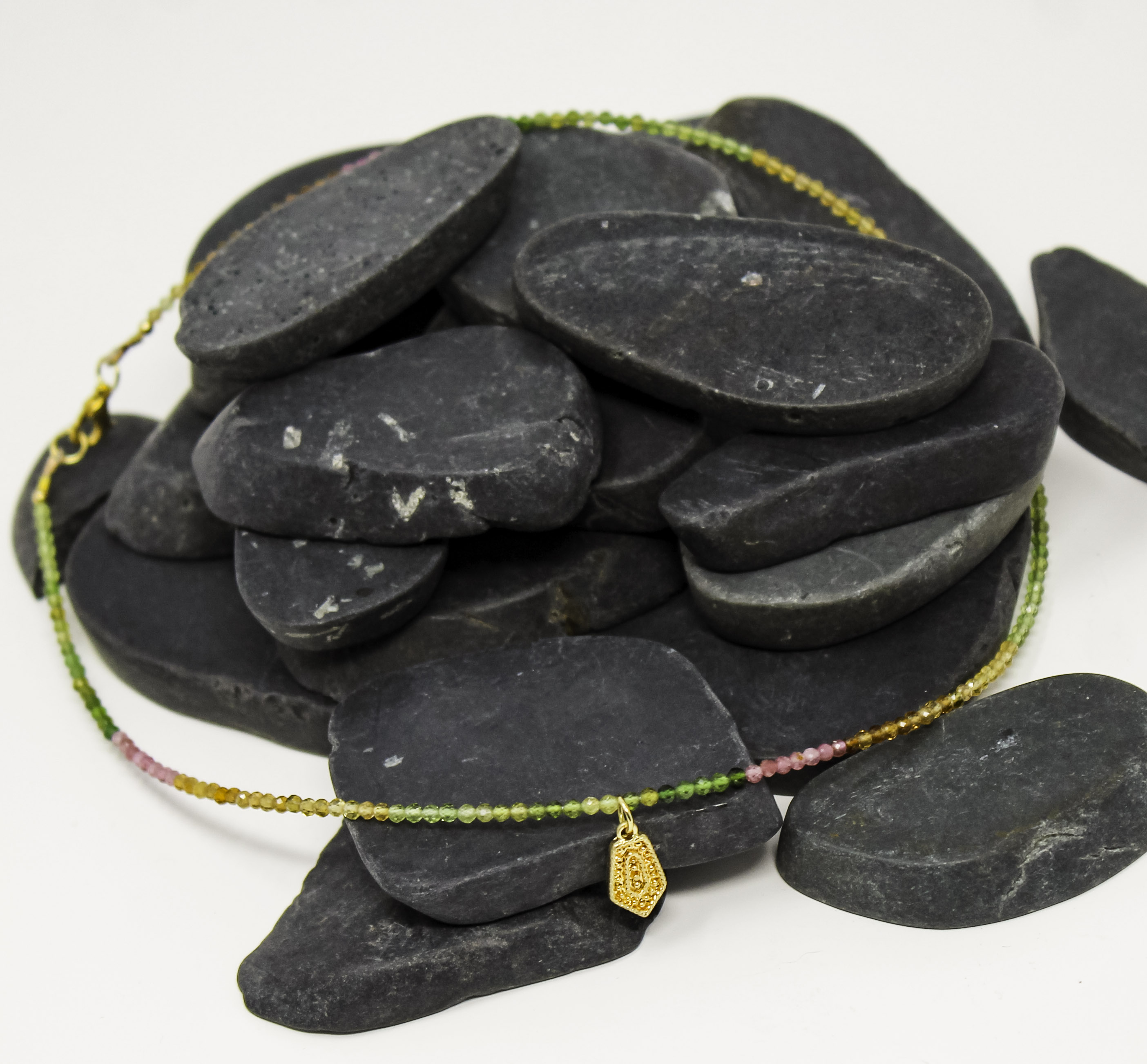 This watermelon ombré tourmaline necklace captures the vibrant beauty of nature in a delicate, hand-strung design. Featuring micro-faceted tourmaline gemstones that shimmer in a gradient of pinks, greens, and earthy tones, each bead reflects light with dazzling brilliance. A bright brass charm adds a warm golden accent, perfectly complementing the gemstone’s natural hues. Measuring 16 inches in length, this necklace sits gracefully at the collarbone—ideal for layering or wearing as a simple, colorful statement piece