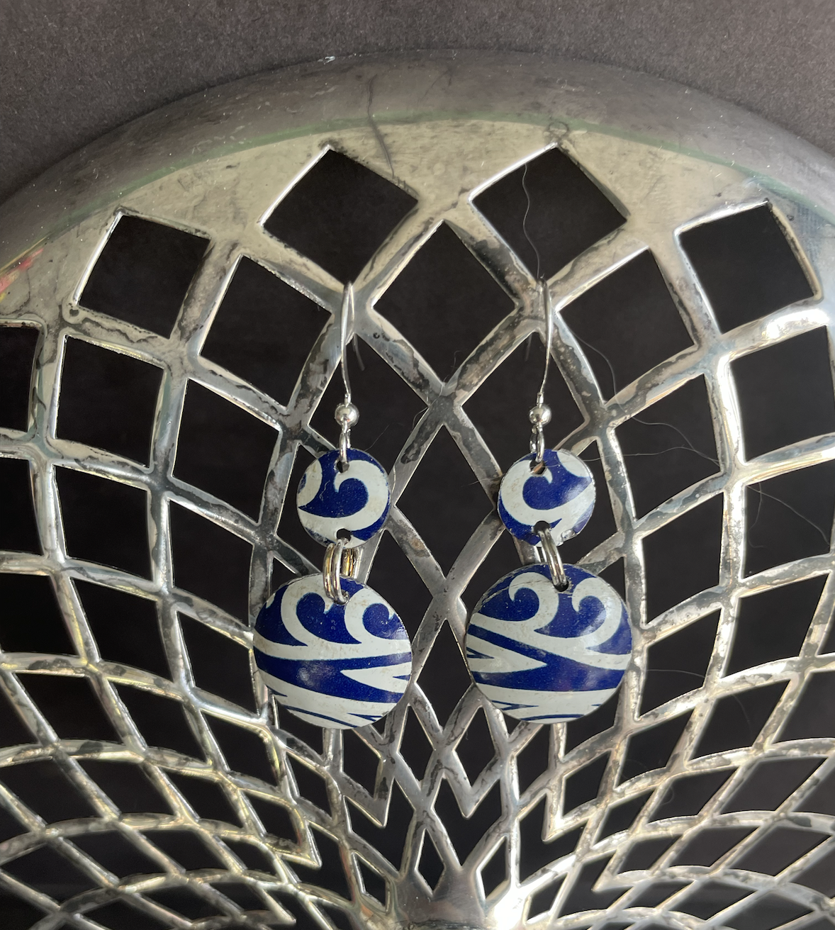 Tins are very light making them ideal for earrings as they don't weigh down your ears as the day goes on. Did you know the proper term for working with tin is "tinkering"? That made me really happy. I literally tinker in my art studio! I use old cookie tins, tea tins, and the like, break them down, and hand cut them into shapes and hand-hammer them into the 3-D shape I want them to be, finish and polish them, before putting them together like any other jewelry.
