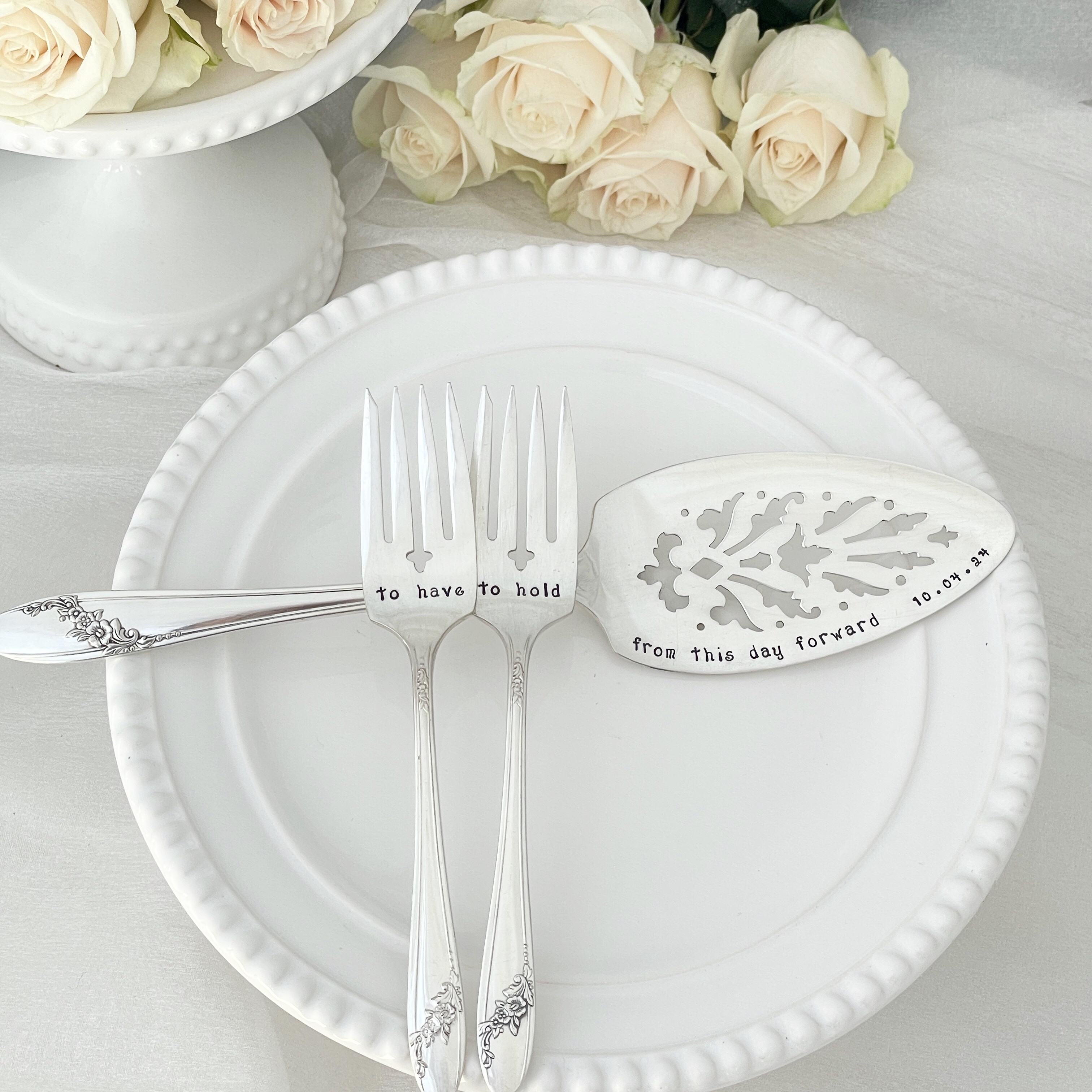To have & to hold, from this day forward. They may be the sweetest and most promising words spoken ❤️. Here, they are hand stamped into a vintage silverplate cake server and dessert forks to create a beautiful addition to the cake table - and a keepsake to be used for the many happy anniversaries and family celebrations to come. Each set will be unique as each is a genuine vintage item, most dating from the 1940s to the 1960s. There is space available on the cake server to further personalize it with your wedding date if you wish. The date will be in numerical format - ex. 9.24.2026. If you would like the date included, please add it in the personalization box.