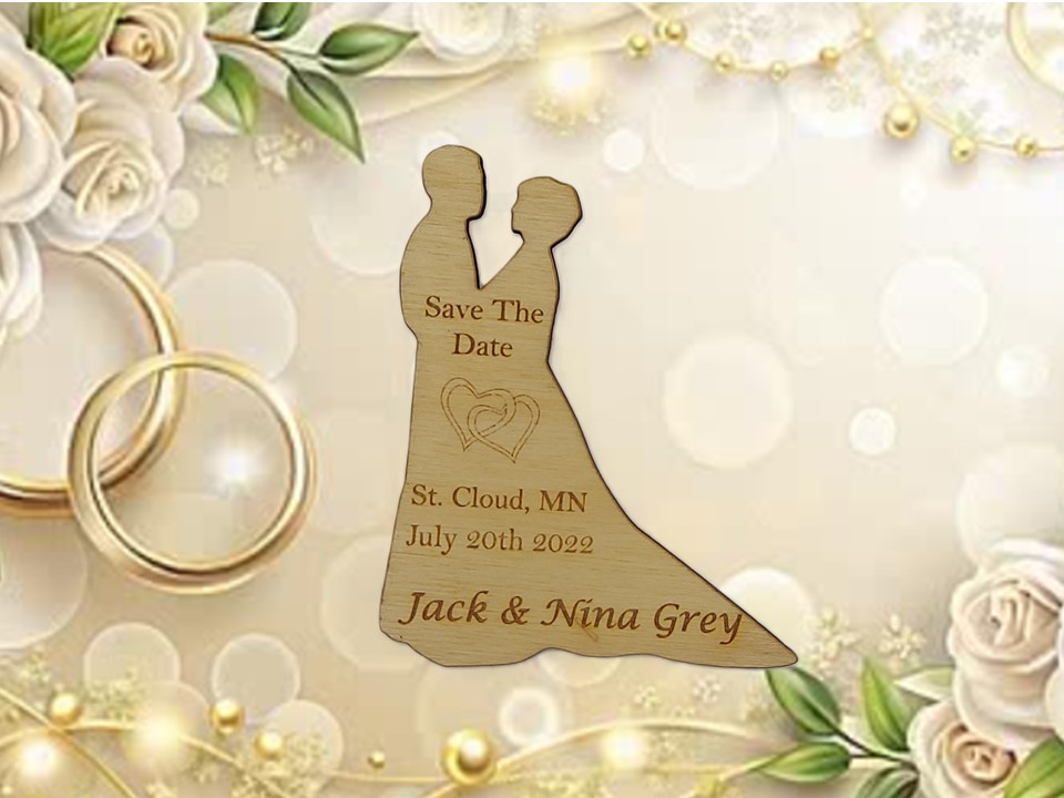 Make your wedding announcement unforgettable with these custom laser-cut wooden Save the Date magnets. Each magnet is precision-engraved with your names, wedding date, and design of your choice — a charming keepsake your guests will love displaying on their fridge.