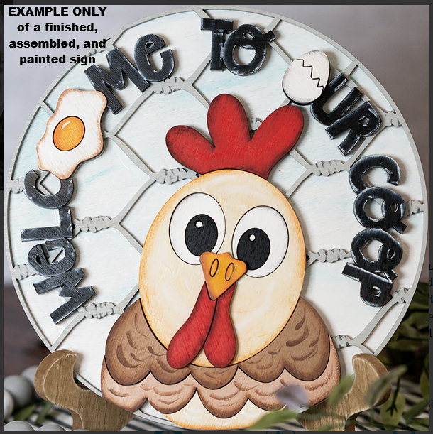 This is a chicken welcome DIY (Do It Yourself) wood sign craft paint kit. It says, "Welcome To Our Coop". The pieces are laser cut on 1/4 in & 1/8" inch thick wood. It does not stand up on its own. It does NOT have a hole for hanging. Glue NOT included. This is NOT a finished and completed sign. You assemble it, glue it together, and paint it yourself.