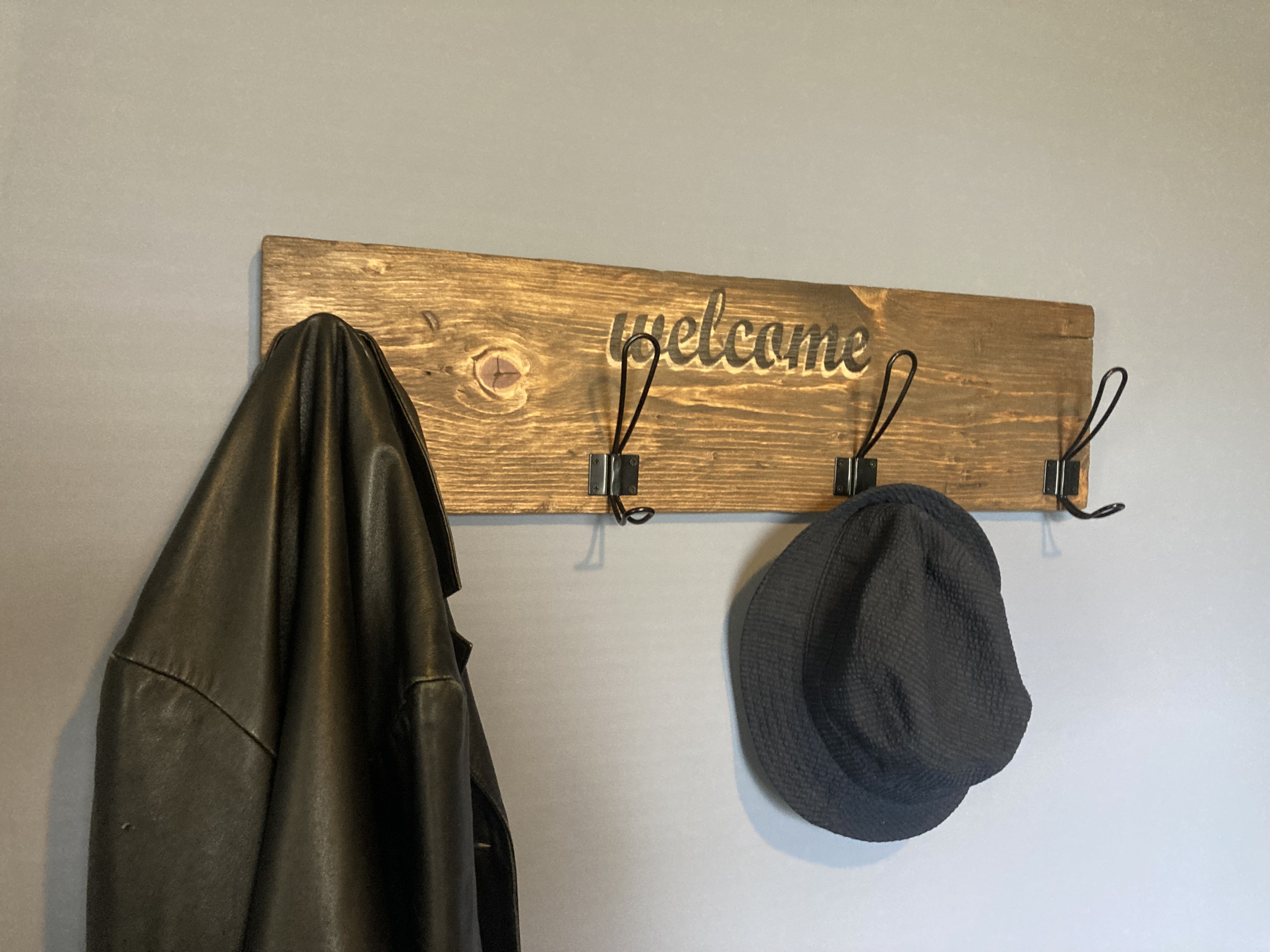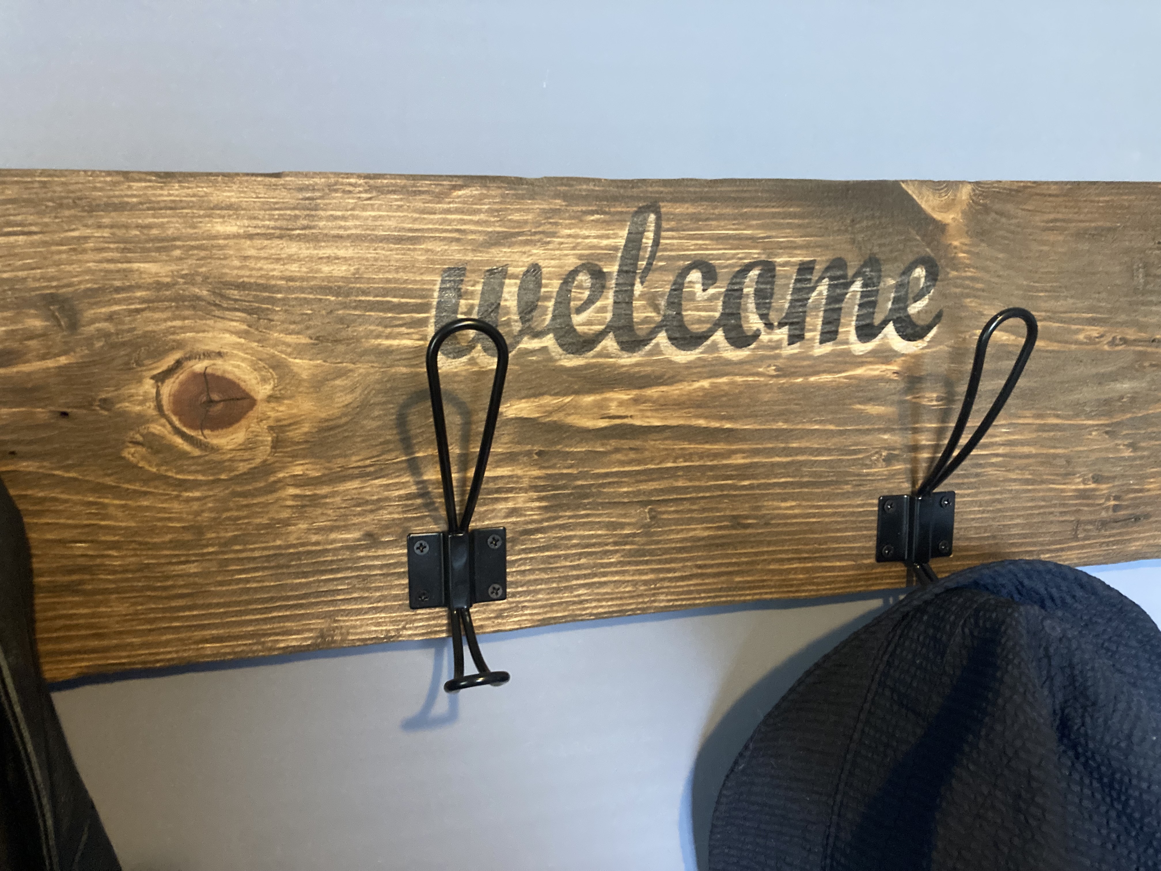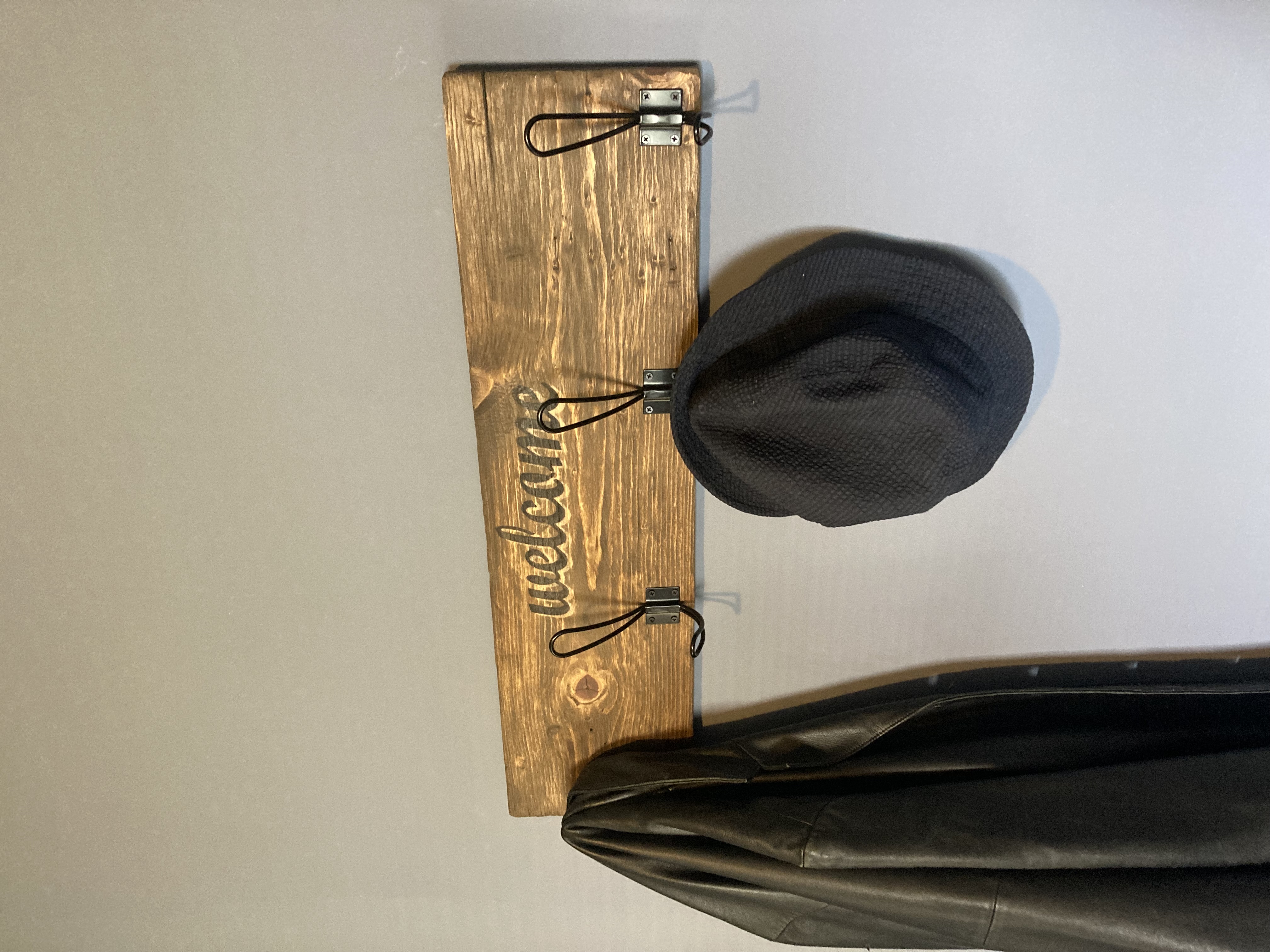 Hand distressed pine is created in the appropriate length stain is applied. Lettering is applied then the hooks are screwed on to the board.