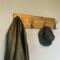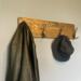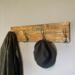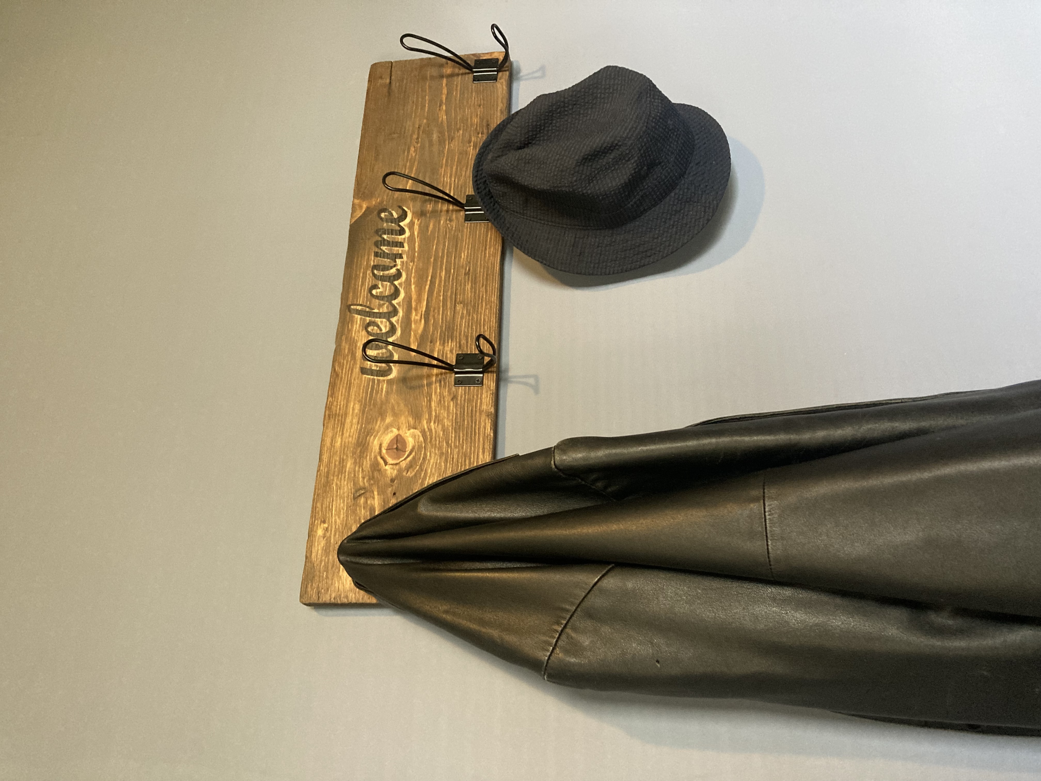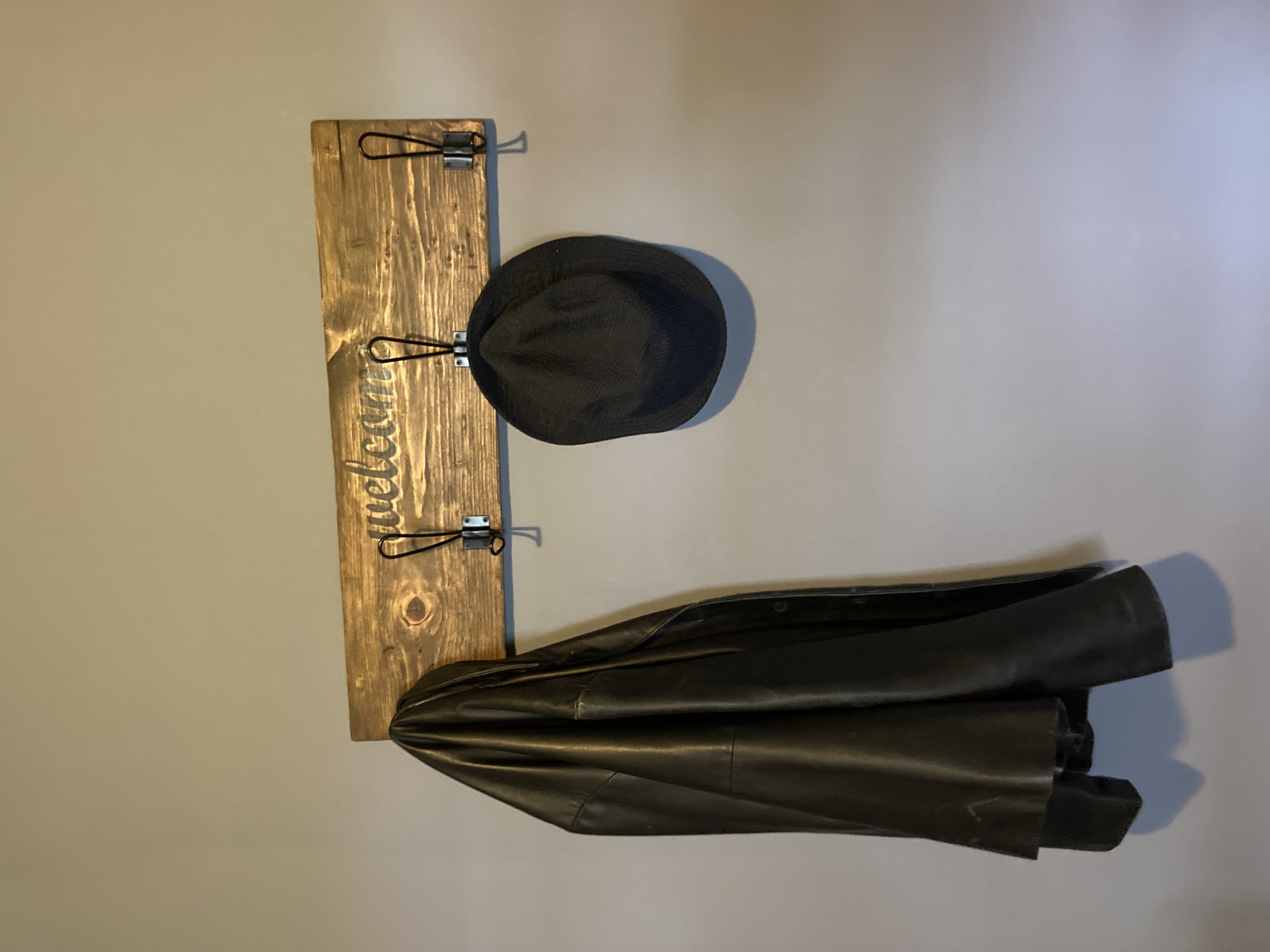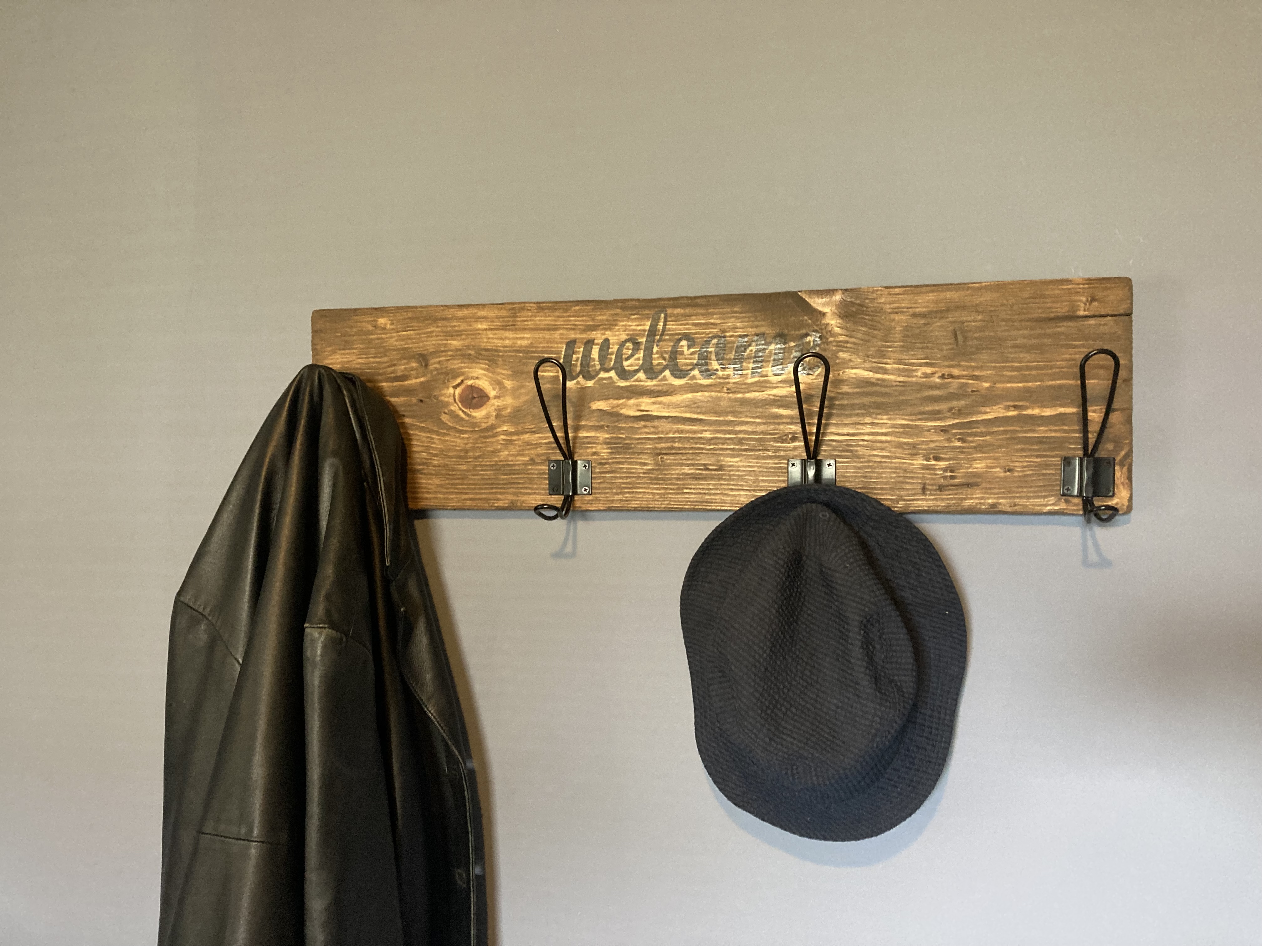 Hand distressed pine is created in the appropriate length stain is applied. Lettering is applied then the hooks are screwed on to the board.
