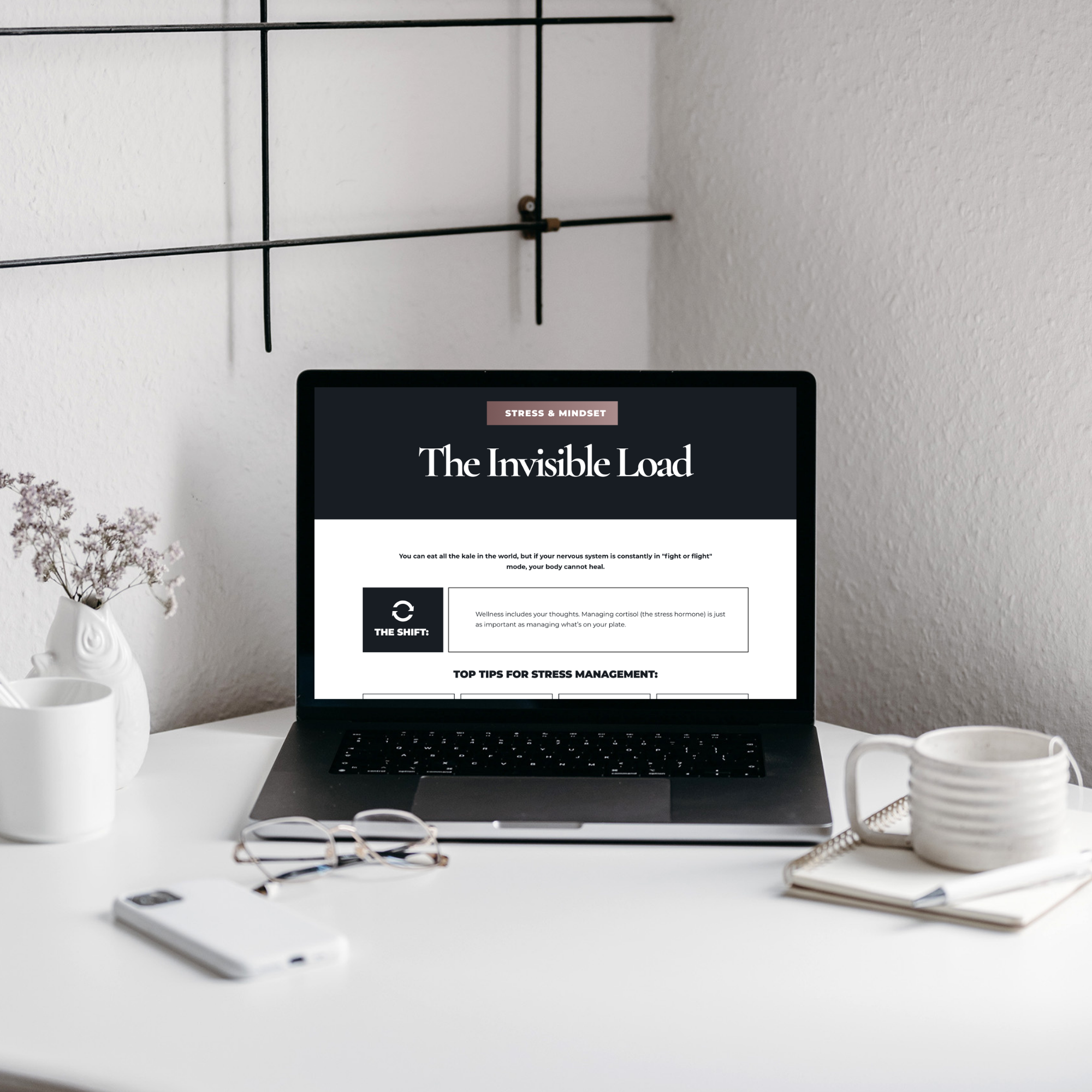 Inside the ebook, readers learn about the Four Pillars of Wellness — nutrition, movement, rest, and mindset — plus common roadblocks and how coaching provides structure, accountability, and support.