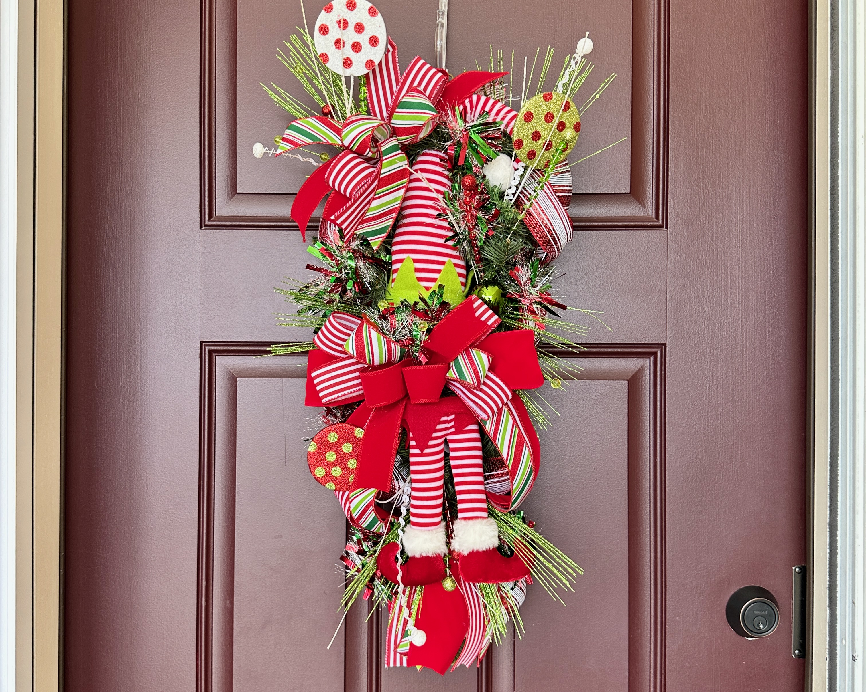 Bring cheerful holiday magic to your home with this whimsical red and green Christmas Elf Door Swag for your front door or entry way.