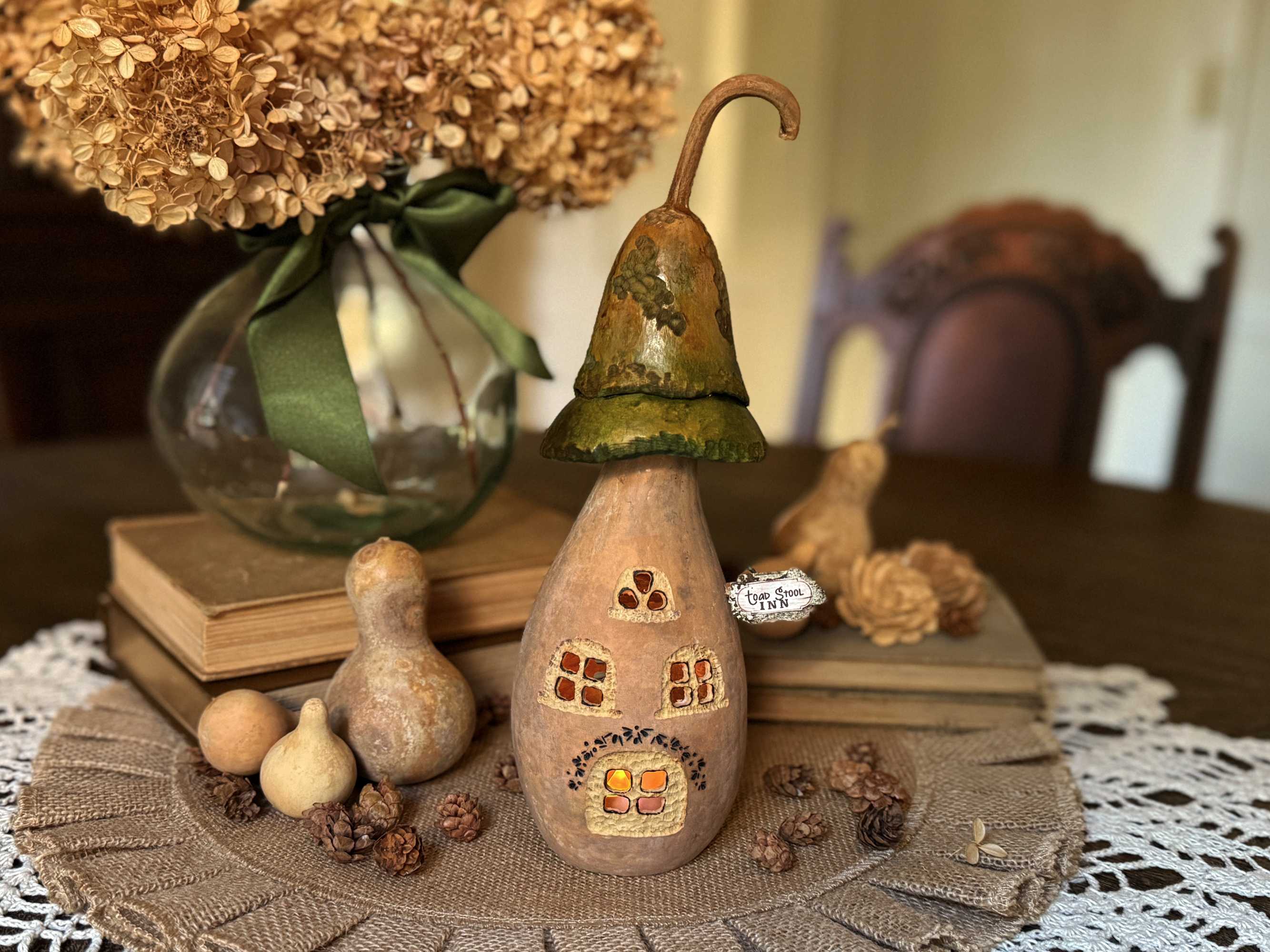 A whimsical, one-of-a-kind mushroom house made entirely by hand from a real dried gourd. This enchanting little inn features a curved chimney stem, forest-green mushroom cap, hand-carved glowing windows, and even a miniature wooden sign—all crafted by hand, including the sign itself!