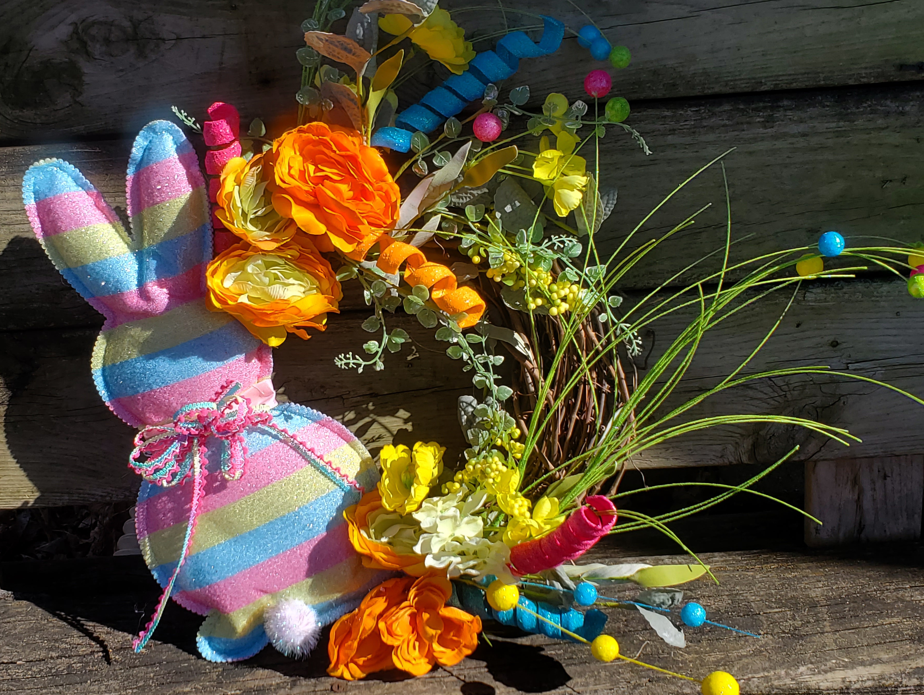 Brighten your front door with a 12 inch grapevine wreath with a colorful striped bunny. Whimsical glitter multi color corkscrew and colorful foam balls. Beautiful ombre orange to yellow flowers with a dainty yellow flower intermingled. Will last year after yearif stored properly.