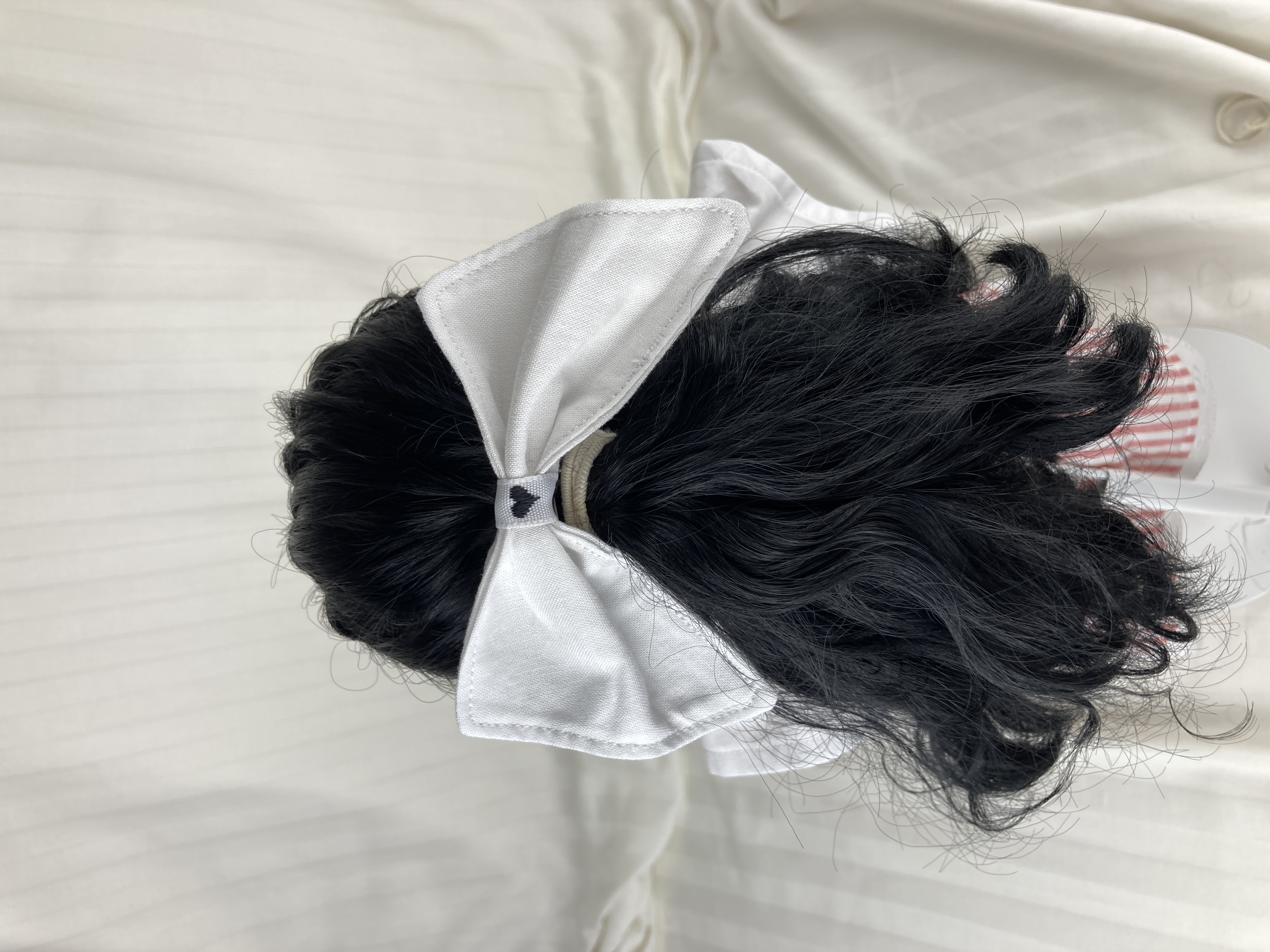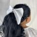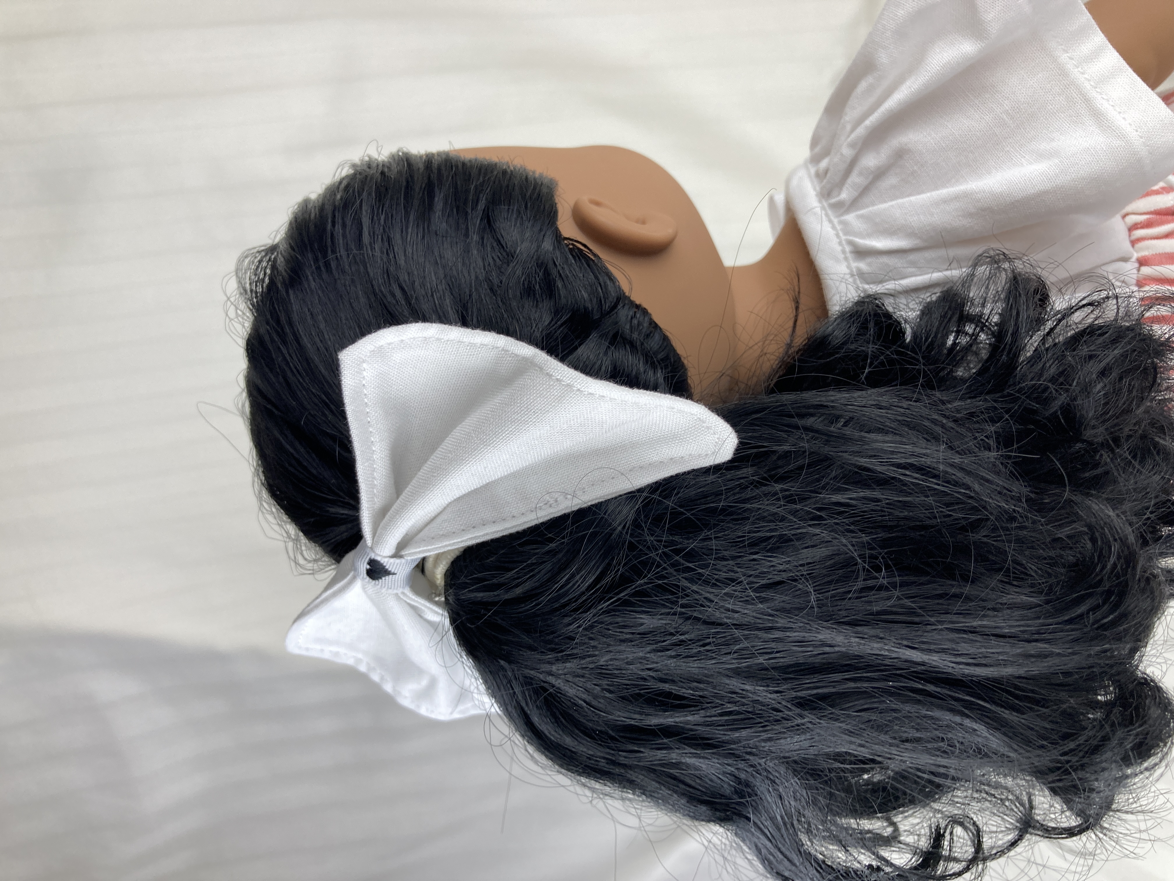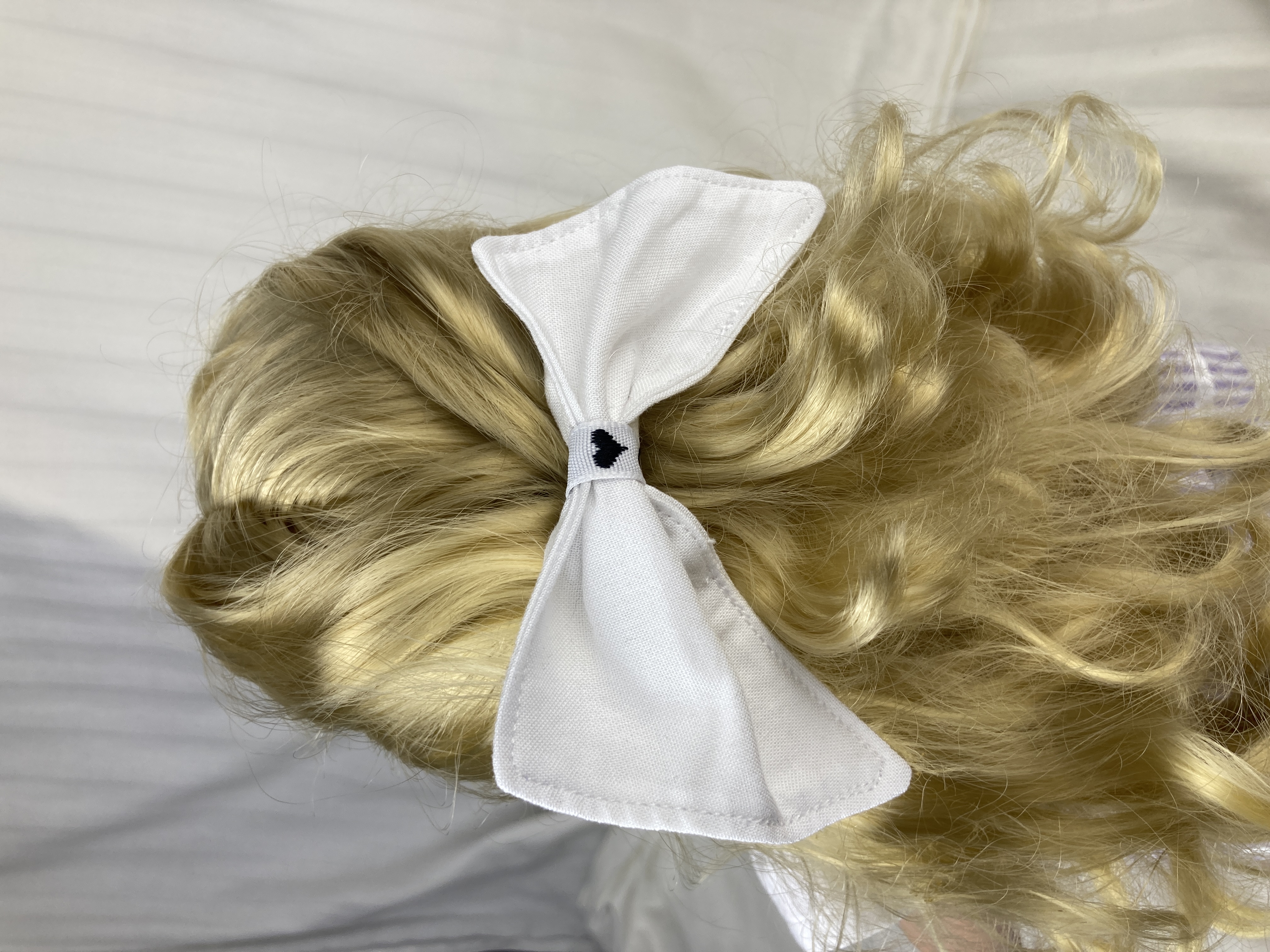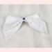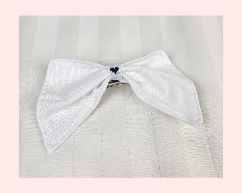This hair bow for 18 inch dolls measures: 4" at the top, 4.5" at the bottom, and 2.5" at its deepest point. It is made from white cotton fabric and black and white heart ribbon attached to a metal barrette. The perfect accessory for your doll's outfits! Also great for small gifts, non-candy Valentine's Day gifts, and stocking stuffers!
