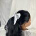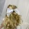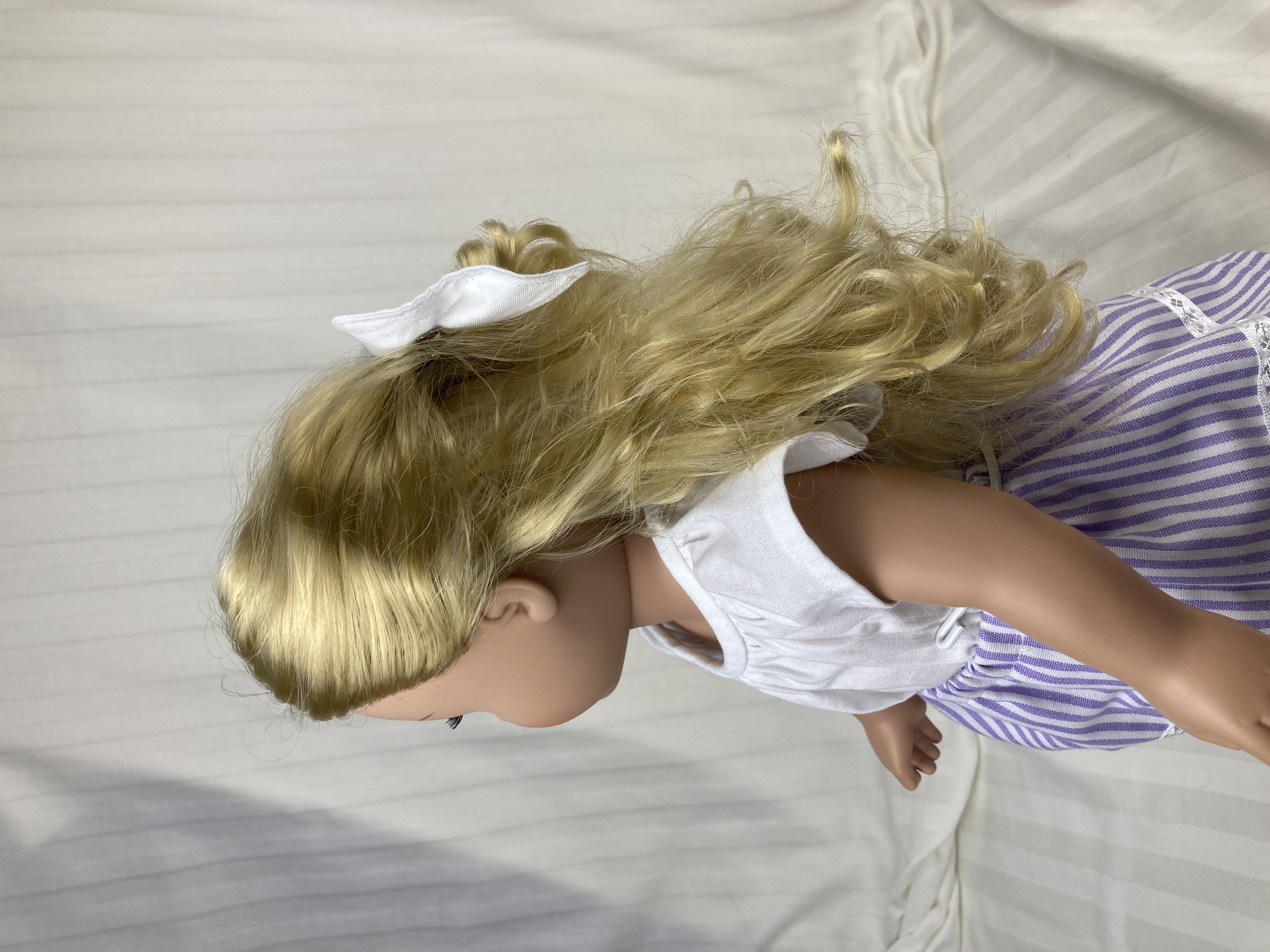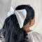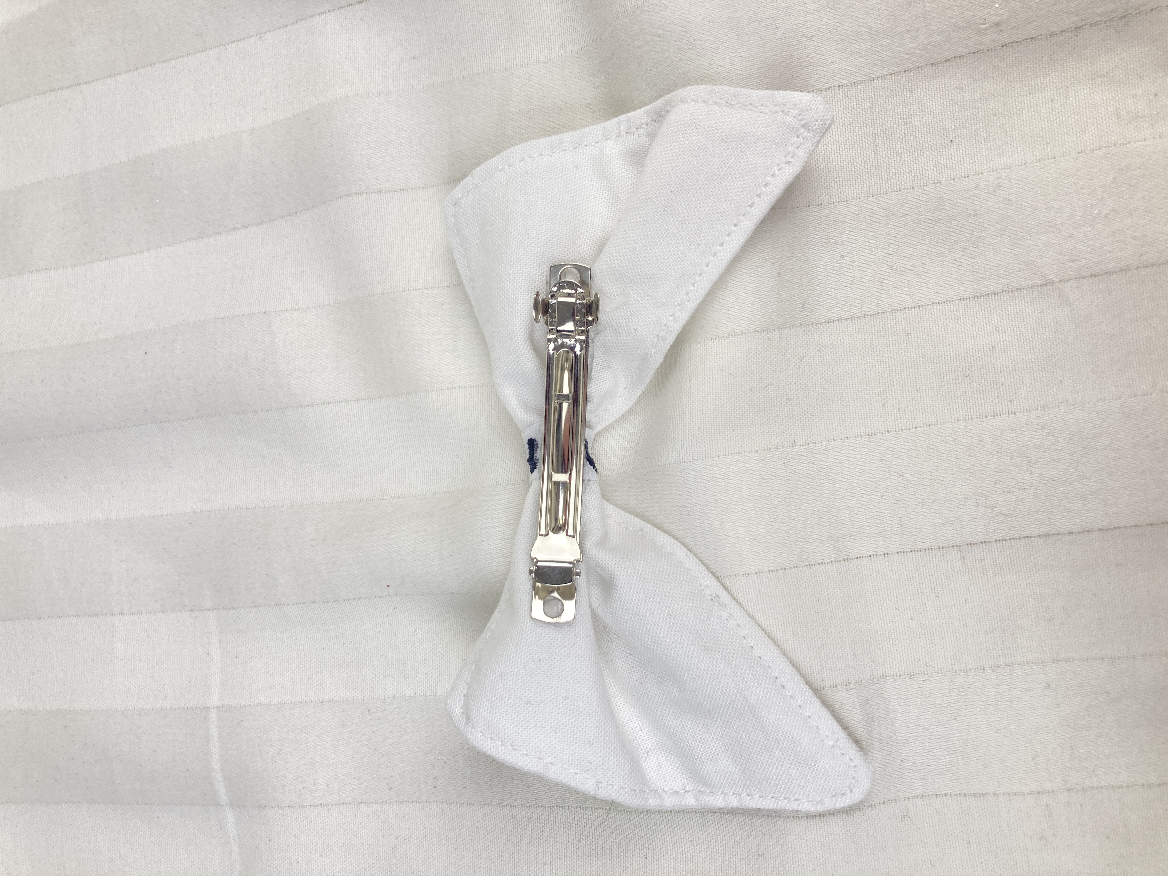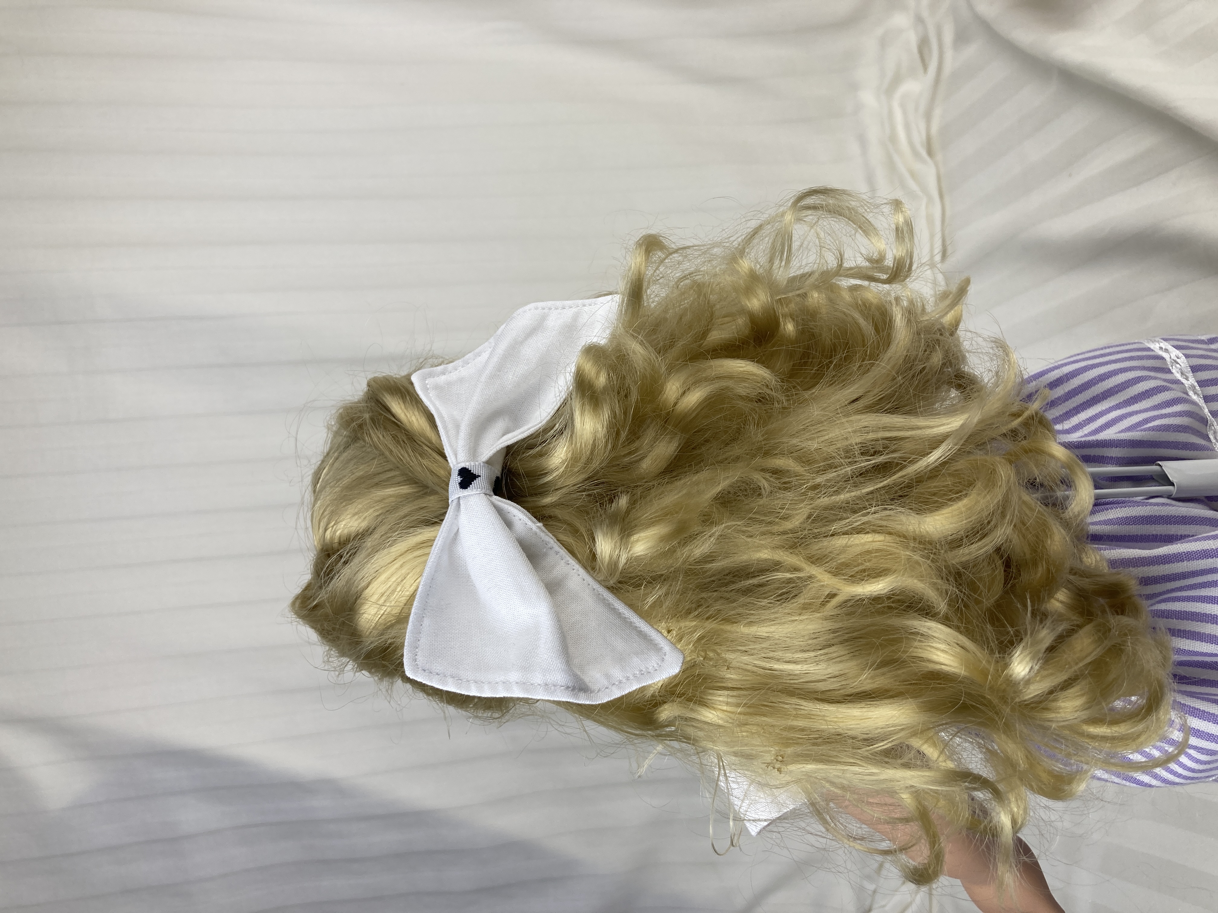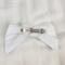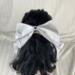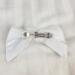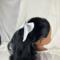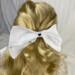 This hair bow for 18 inch dolls measures: 4" at the top, 4.5" at the bottom, and 2.5" at its deepest point. It is made from white cotton fabric and black and white heart ribbon attached to a metal barrette. The perfect accessory for your doll's outfits! Also great for small gifts, non-candy Valentine's Day gifts, and stocking stuffers!
