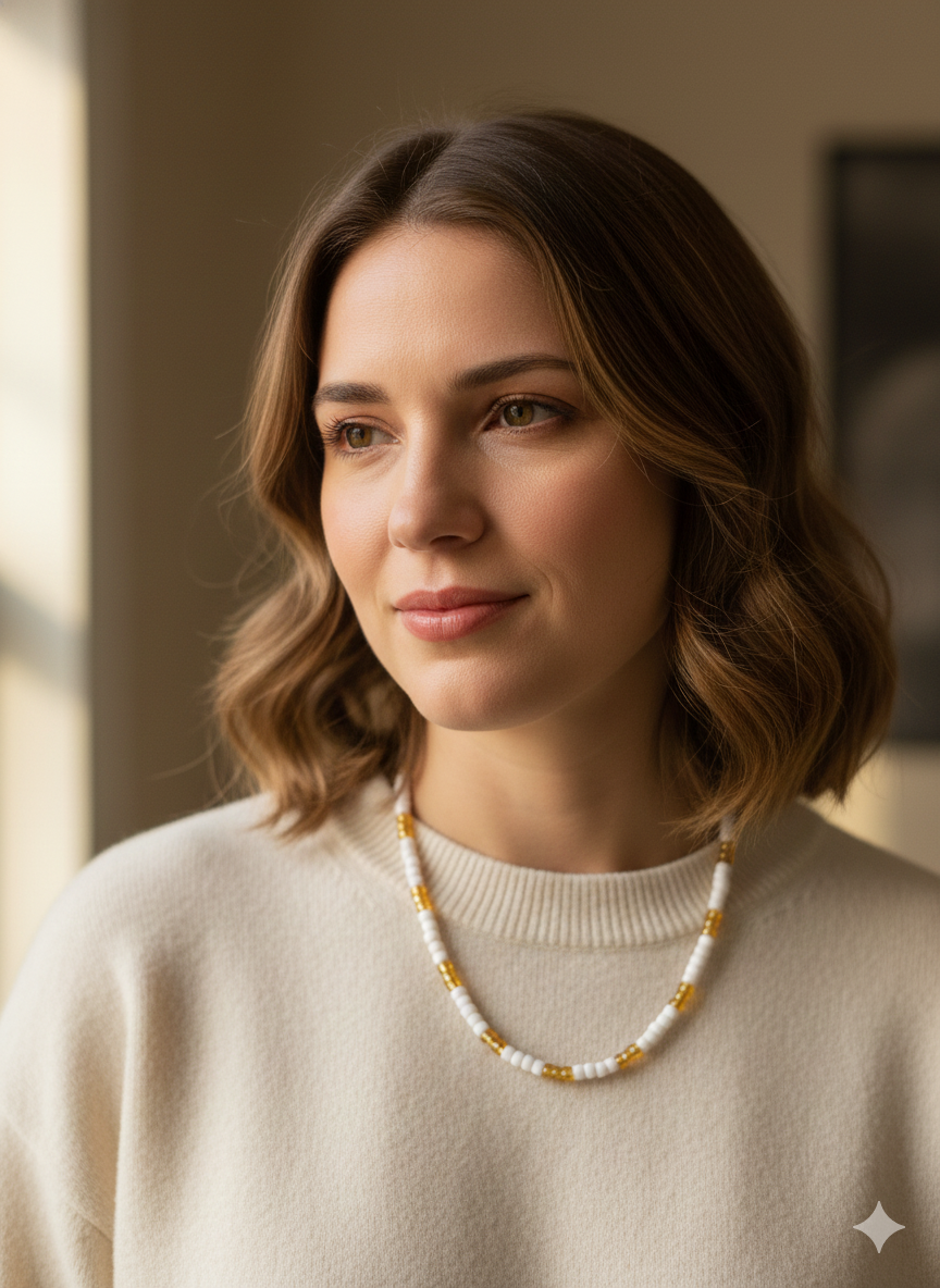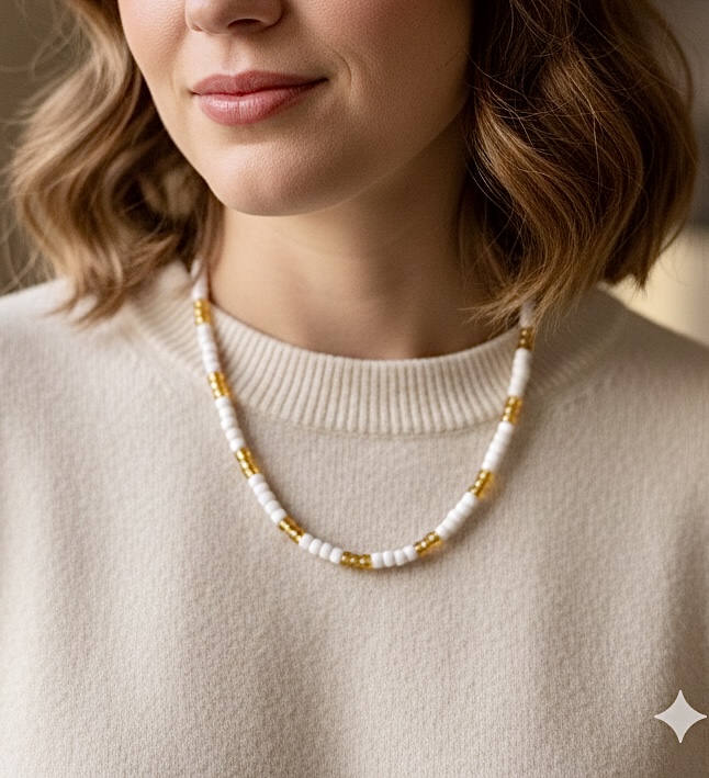 This simple and versatile necklace features delicate white and gold seed beads, perfect for adding a subtle touch of charm to any outfit. Handcrafted with care, the design alternates between shimmering gold and pristine white beads, creating a beautiful contrast that catches the light.