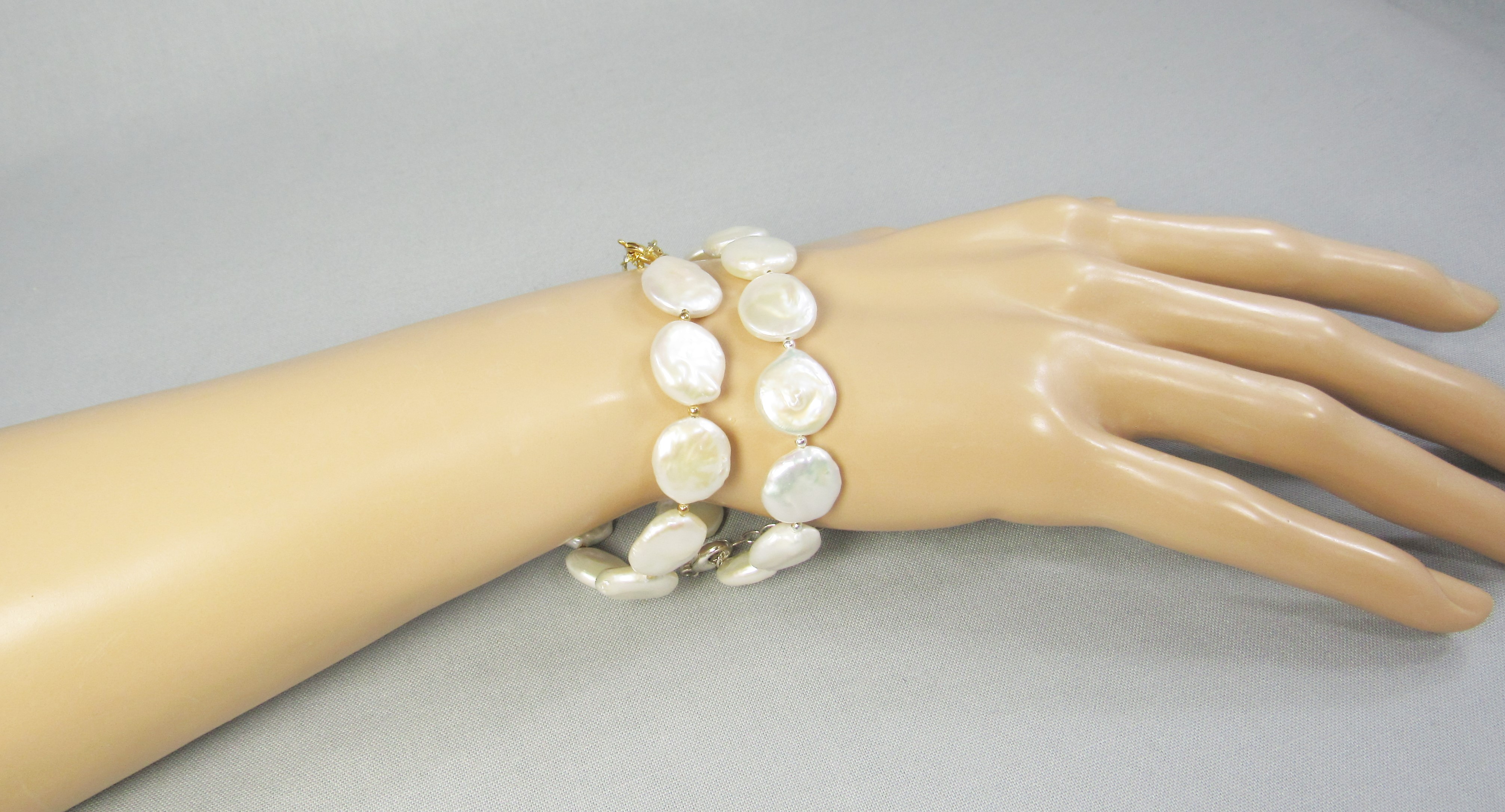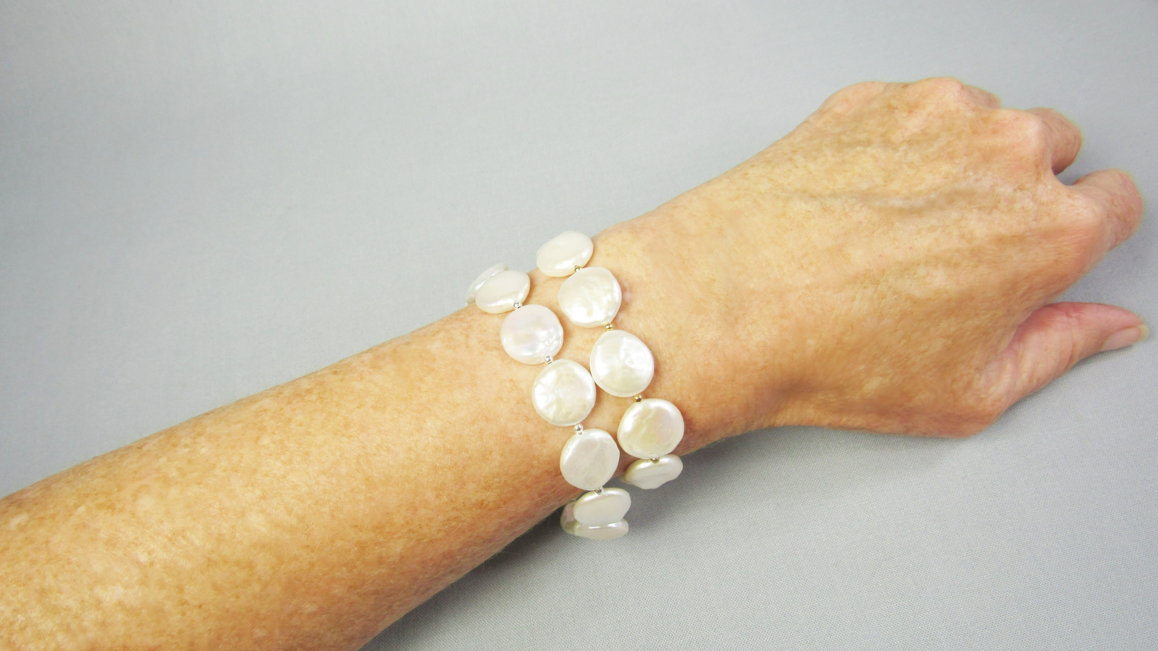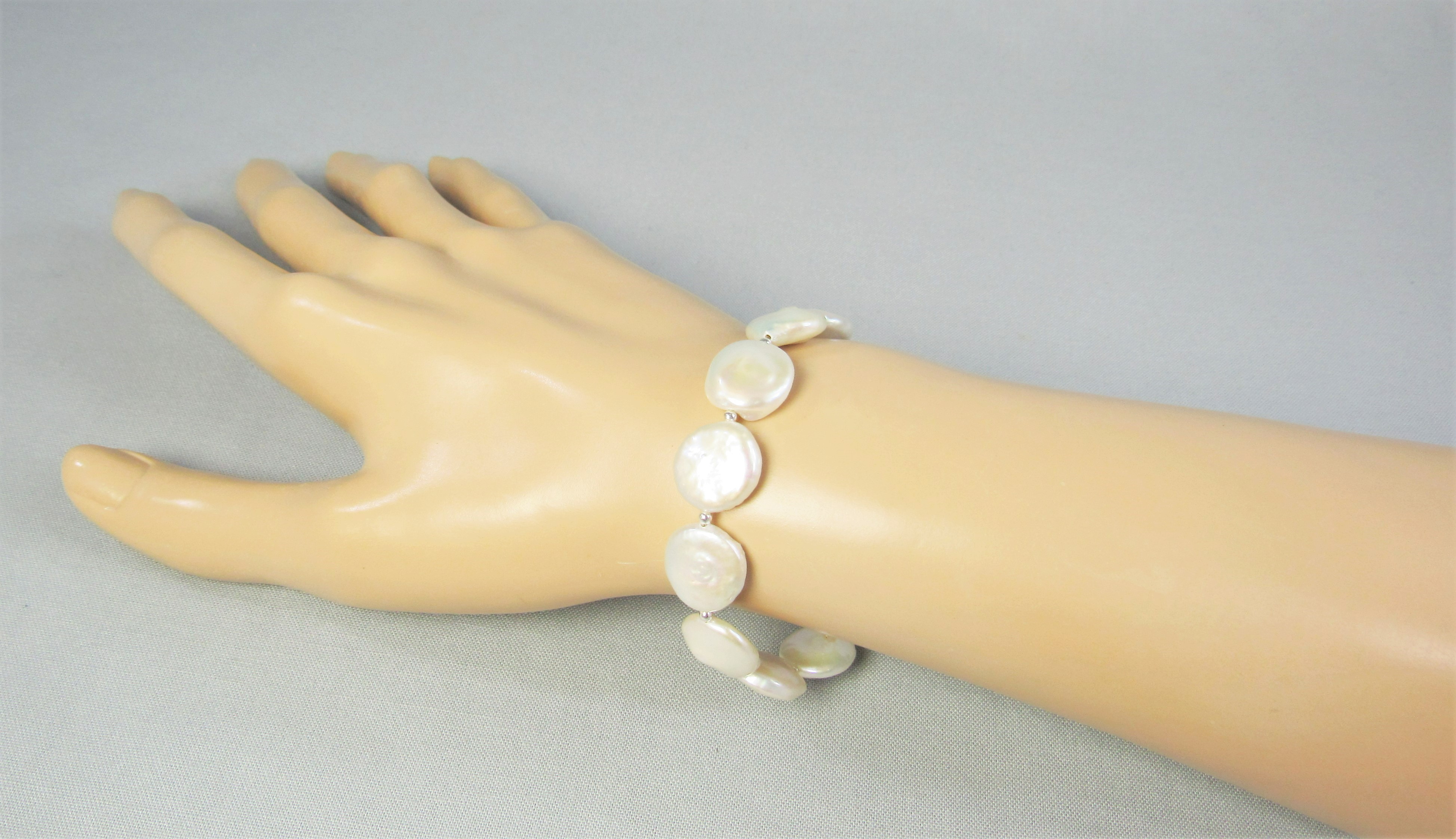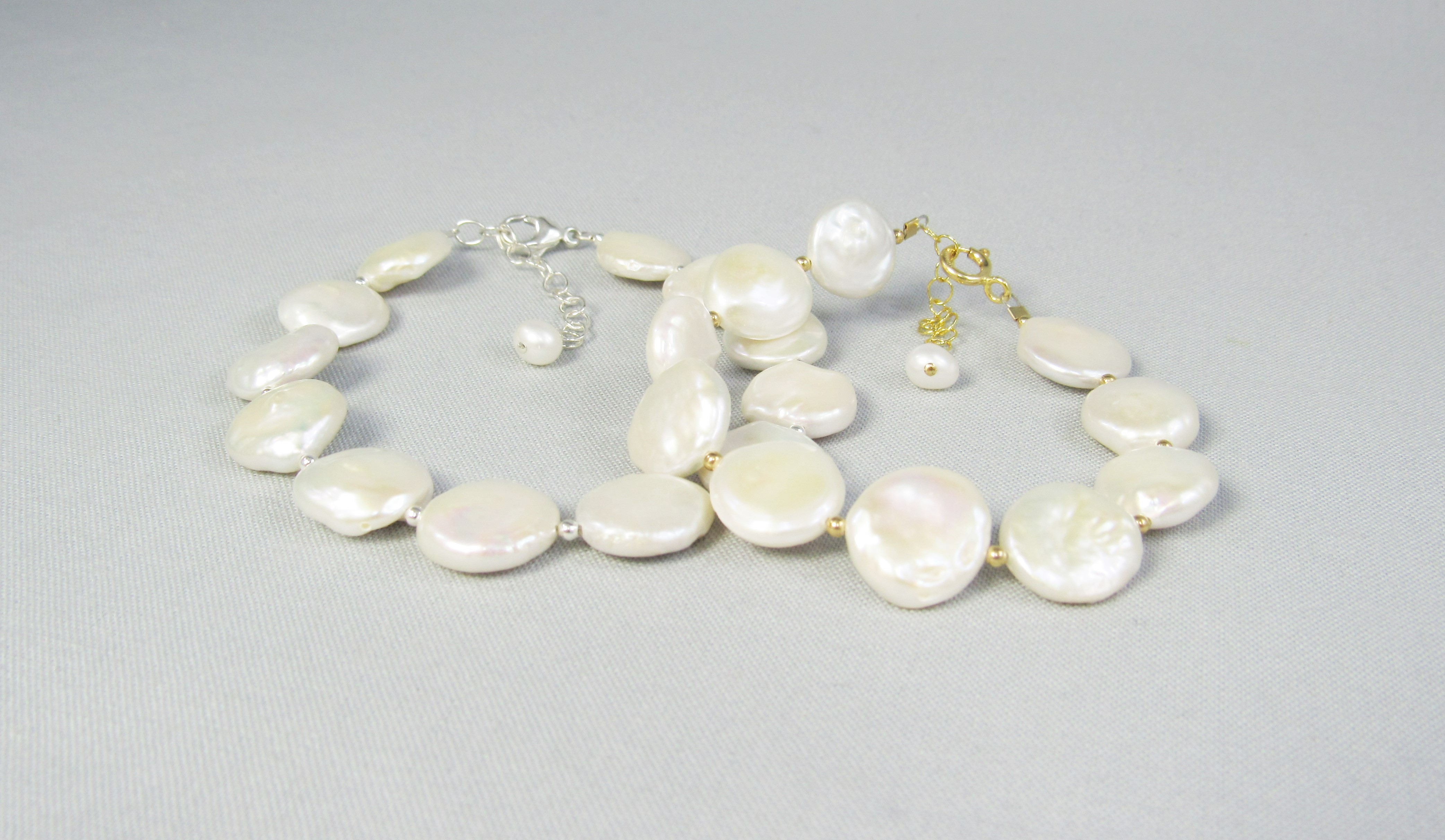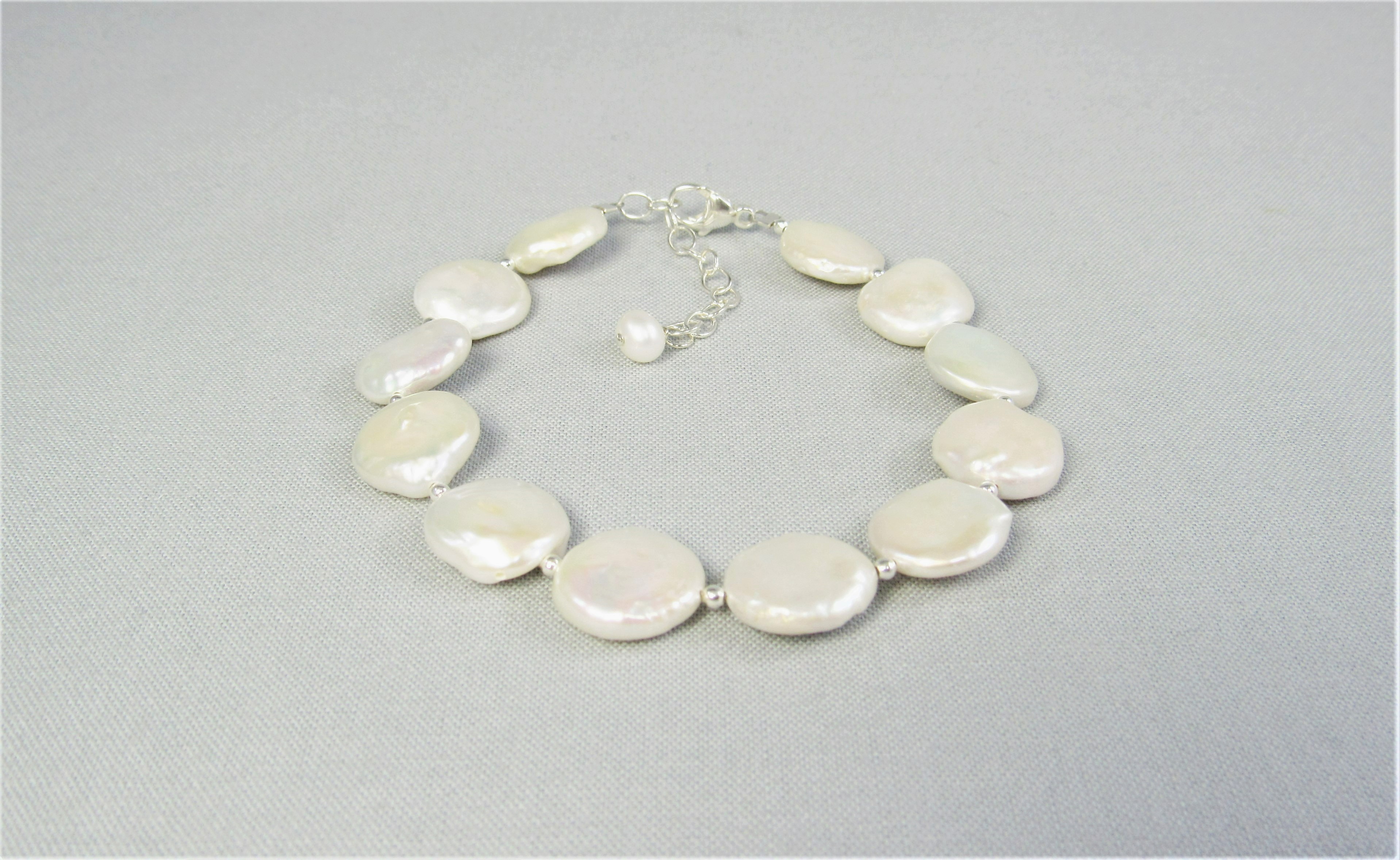 Incredibly lustrous genuine white freshwater pearl coins alternating with tiny polished sterling silver or 14k gold filled beads creating a bracelet any woman would love to wear! The bracelet is finished with a clasp of your choice (spring ring or lobster) and an adjustable chain. All metal components are either 925 sterling silver or 14k gold fill.