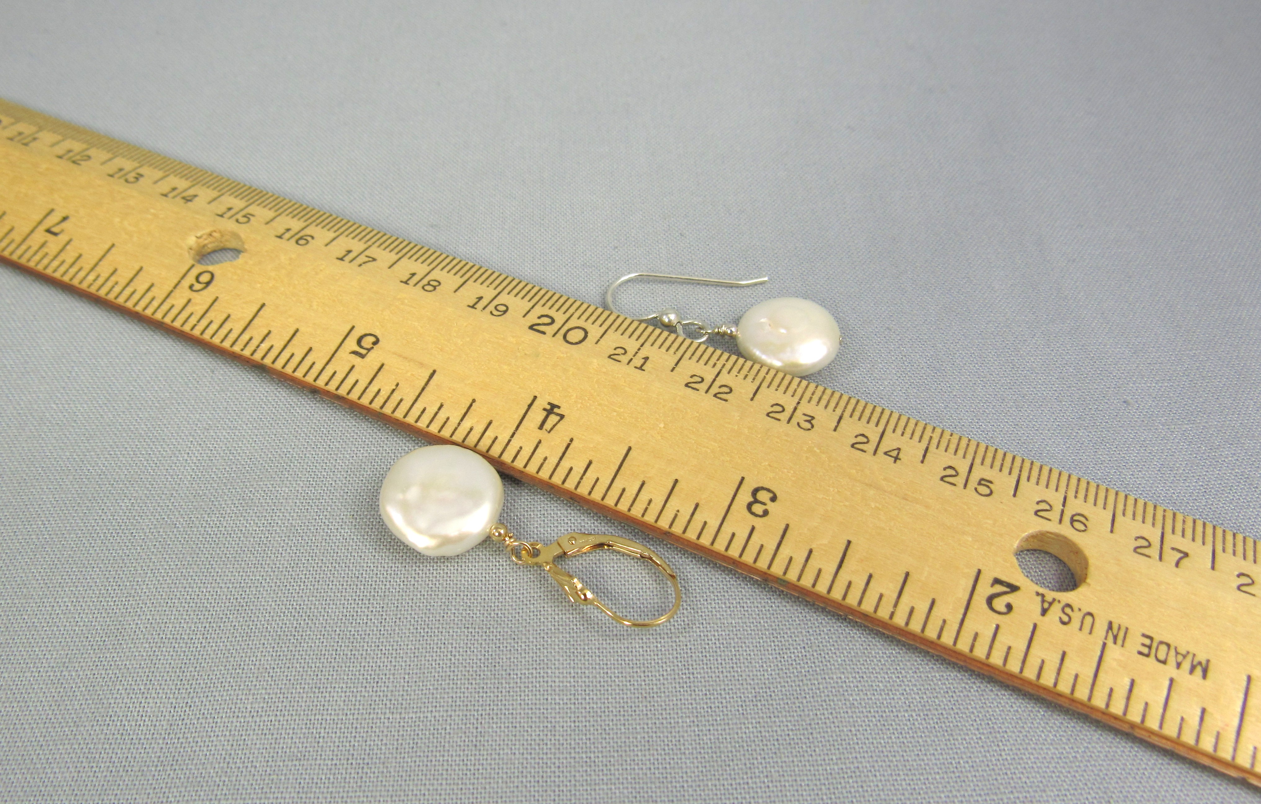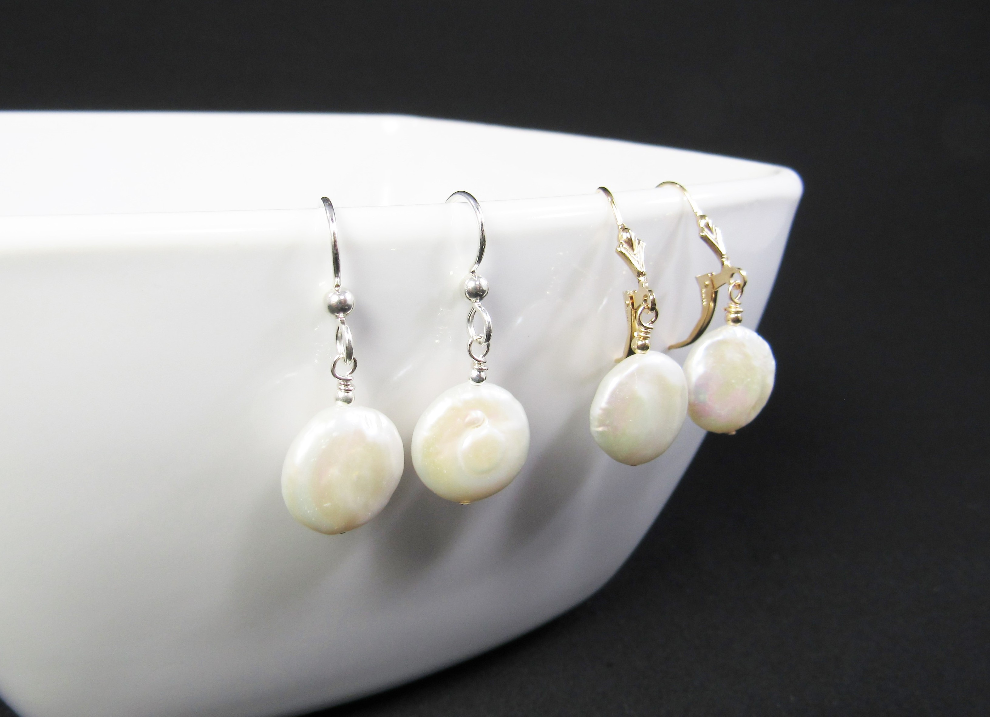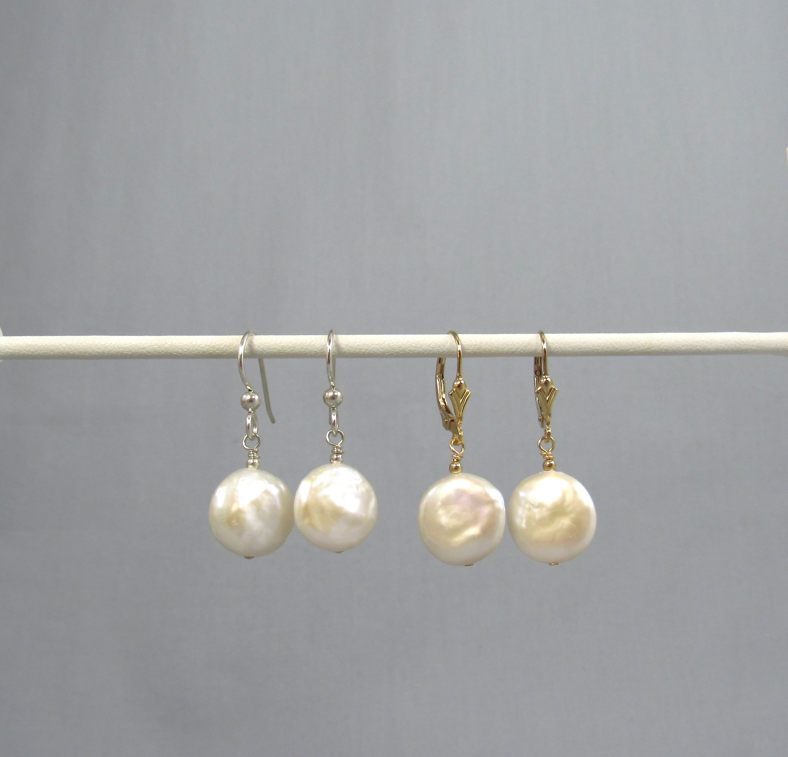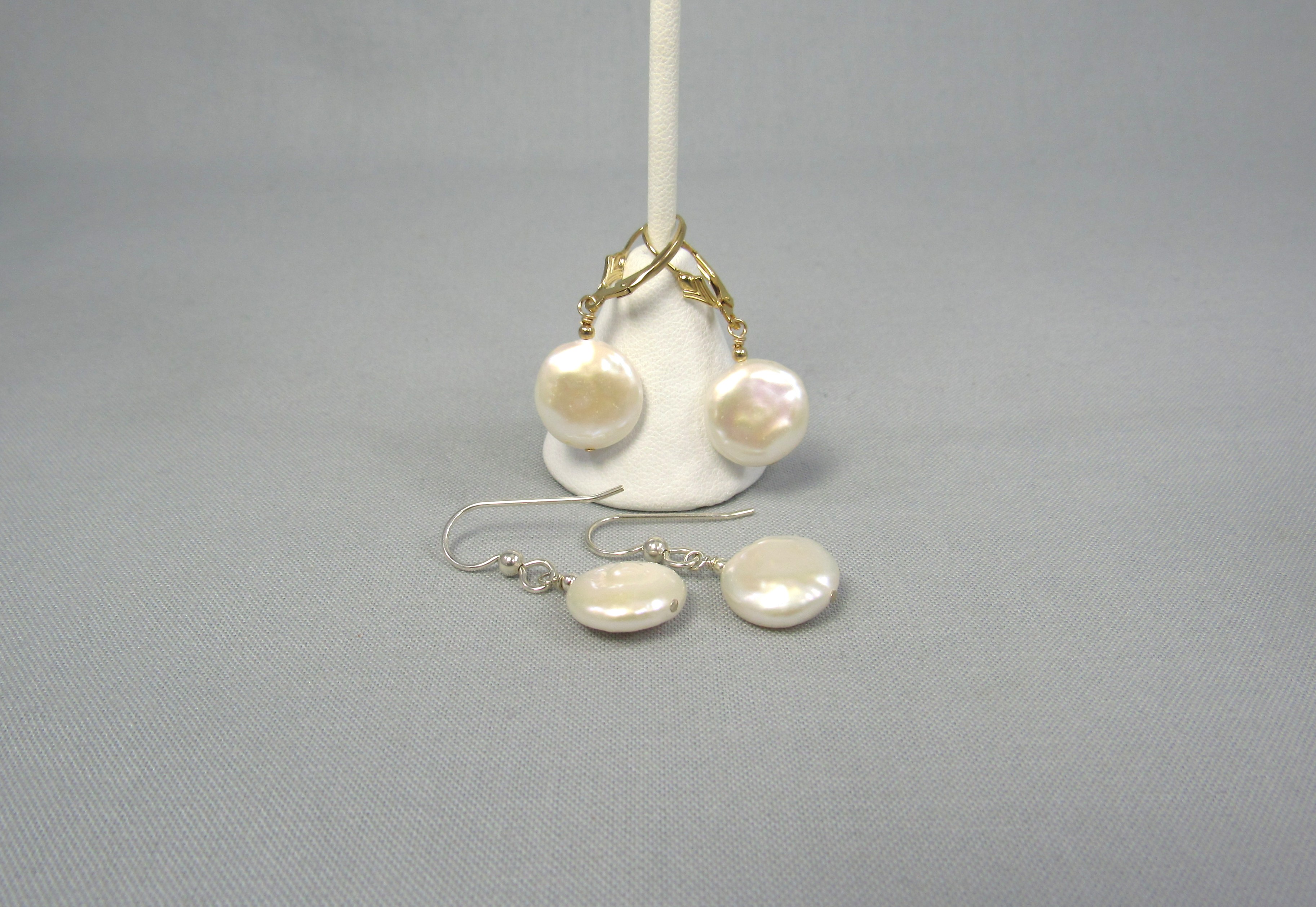 Simply beautiful white pearl coins dangle beneath your preferred style of ear wires -- sterling silver or 14K gold fill, hooks or leverbacks. These short drop earrings feature 14 mm lustrous real freshwater cultured pearls. They are perfect for young girls and women of all ages. Pearls are a timeless classic which will be worn and passed down to loved ones.