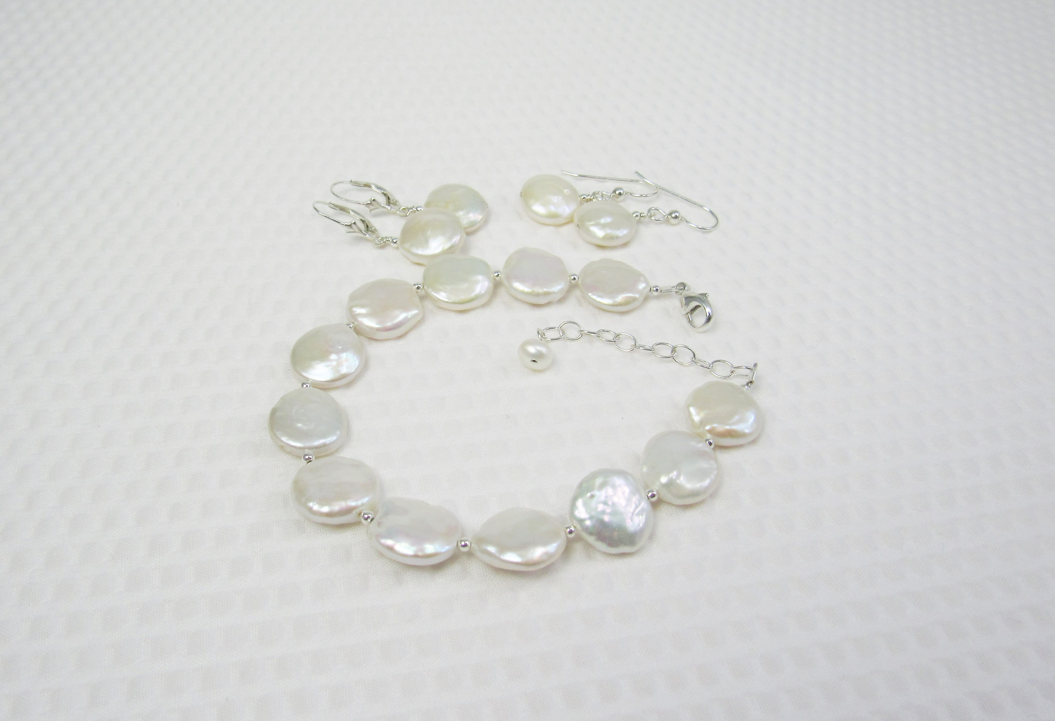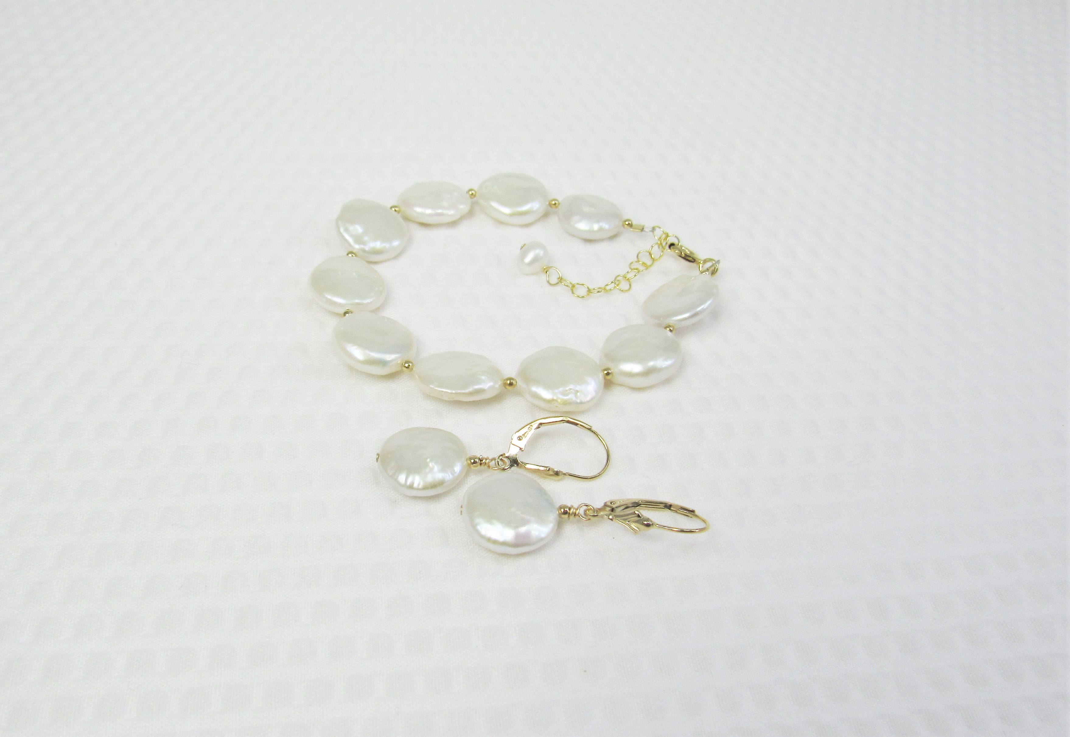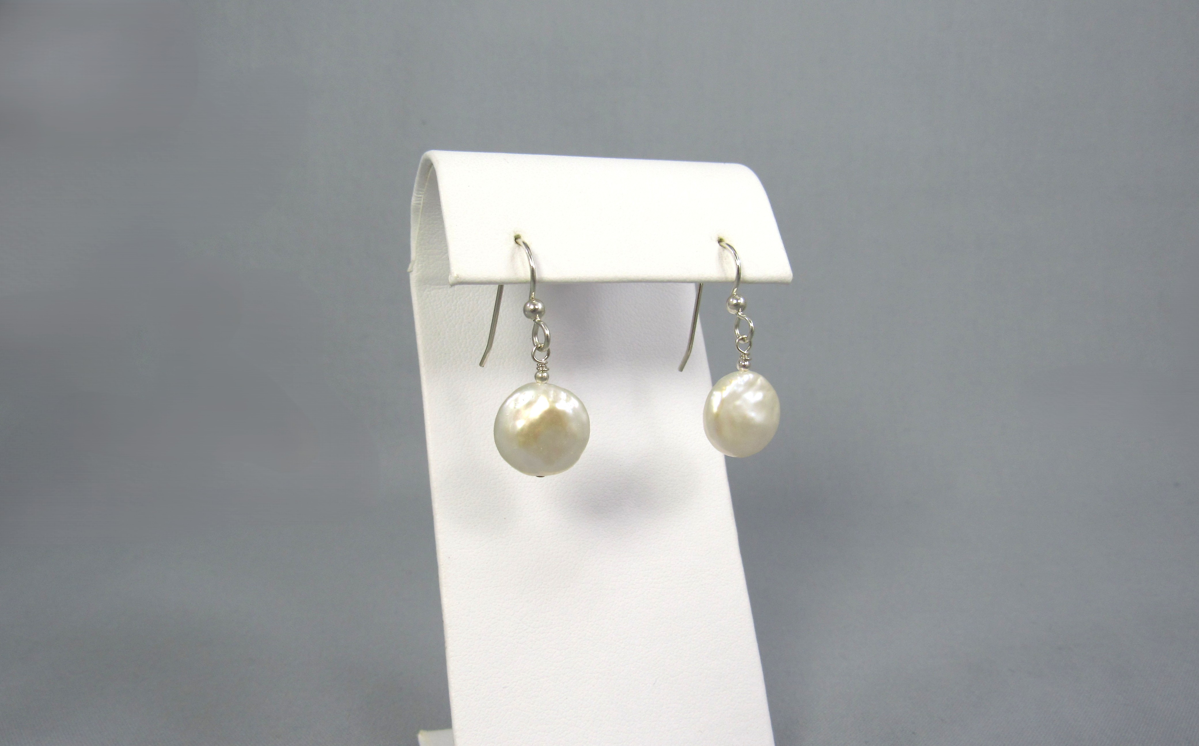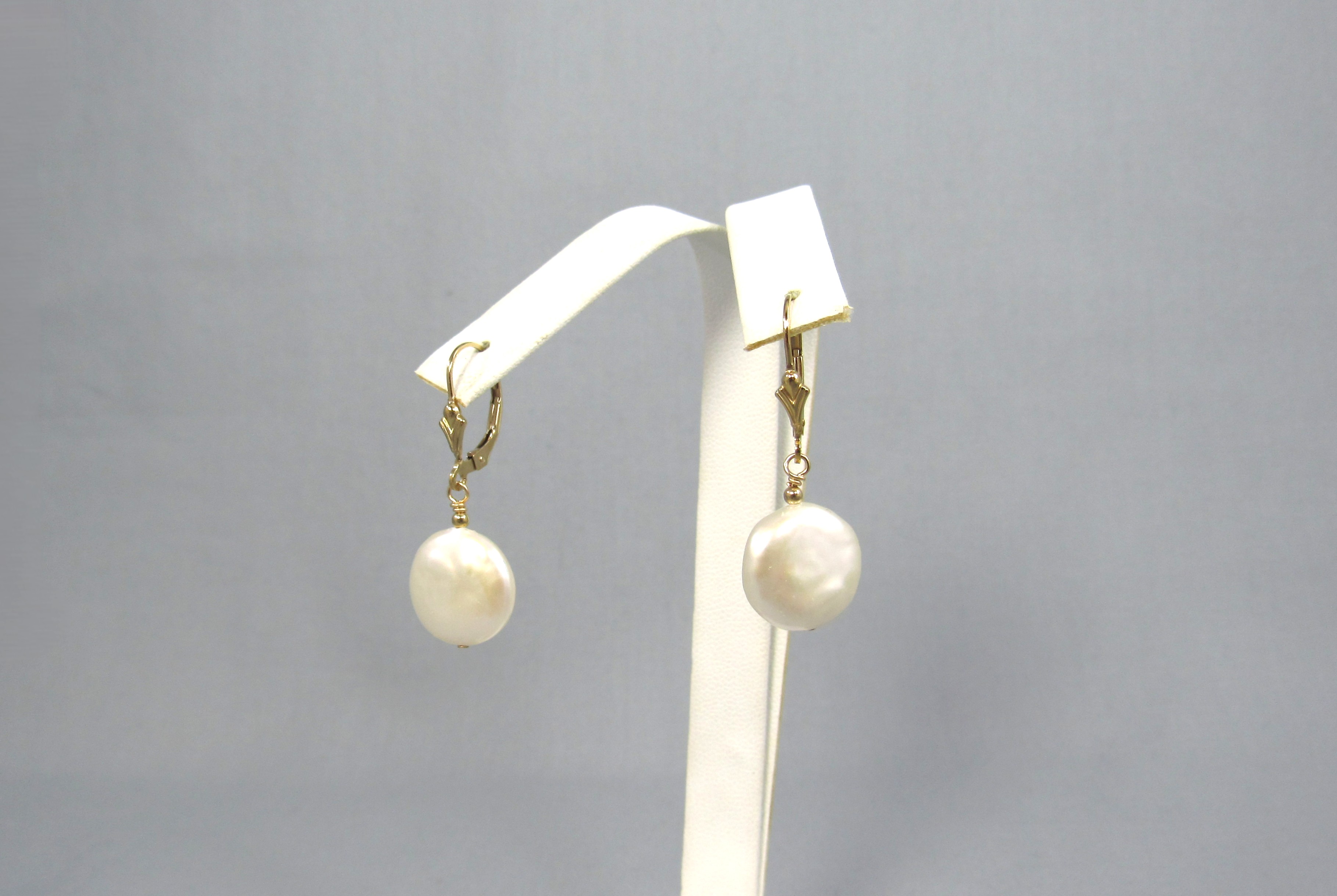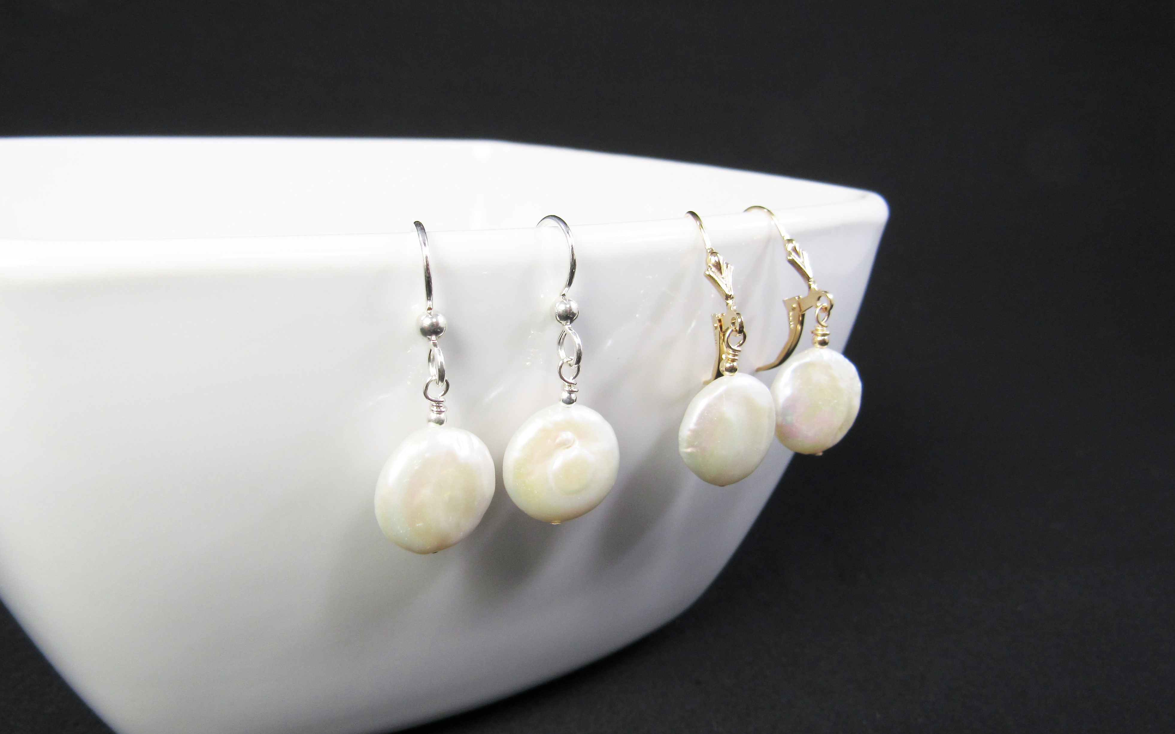 Simply beautiful white pearl coins dangle beneath your preferred style of ear wires -- sterling silver or 14K gold fill, hooks or leverbacks. These short drop earrings feature 14 mm lustrous real freshwater cultured pearls. They are perfect for young girls and women of all ages. Pearls are a timeless classic which will be worn and passed down to loved ones.