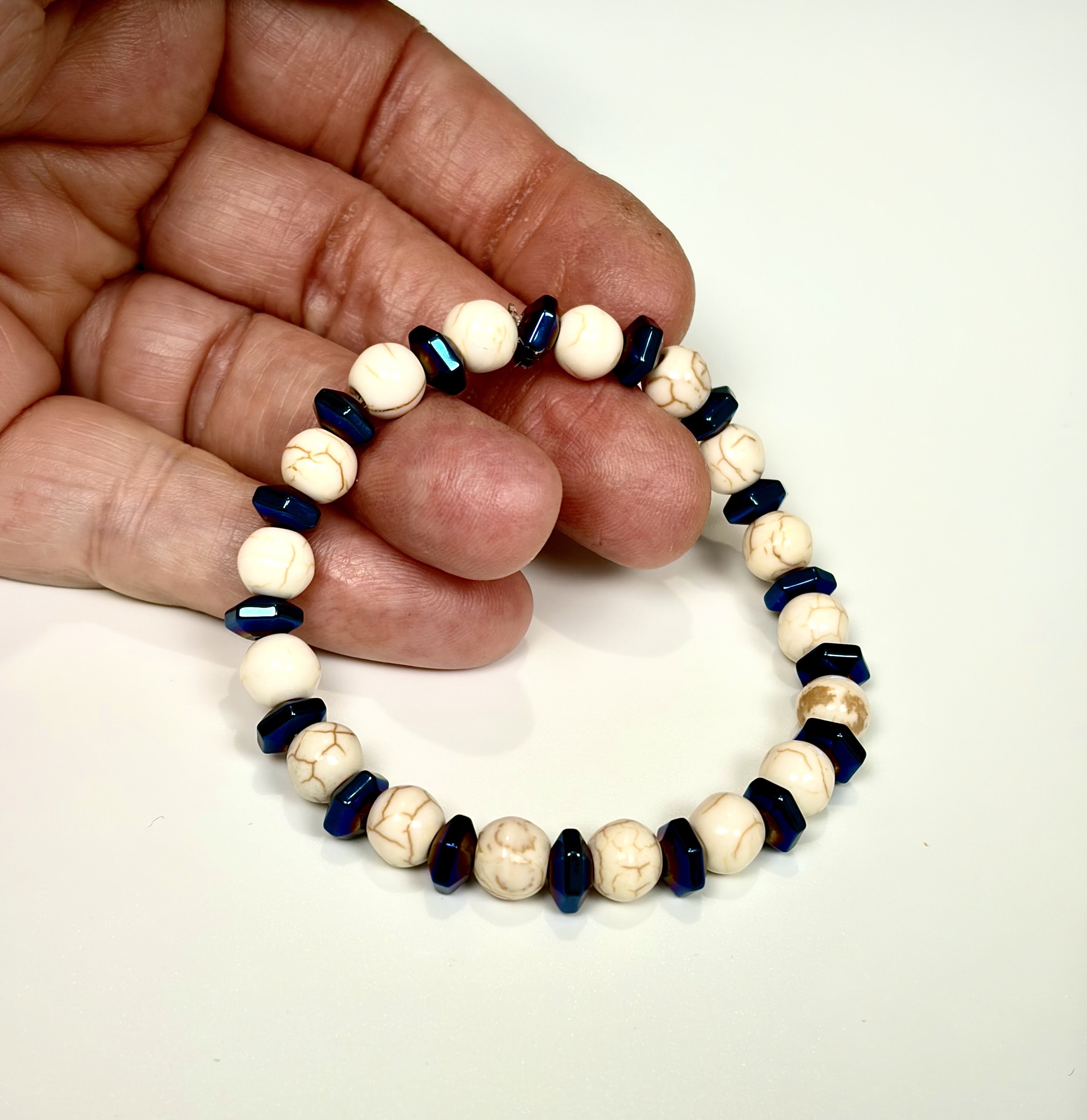 • Materials: Authentic White Howlite (8mm round) and faceted Blue-plated Hematite spacers.