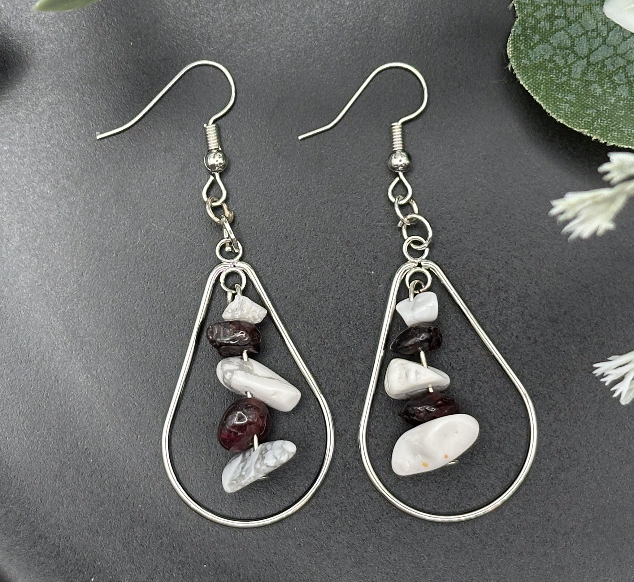 Add a touch of elegance to your look with these stunning white howlite and garnet drop earrings! Each pair features natural gemstones that shimmer beautifully in the light, making them the perfect accessory for any occasion.