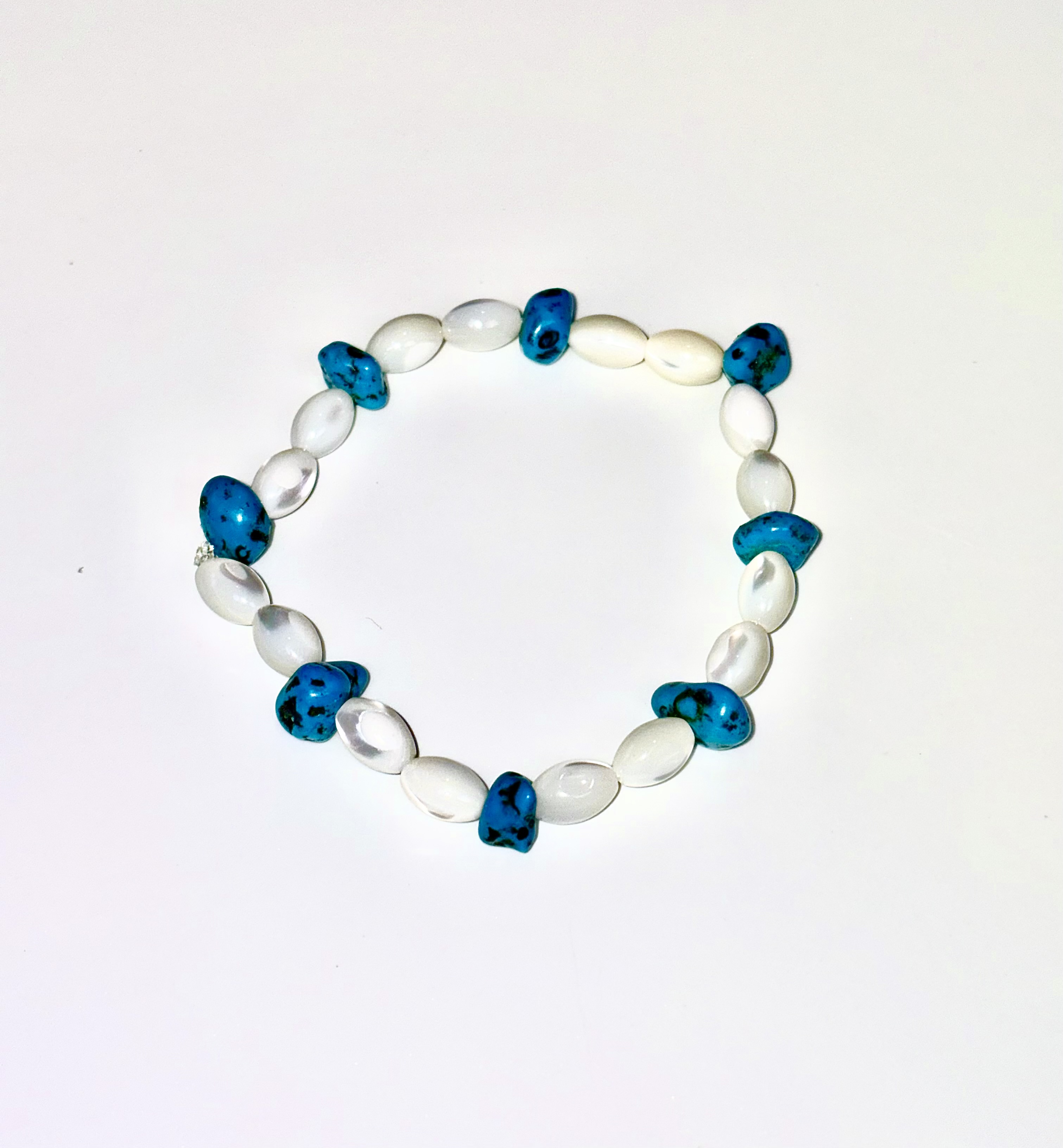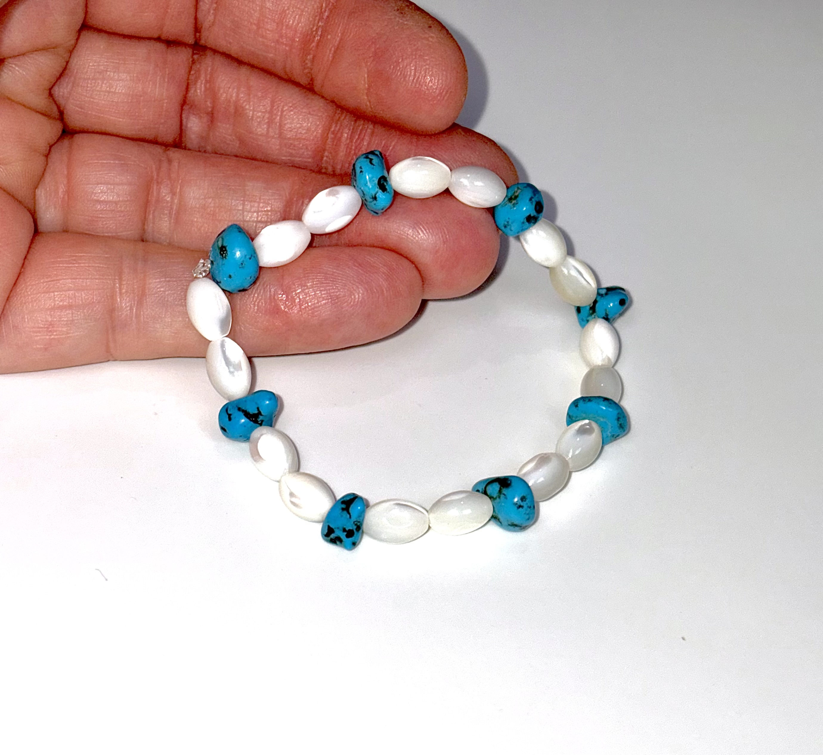 This beautiful stretch bracelet captures a perfect blend of oceanic elegance and southwestern flair. It features a continuous design alternating between two distinct types of beads: