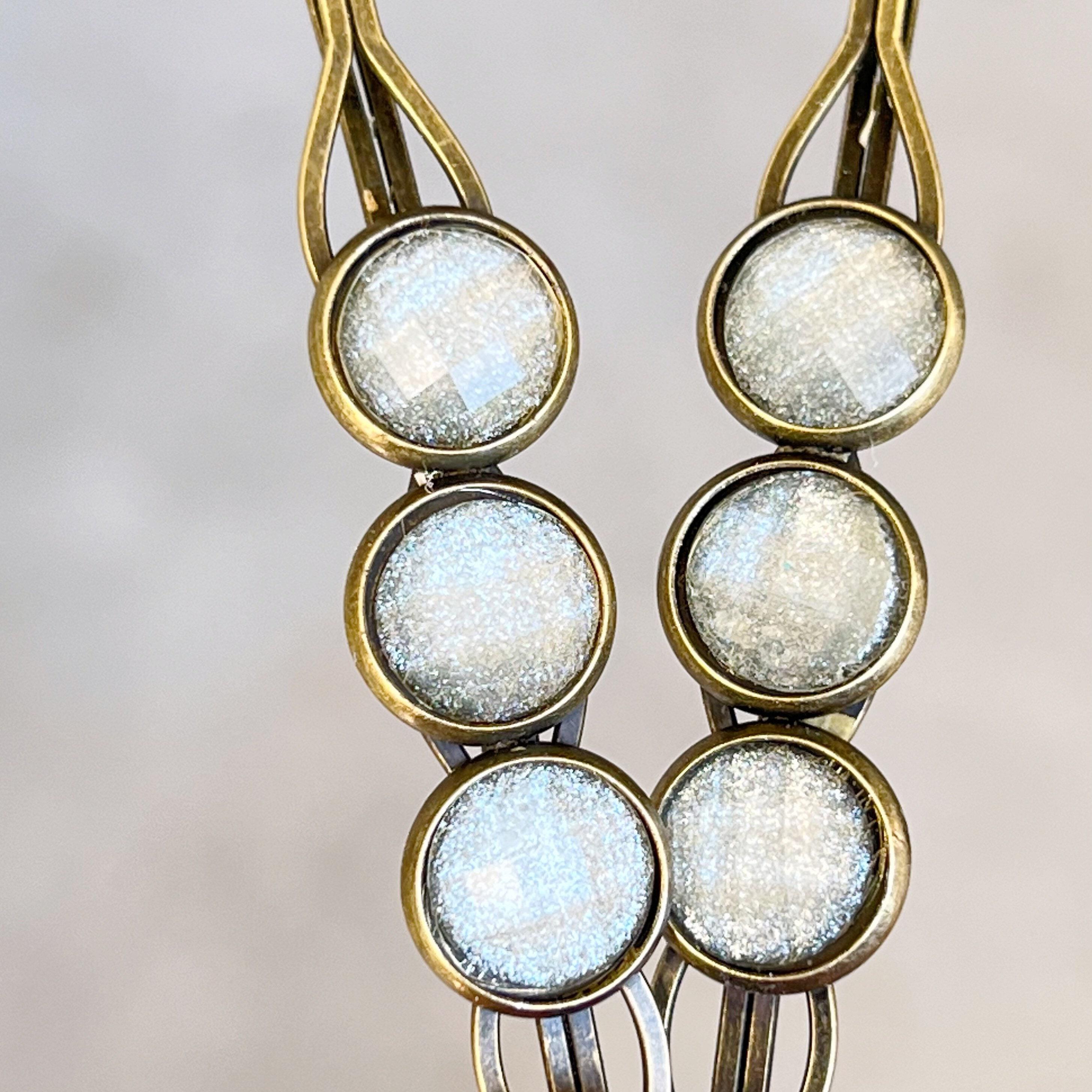 This Gorgeous set of 2 antiqued Bronze hair pins with White Glitter Acrylic Rhinestones will add that special touch to your hair. Such a fun way to add sass to your night out. You’re sure to get compliments with our White Bobby Pin Collection.