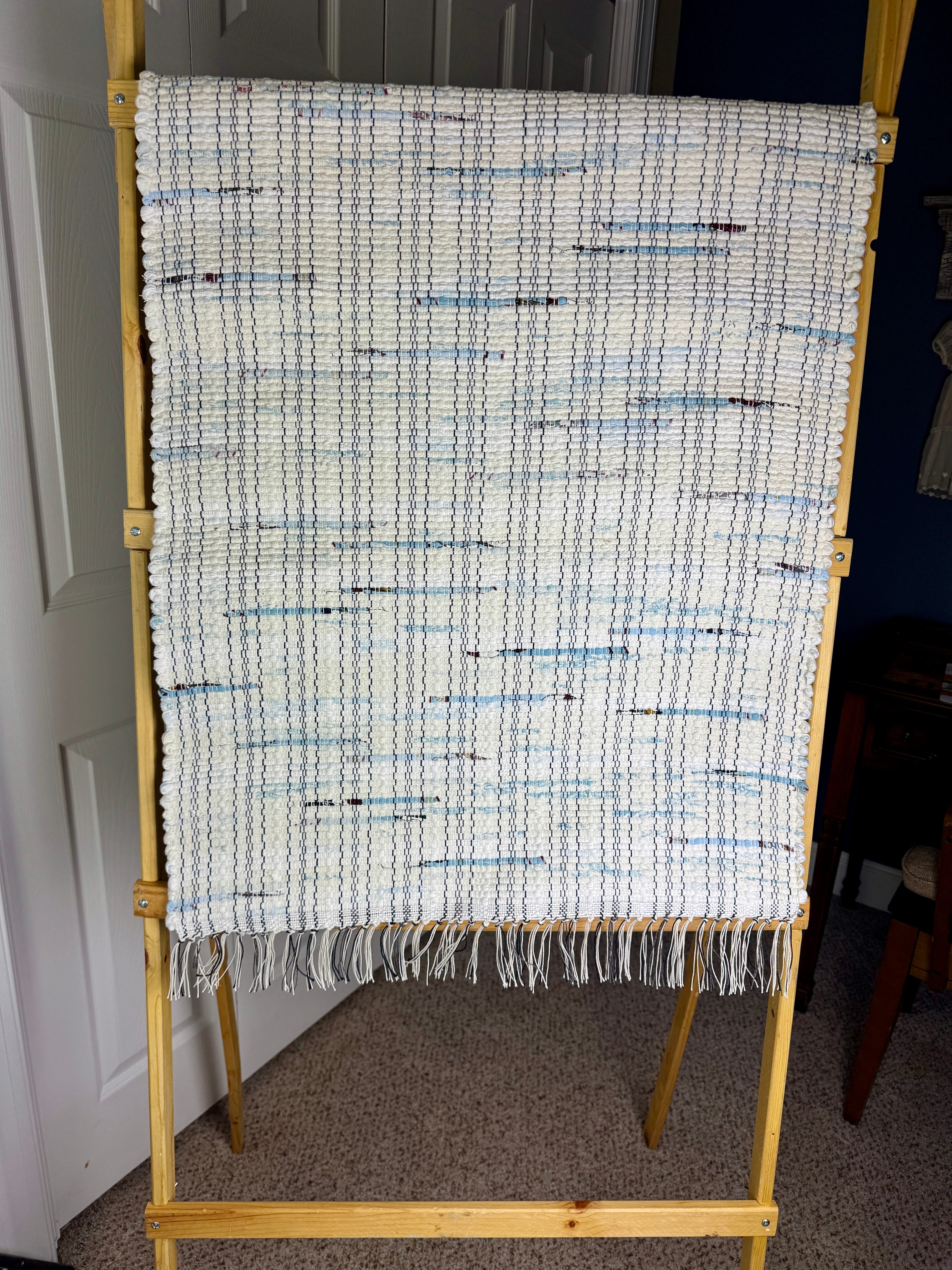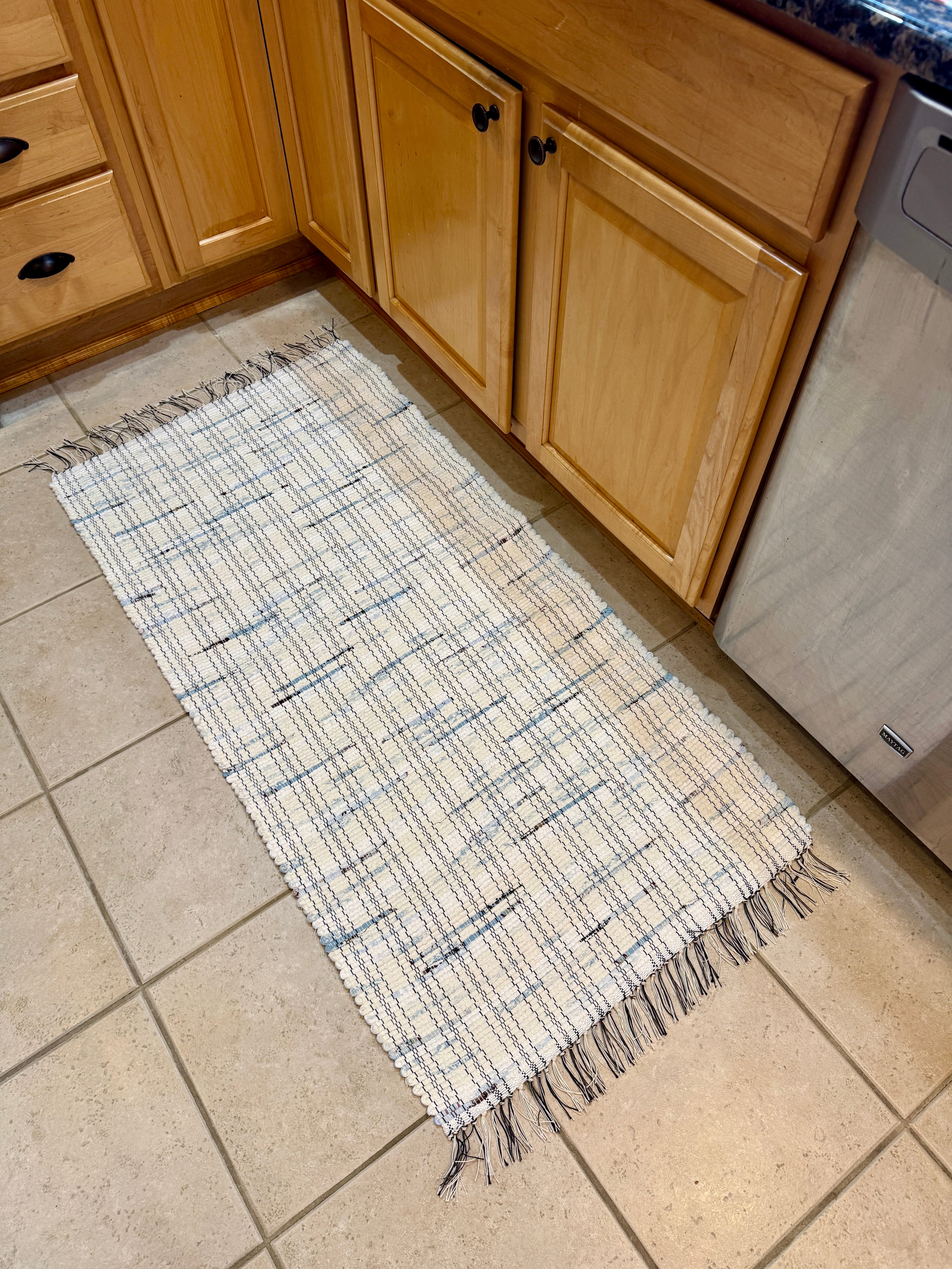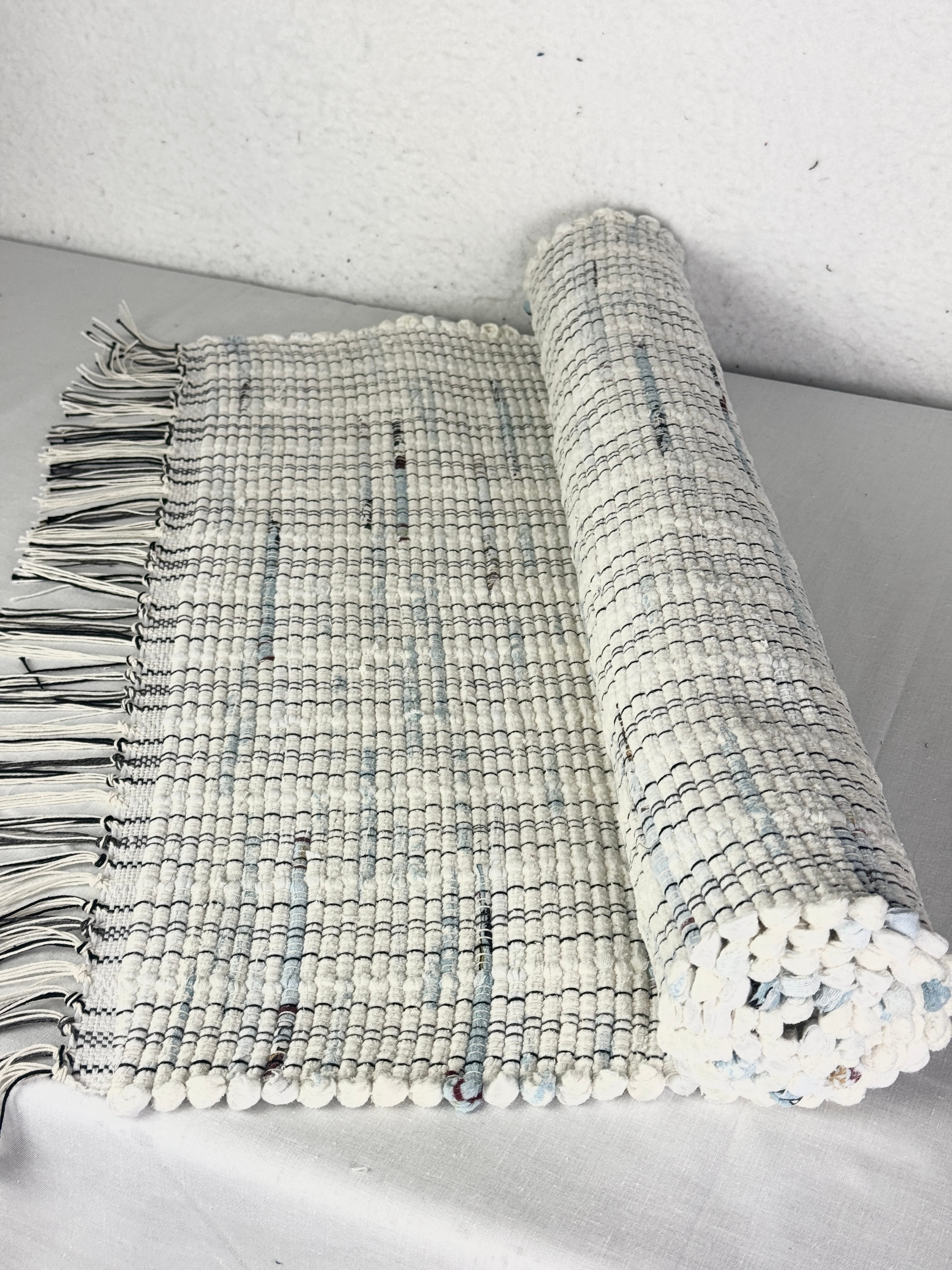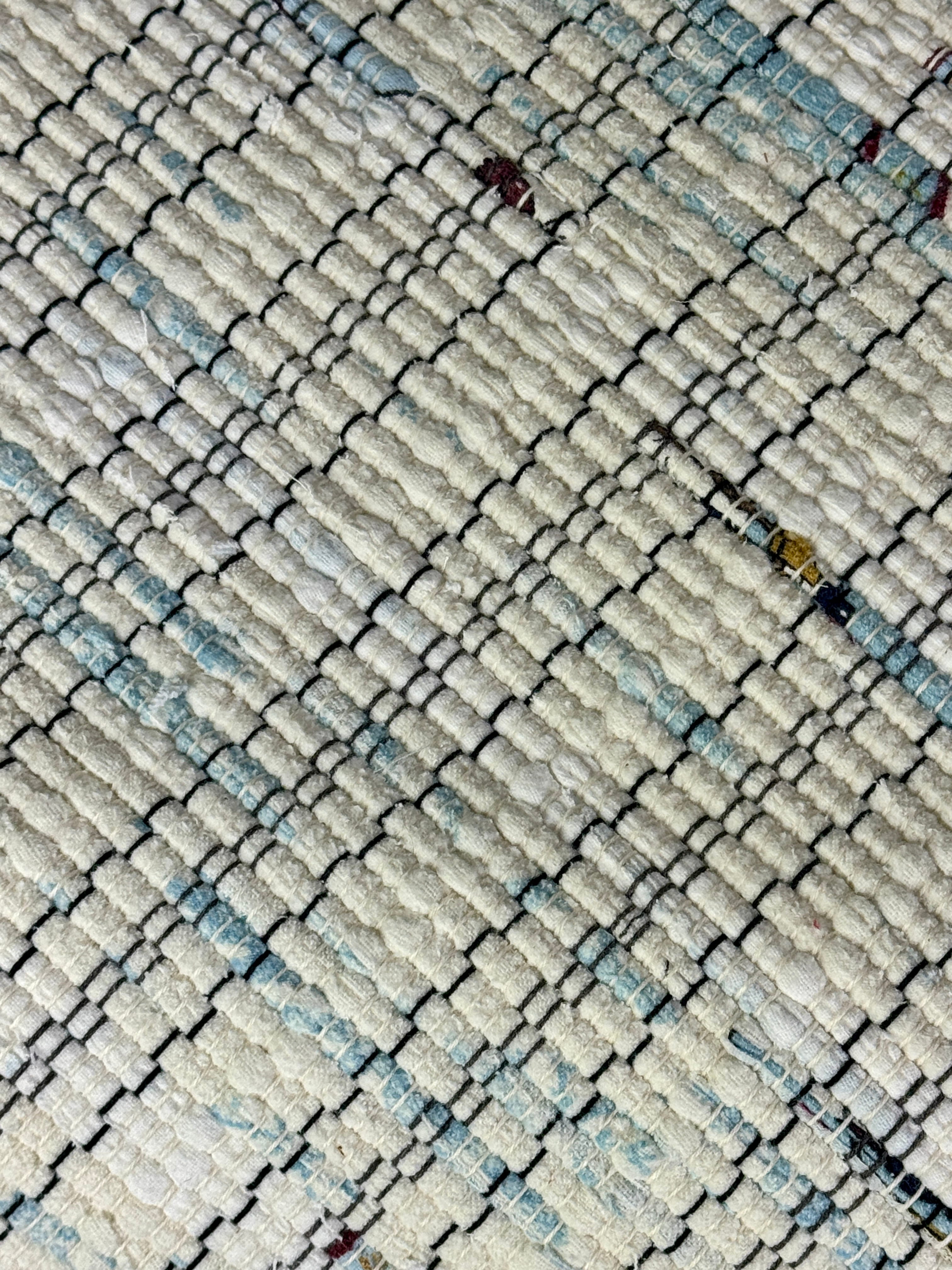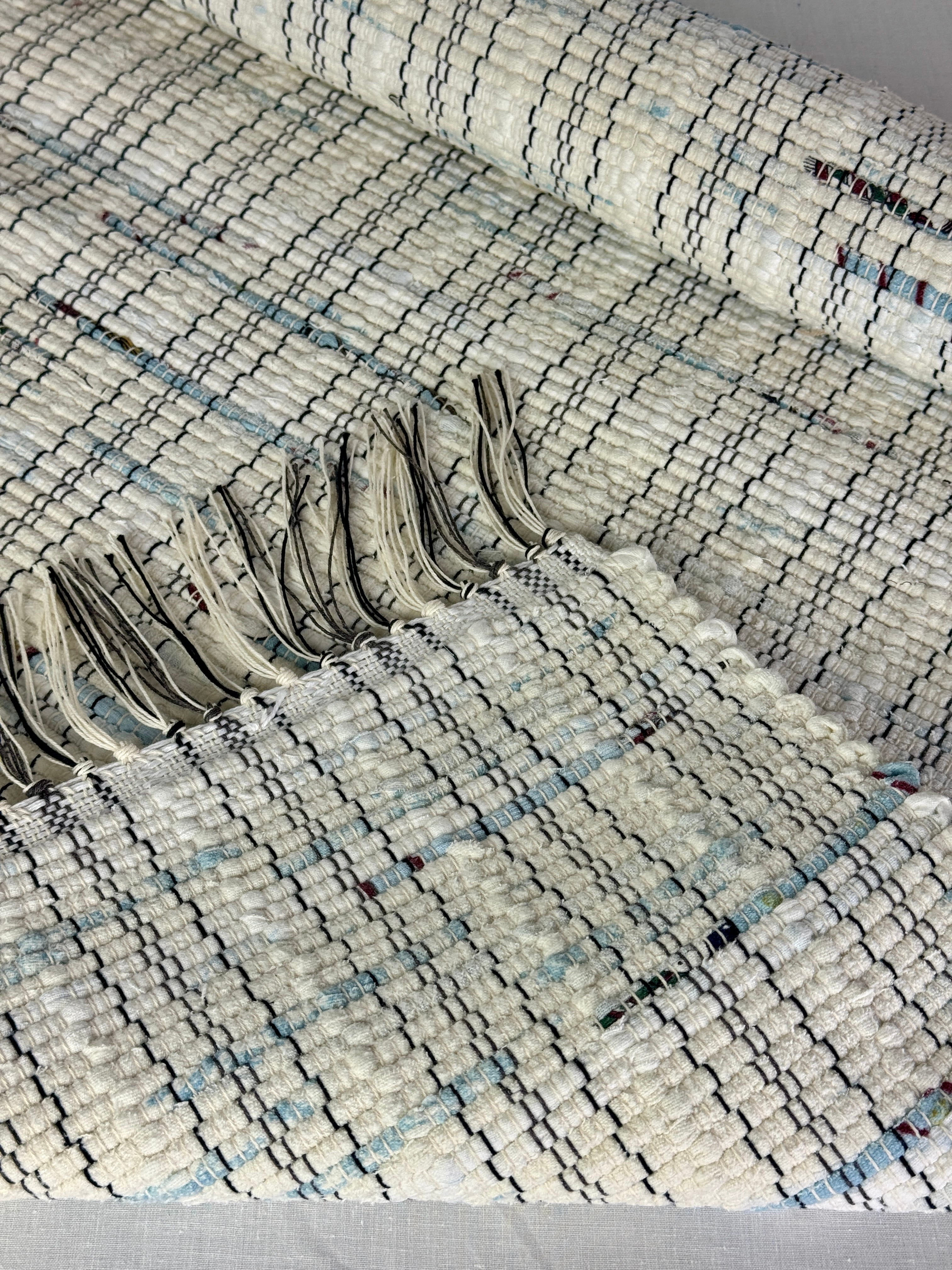 White w/Blue Bits Handwoven Rag Rug 25" x 50"
