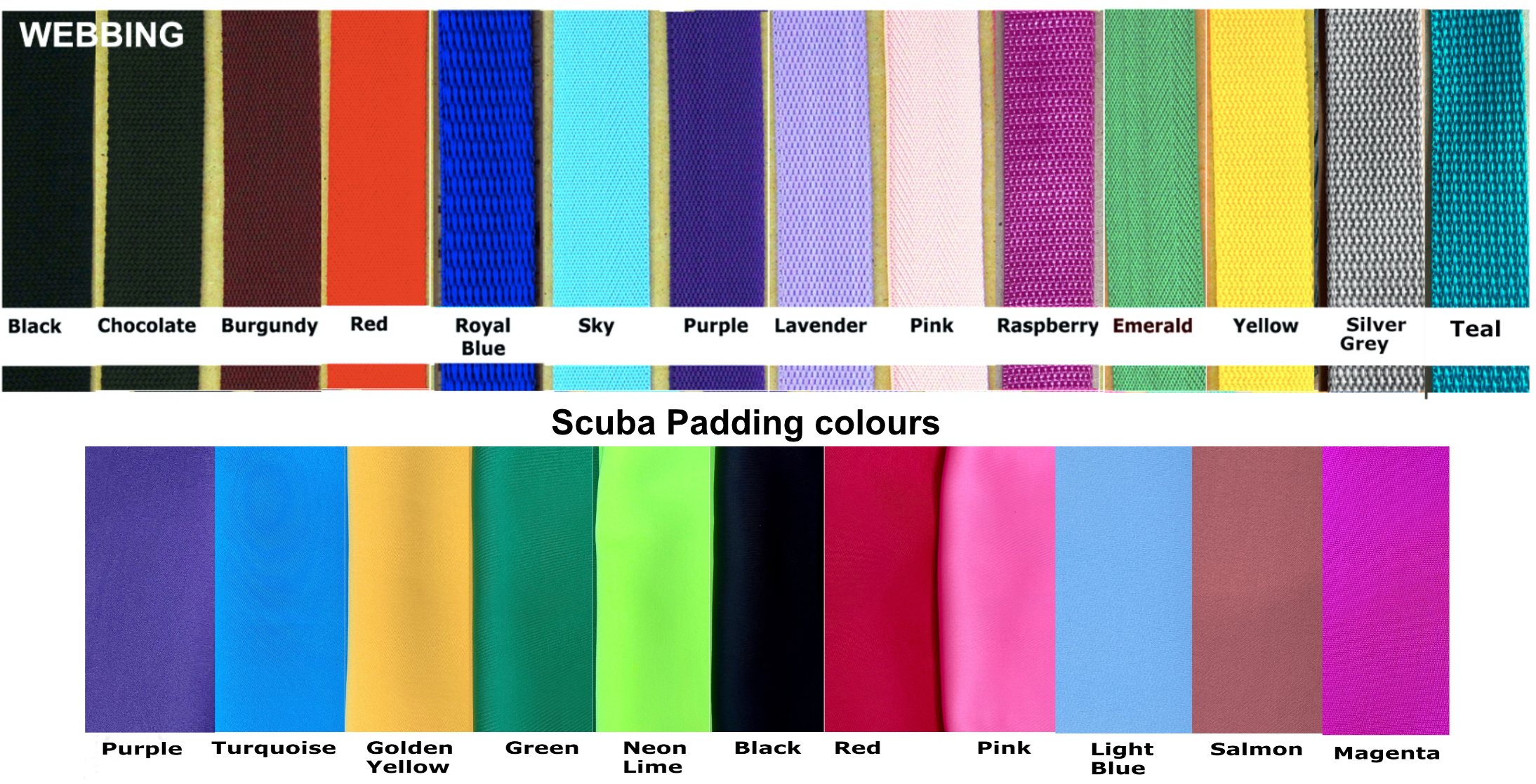 Many collar colours available. Choose 1 webbing colour and 1 padding colour from the drop-down menus (see 2nd photo for colours).