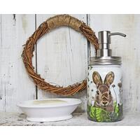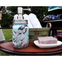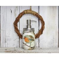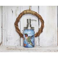 This is a handmade 16 oz Mason jar soap and lotion dispenser featuring three Cardinals - two male, one female - on snow-covered branches in a beautiful winter scene. It's simple and elegant and portrays winter more than Christmas but would make a lovely holiday dispenser. The background is bright sky blue. This dispenser would make a wonderful gift for the Bird Lover in your life!