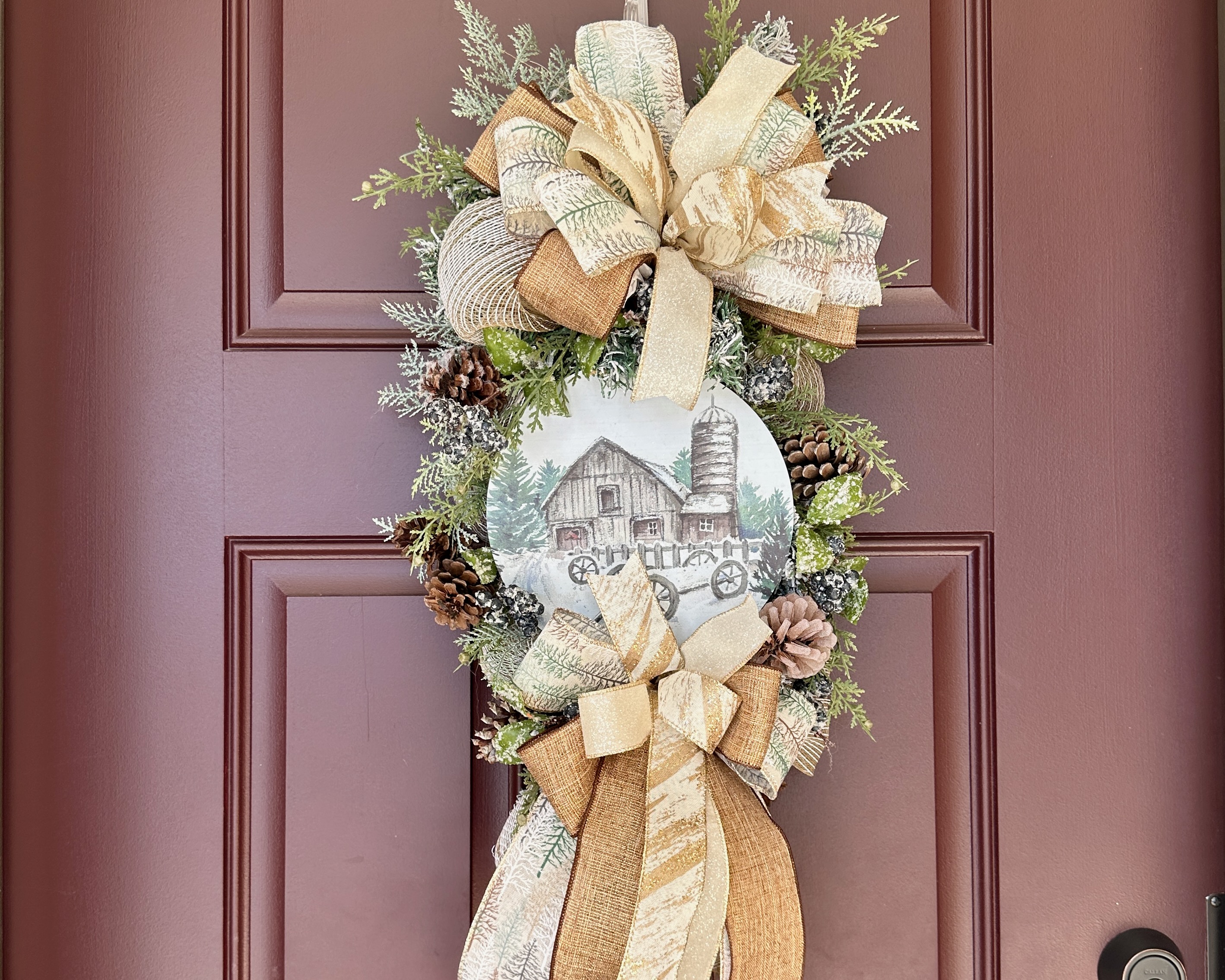 This evergreen teardrop swag with a winter barn scene will make an eye-catching winter display on your front door during and after the holidays.