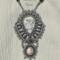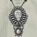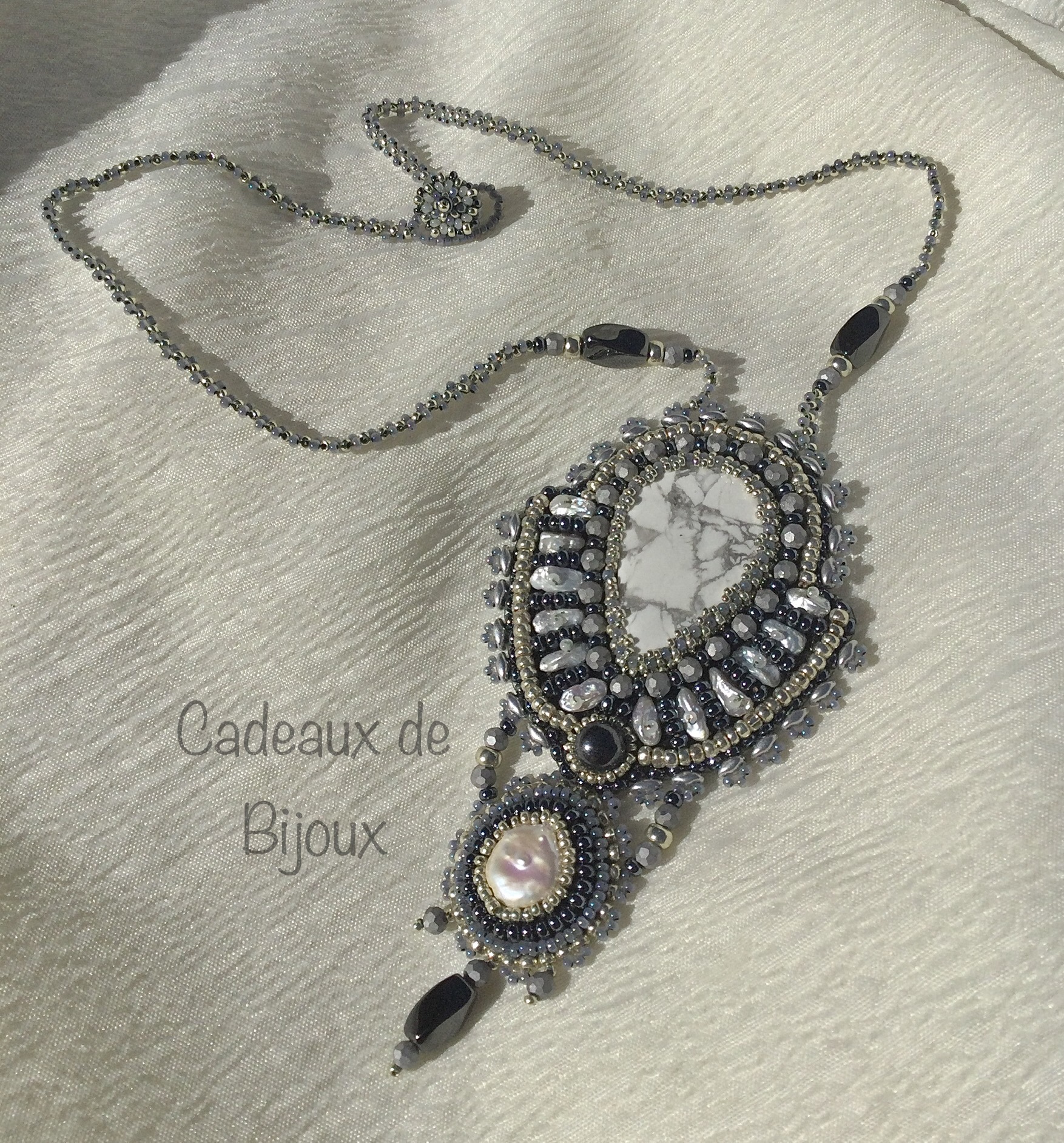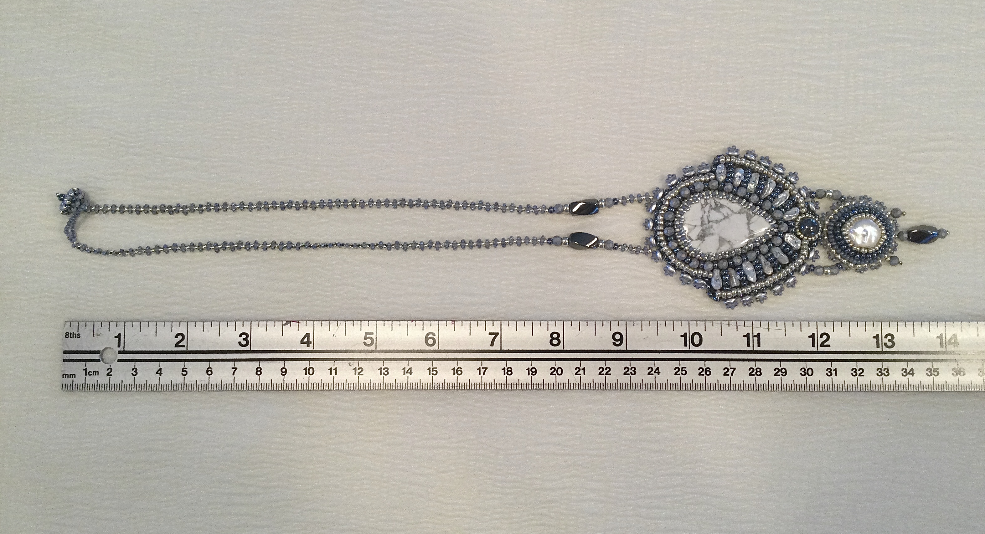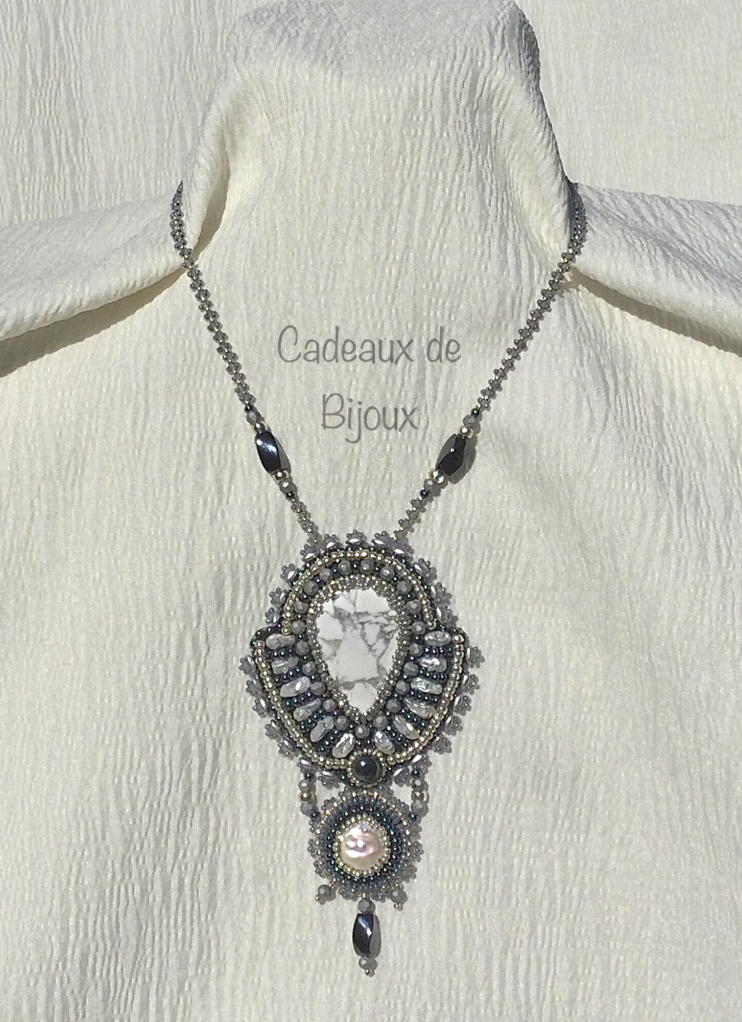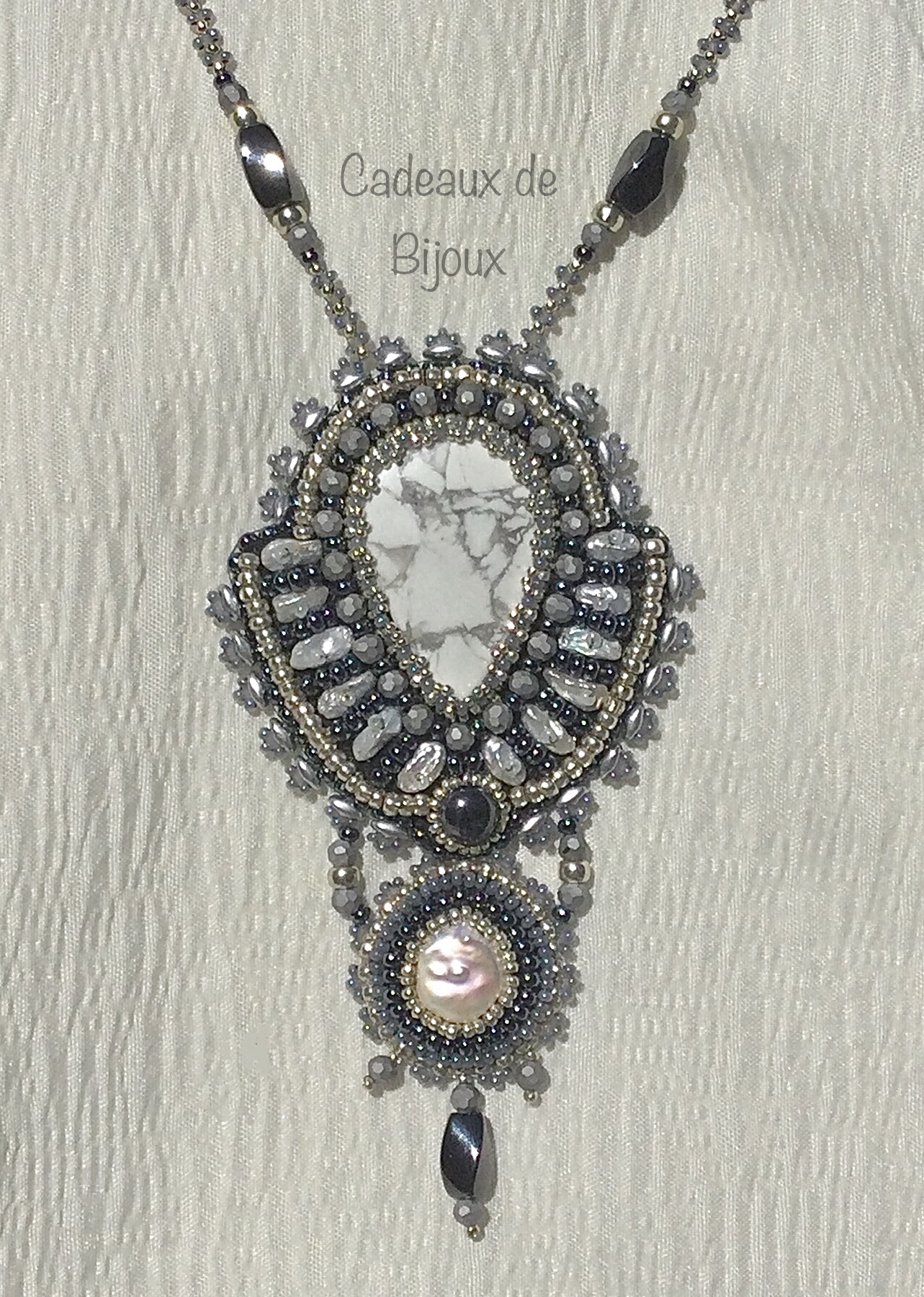 Winter lace is another creation that grew in an entirely different direction than I anticipated, having almost a Victorian vibe. Howlite focal accented with keshi pearls, magnetic hematite, gray, silver, and pearl Czech and Japanese glass beads.
