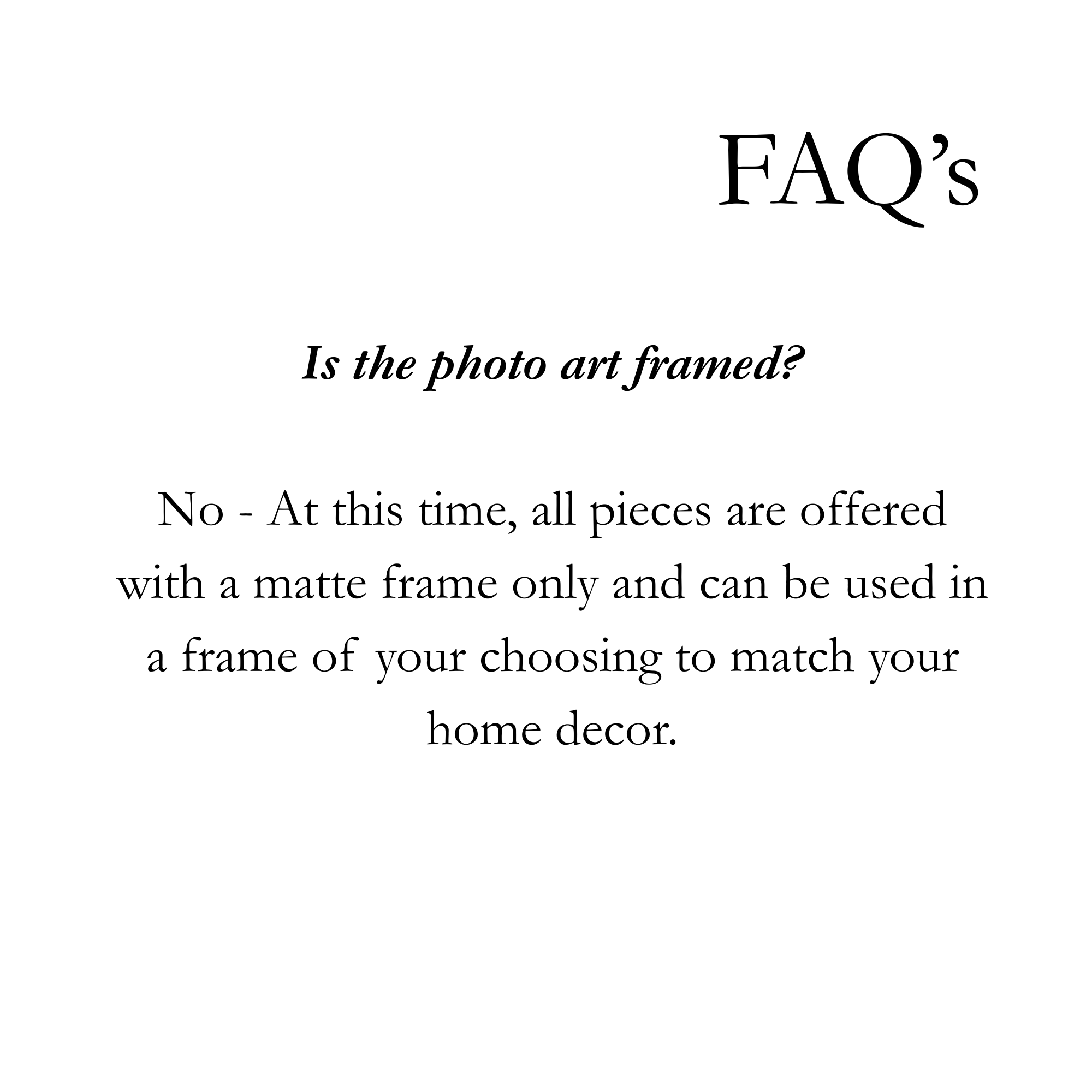 The photo art comes in a white matte; the frame is NOT included. This listing image is for inspiration only. You choose your own frame that fits best with your decor.