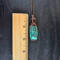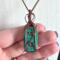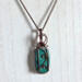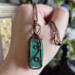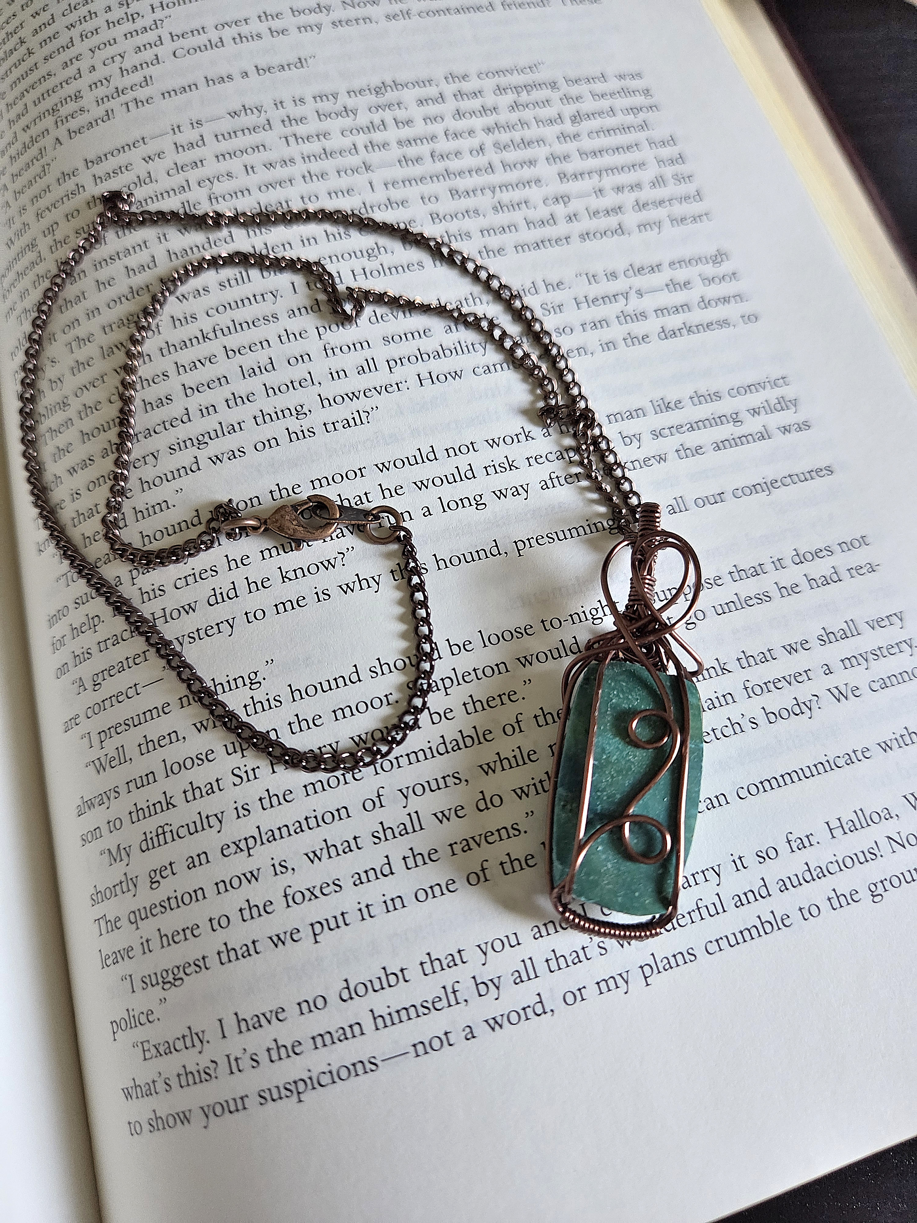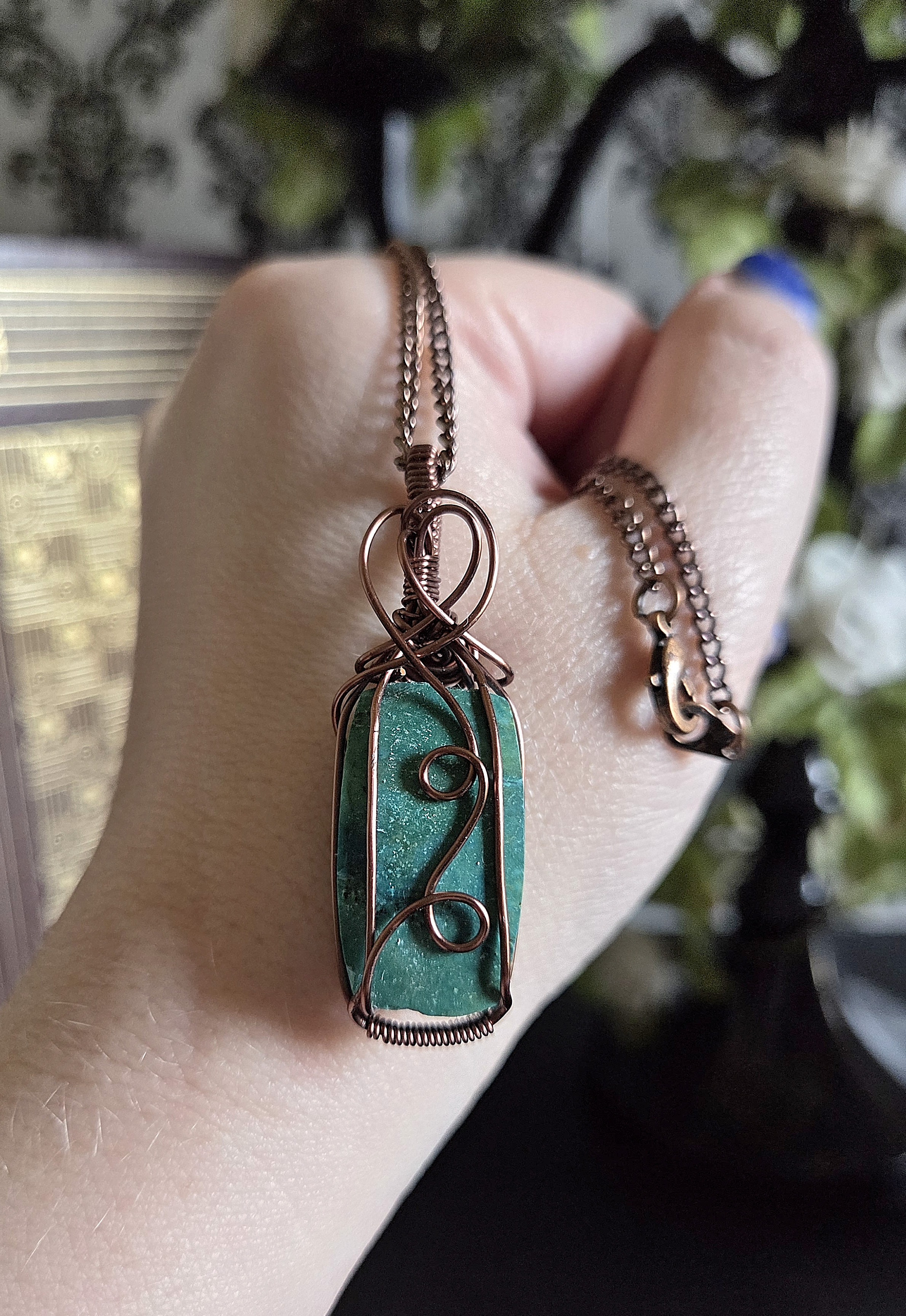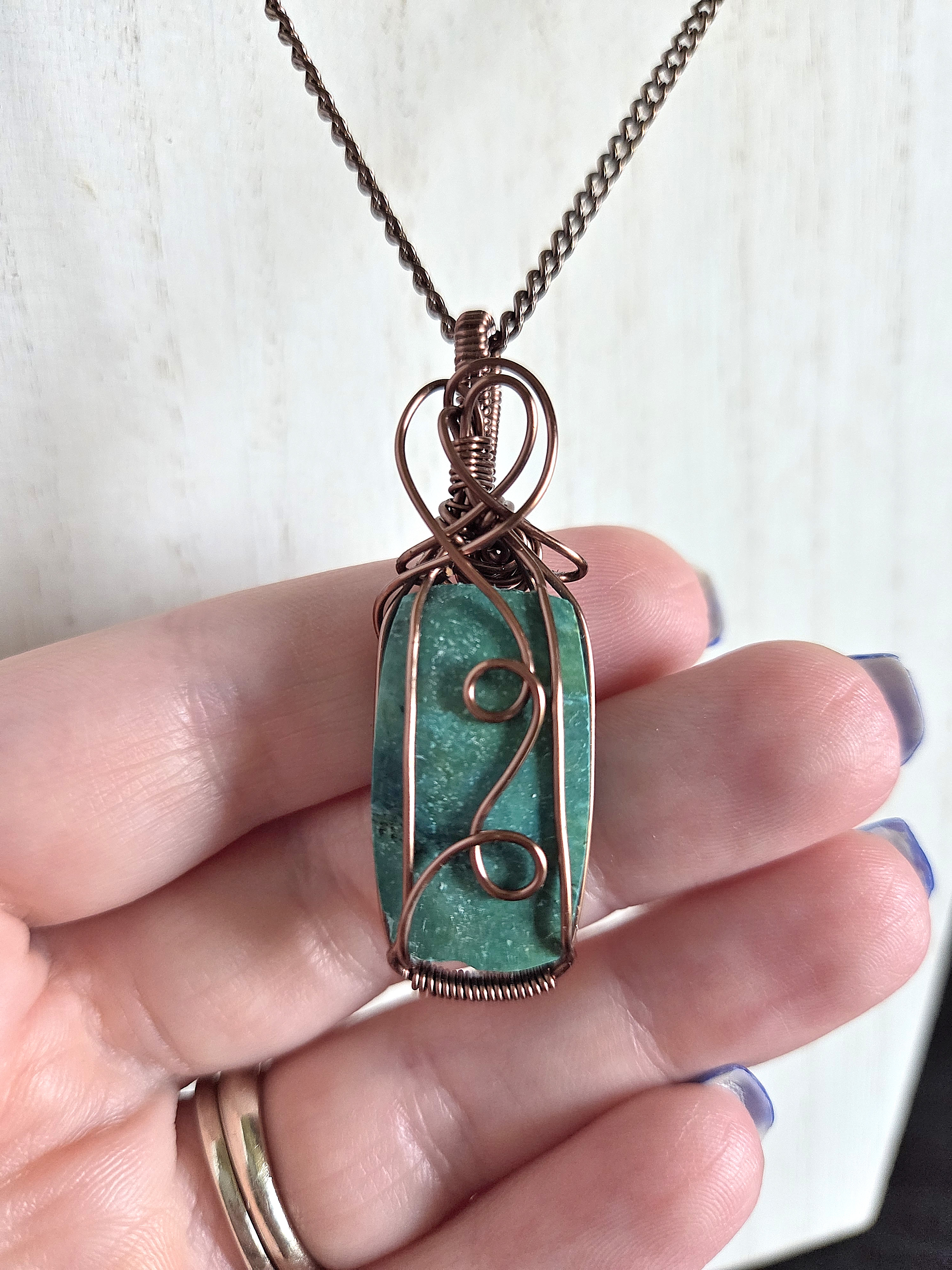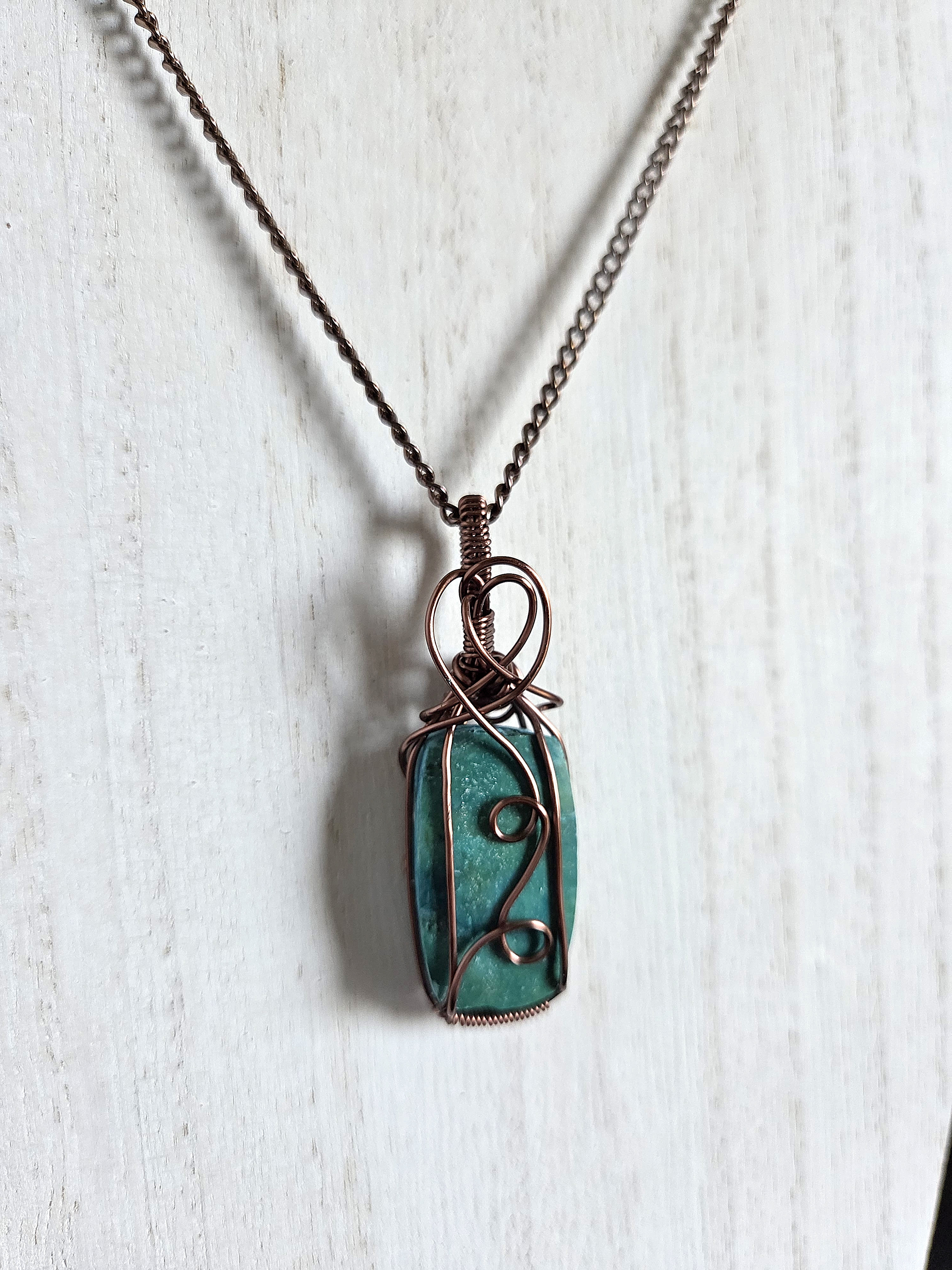 This handmade pendant necklace showcases a genuine Chrysocolla cabochon wrapped in warm antique copper-colored wire. The natural stone has a striking blue-green hue, full of depth and character, making this pendant one-of-a-kind. The wire is carefully shaped into a secure frame that flows into soft swirls and curves across the surface of the stone, adding texture and movement to the design. A simple wire bail tops the pendant, with a small wire rose hidden on the backside. Perfect for anyone who loves unique gemstone jewelry with a touch of rustic, earthy charm.