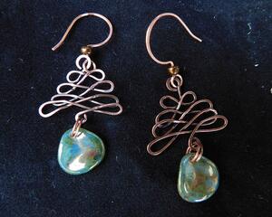 The copper wire wrap is a combination of a woven pattern,transitioning to a traditional border wrap.
