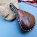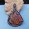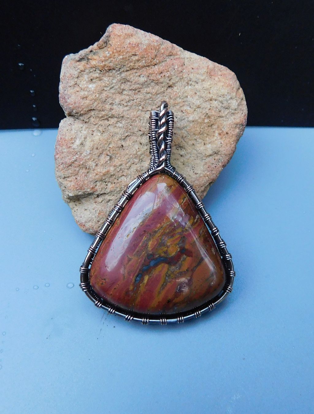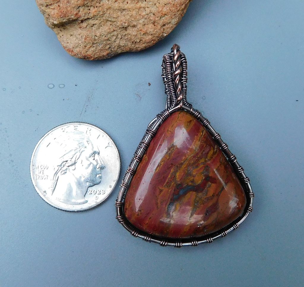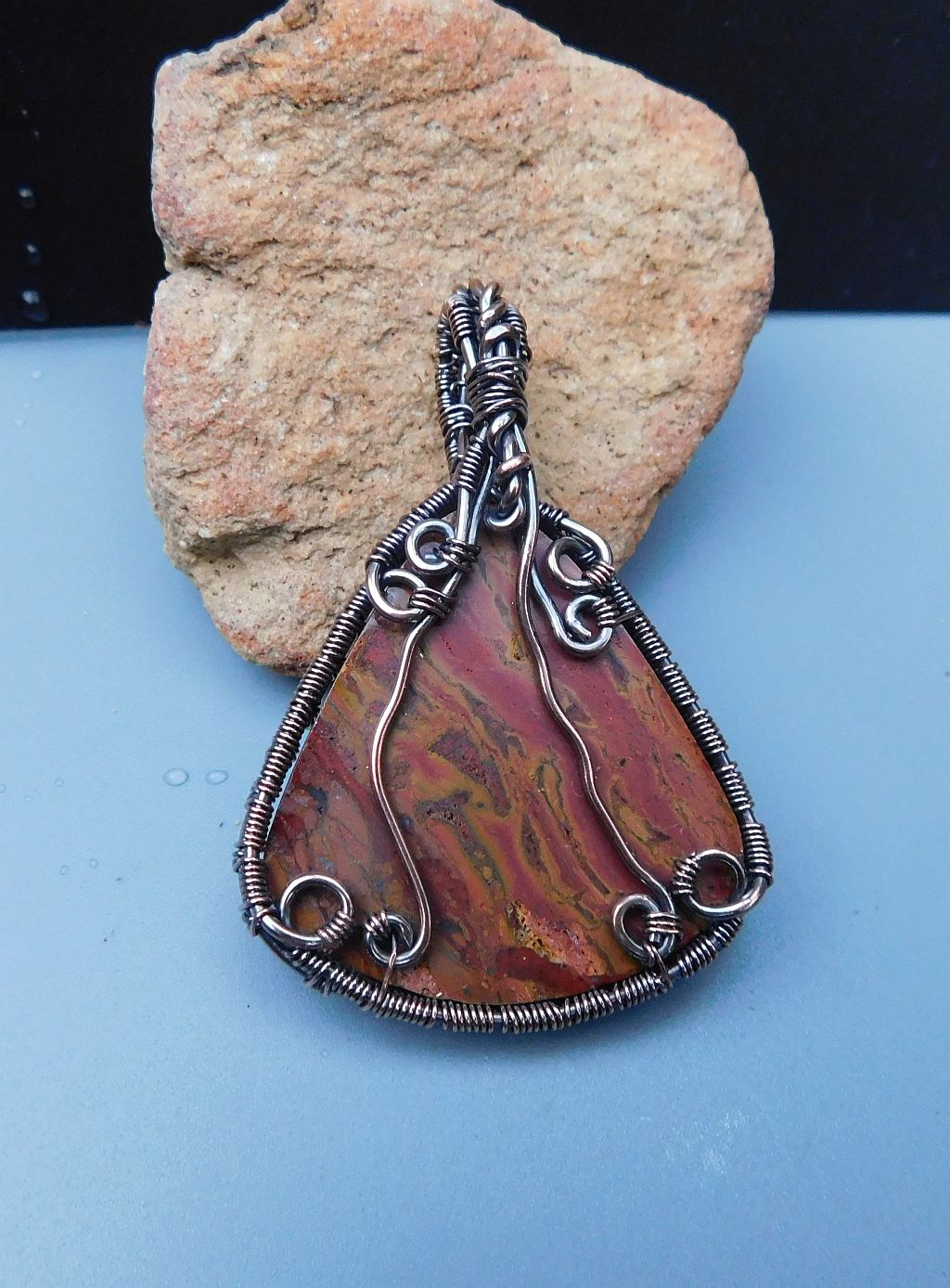 Multicolor jaspagate cabochon wrapped in a beautiful woven border, with an interesting twist in the bail design.