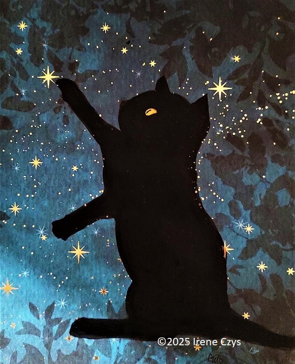 "Wishing Upon A Star" - 11 x 14 Fine Art Print on Archival Art Board ready to Frame. Artist Bio is included. This painting is from a series of paintings created by Hudson Valley artist Irene (Reenie) Czys for a fundraiser for local cat rescue groups in her community. The original painting was sold at the Arts Alive Art Gallery in Nyack. THERE IS NO PRINTING ON THE POSTER YOU WILL RECEIVE.