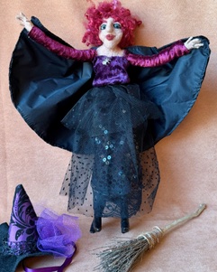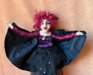 Needle felted wool face and body. Her outfit is sewn on and made from velvet, tulle, sequin cloth, and lace.