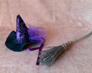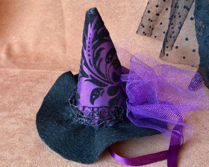 Her velvet brocade hat is adorned with black glitter and netting and is removable.