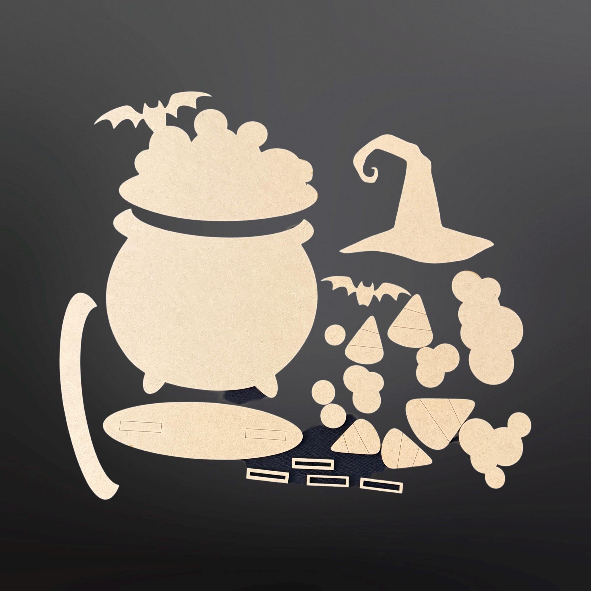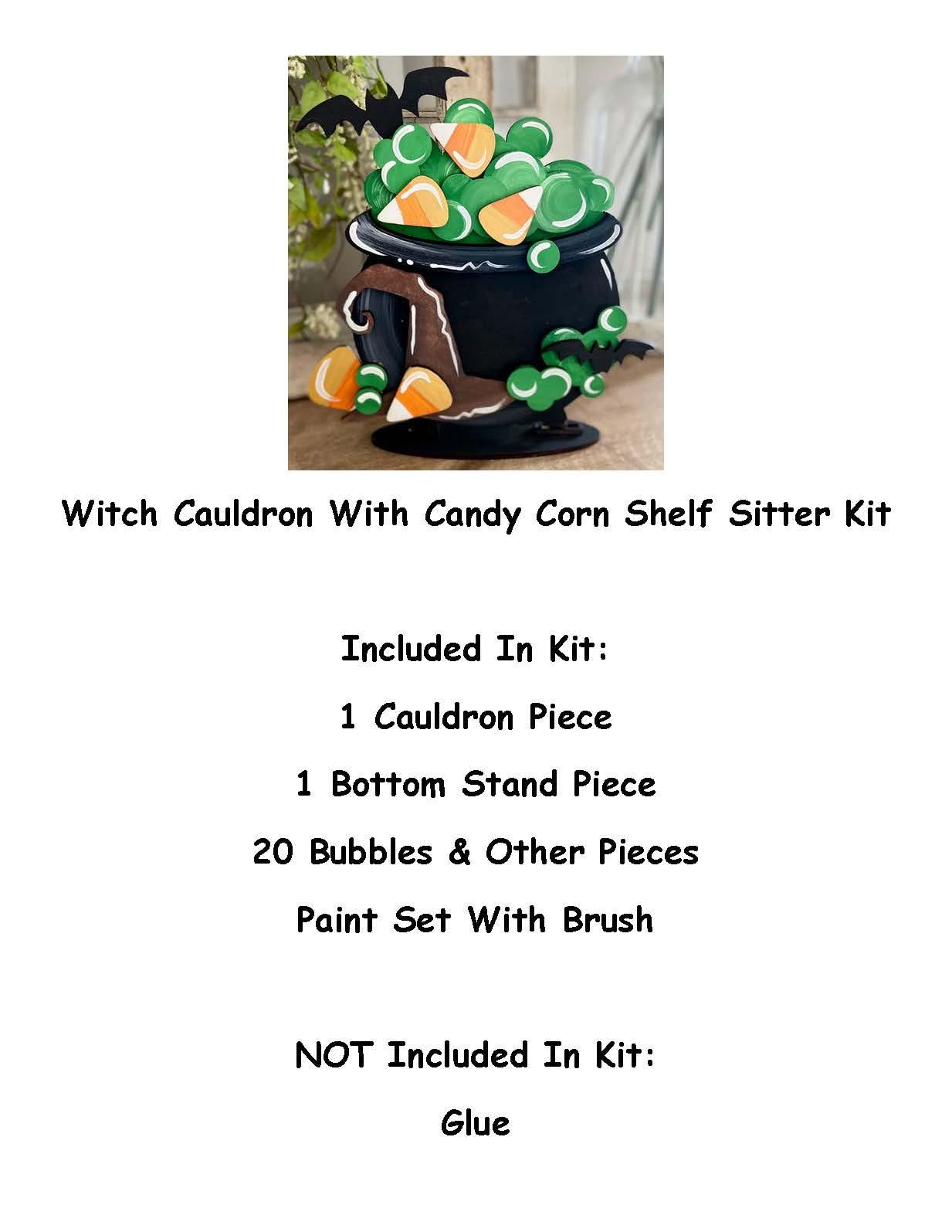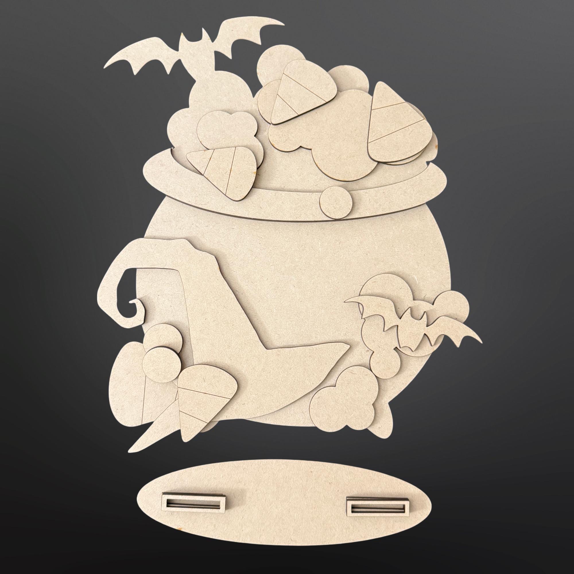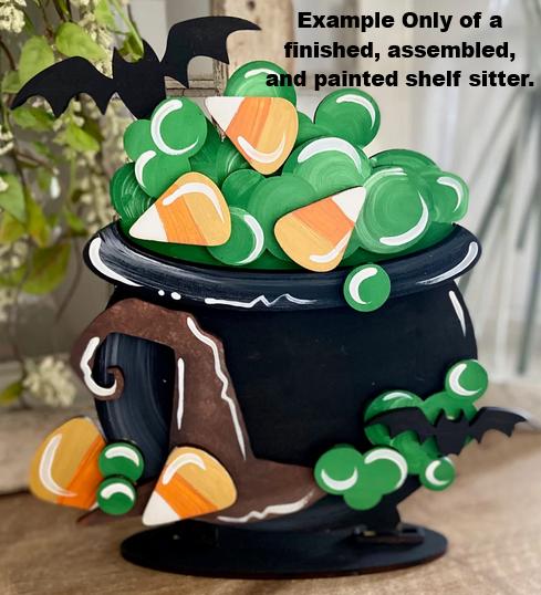 This is a witch cauldron with candy corn and bubbles DIY (Do It Yourself) wood shelf sitter craft paint kit. The pieces are laser cut on 1/8" inch thick draftboard. It DOES stand up on its own. Glue NOT included. This is NOT a finished and completed shelf sitter. You assemble it, glue it together, and paint it yourself.