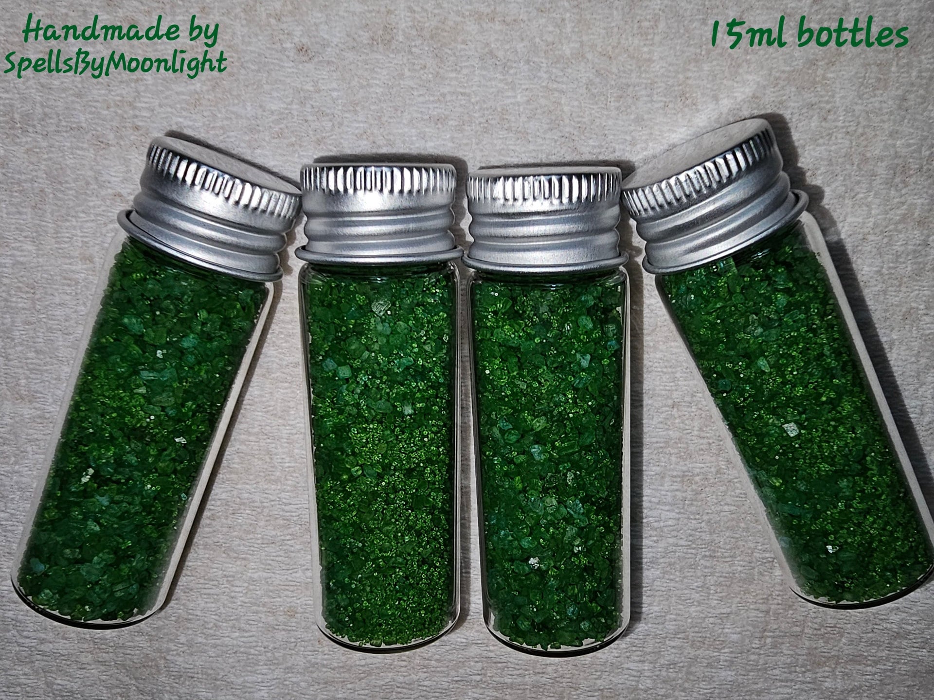 I make my witch salts in small batches. This Green Salt is to help you gain Prosperity and Abundance. Anything money related. Use in spells, rituals, spell jars & to dress candles. ✨Listing is for one 15ml bottle of Green Witch Salt only. All other items were used for product photography
