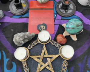 altar supplies, jar, dishes, candle/sphere holders, and decorations