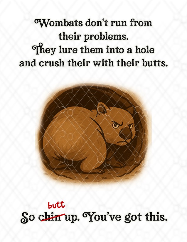 When life gets hard, be the wombat. Don’t run. Don’t cry. Don’t write a Facebook post about it. Lure your problems into a metaphorical hole and crush them with your butt.