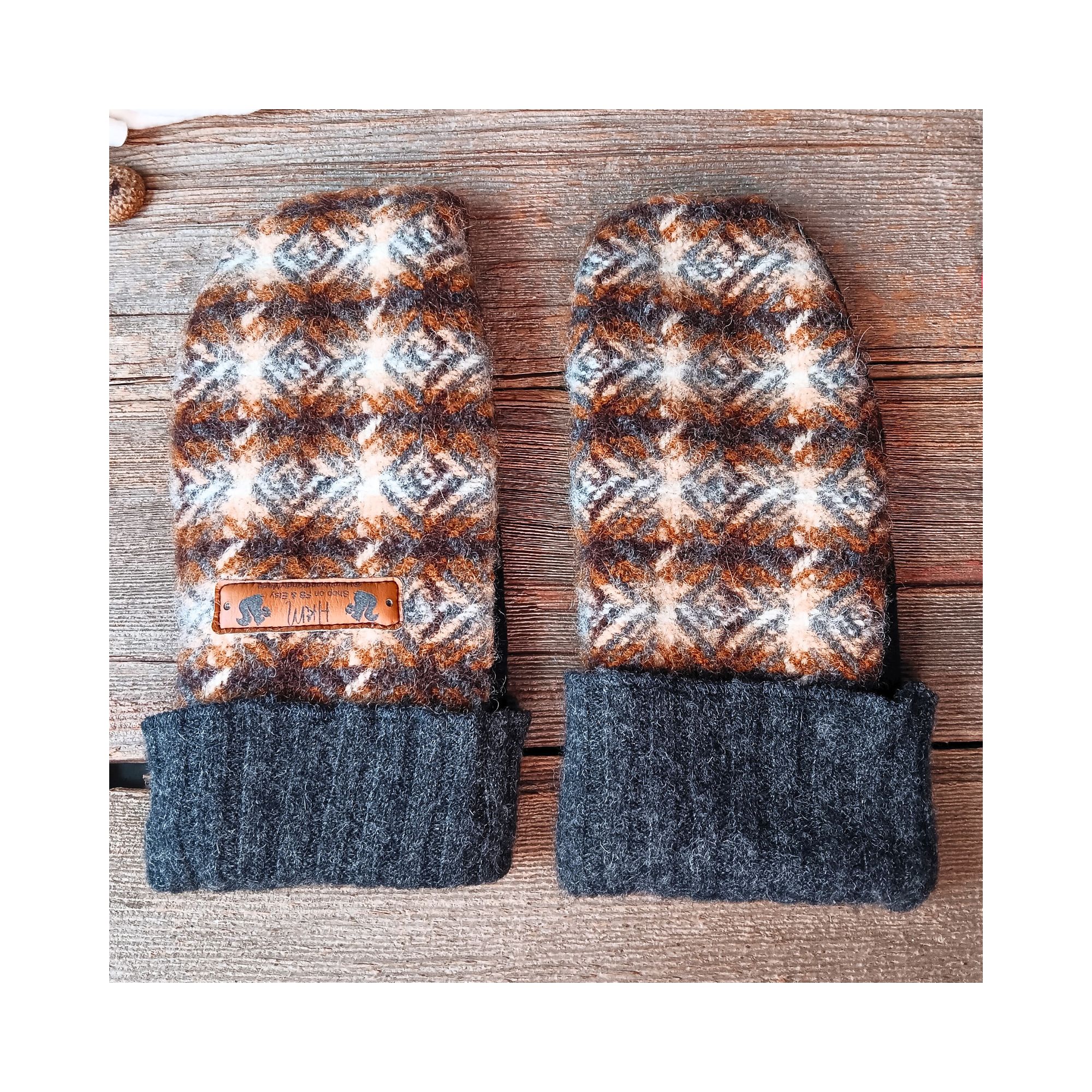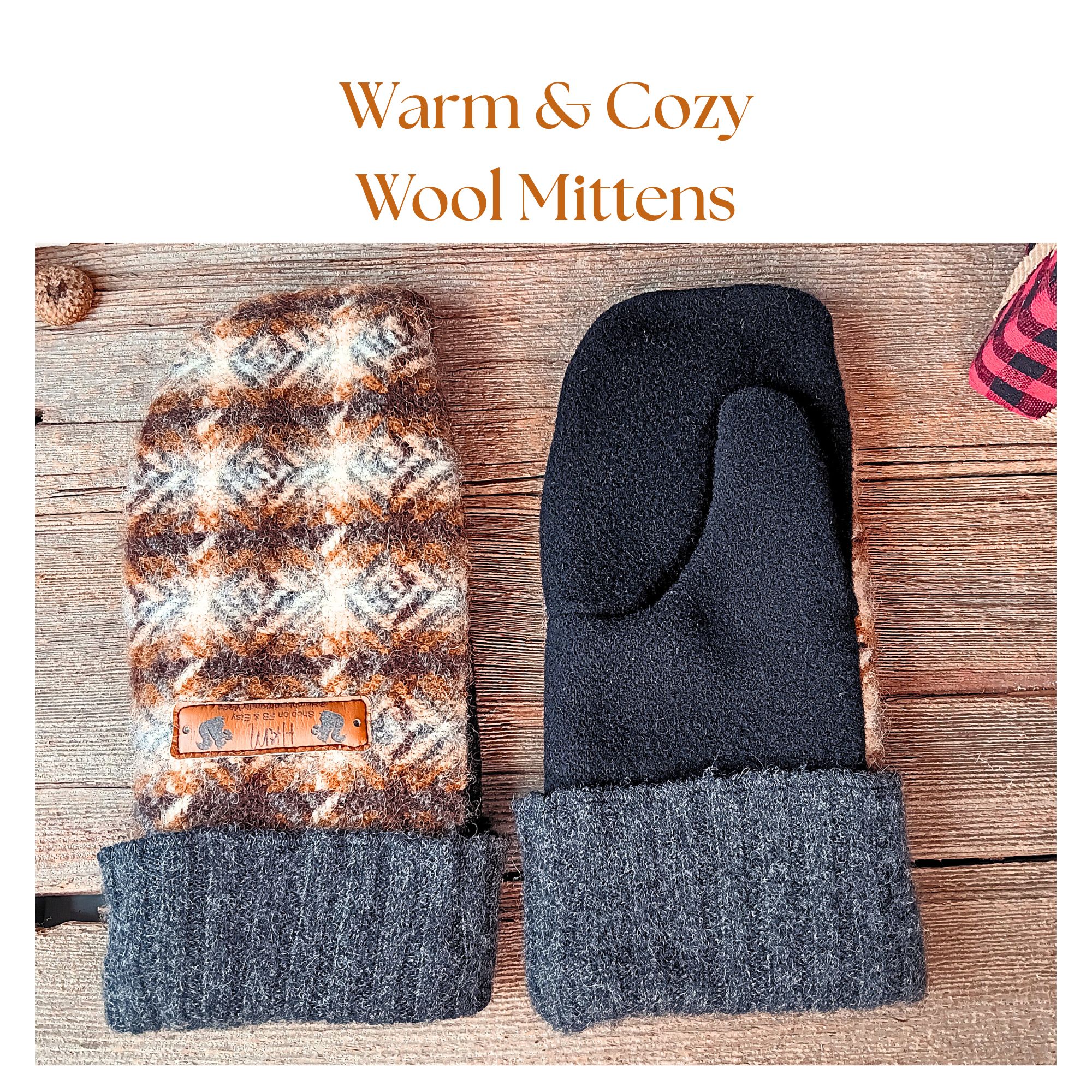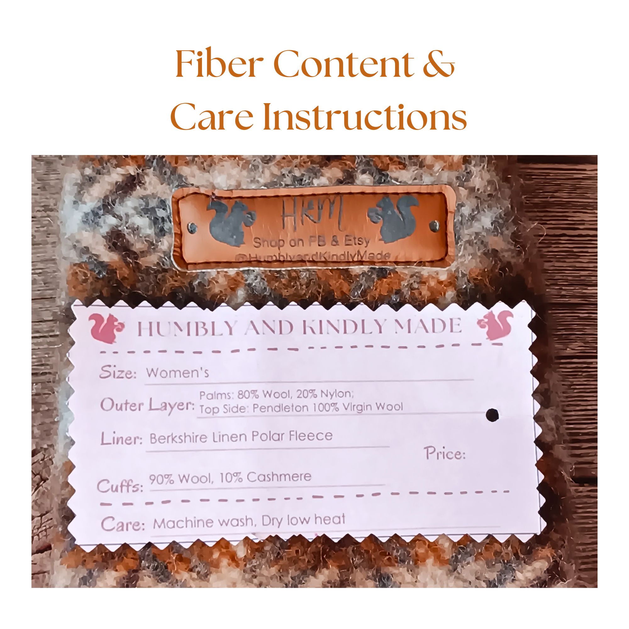 • Upcycled Wool Mittens are handcrafted from recycled wool sweaters & wool coats. All fiber content is printed on the tag of each pair of felted wool mittens and in the description box of each picture.