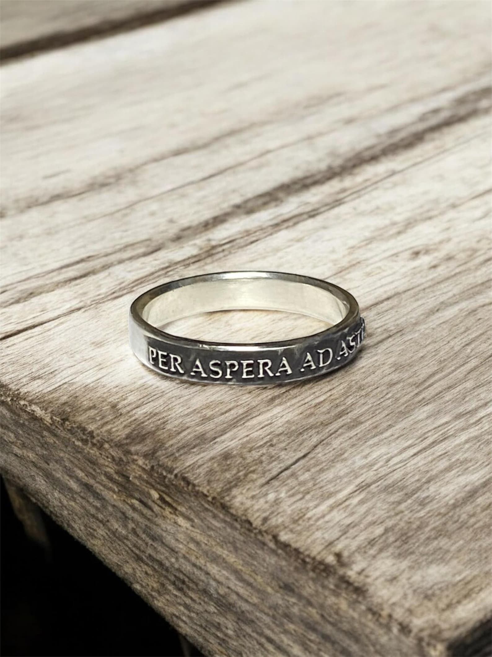 This rustic style Sterling Silver Per Aspera Ad Astra ring features the words Per Aspera Ad Astra which means "Through Hardships, To The Stars" as a reminder that obstacles are essential to success and meeting our goals. The lettering on the ring is raised, not stamped. These also make great gifts!