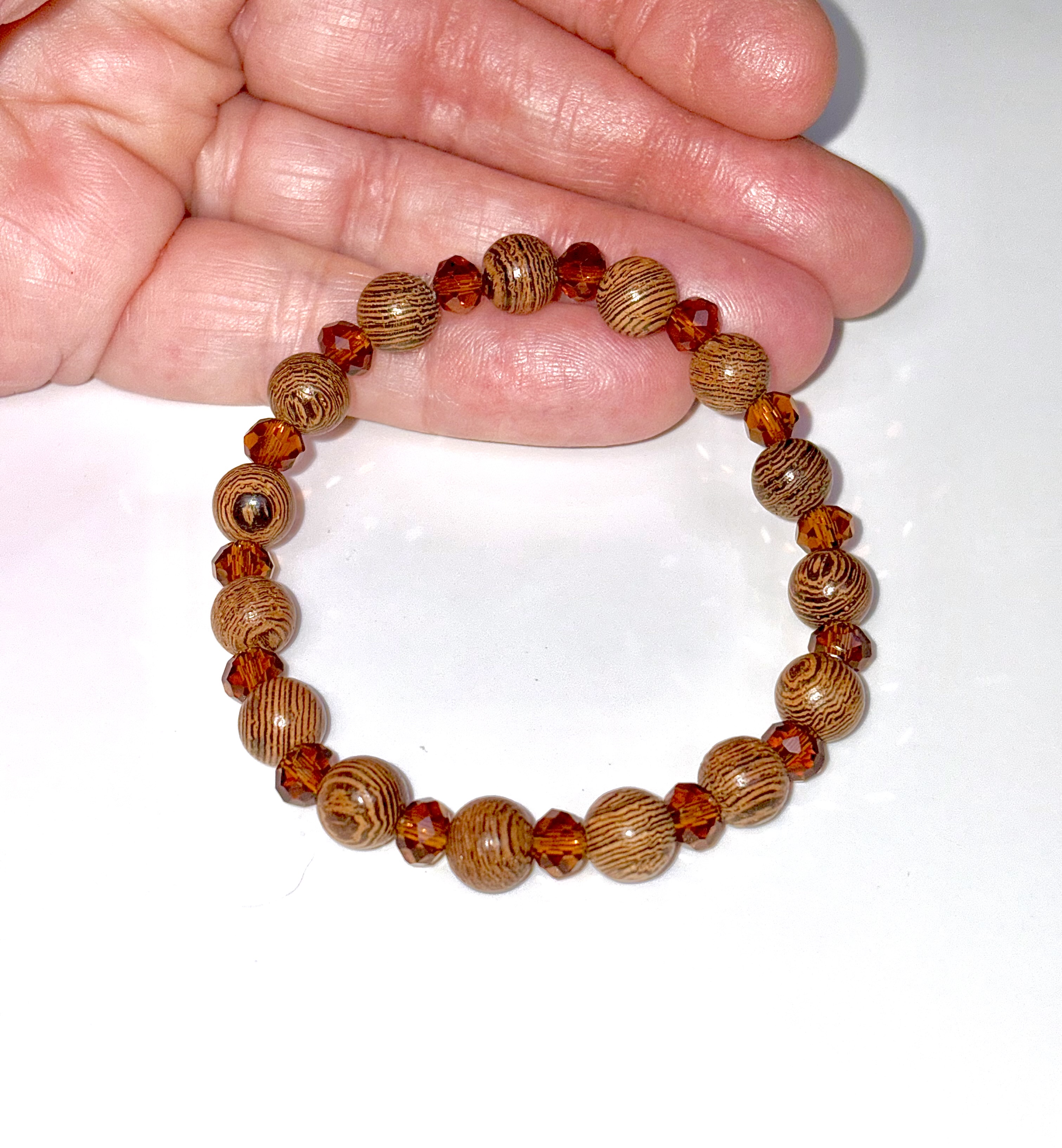Elevate your style with our handcrafted Wood and Amber Crystal Stretch Bracelet. Featuring natural wood grains and sparkling faceted accents, this comfortable stretch bracelet is the perfect blend of rustic charm and elegance.