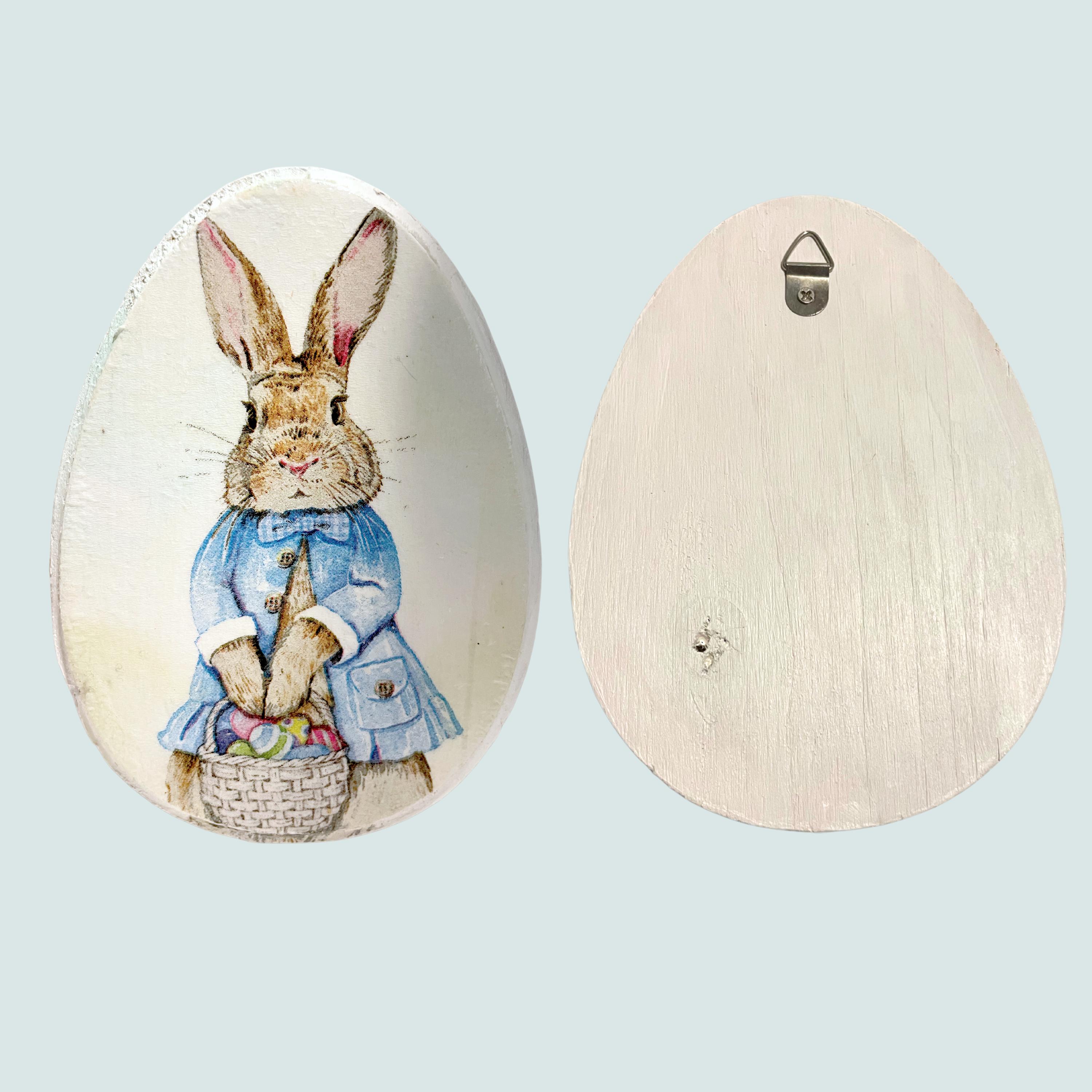 Handcrafted wooden egg plaques with decoupaged bunny designs