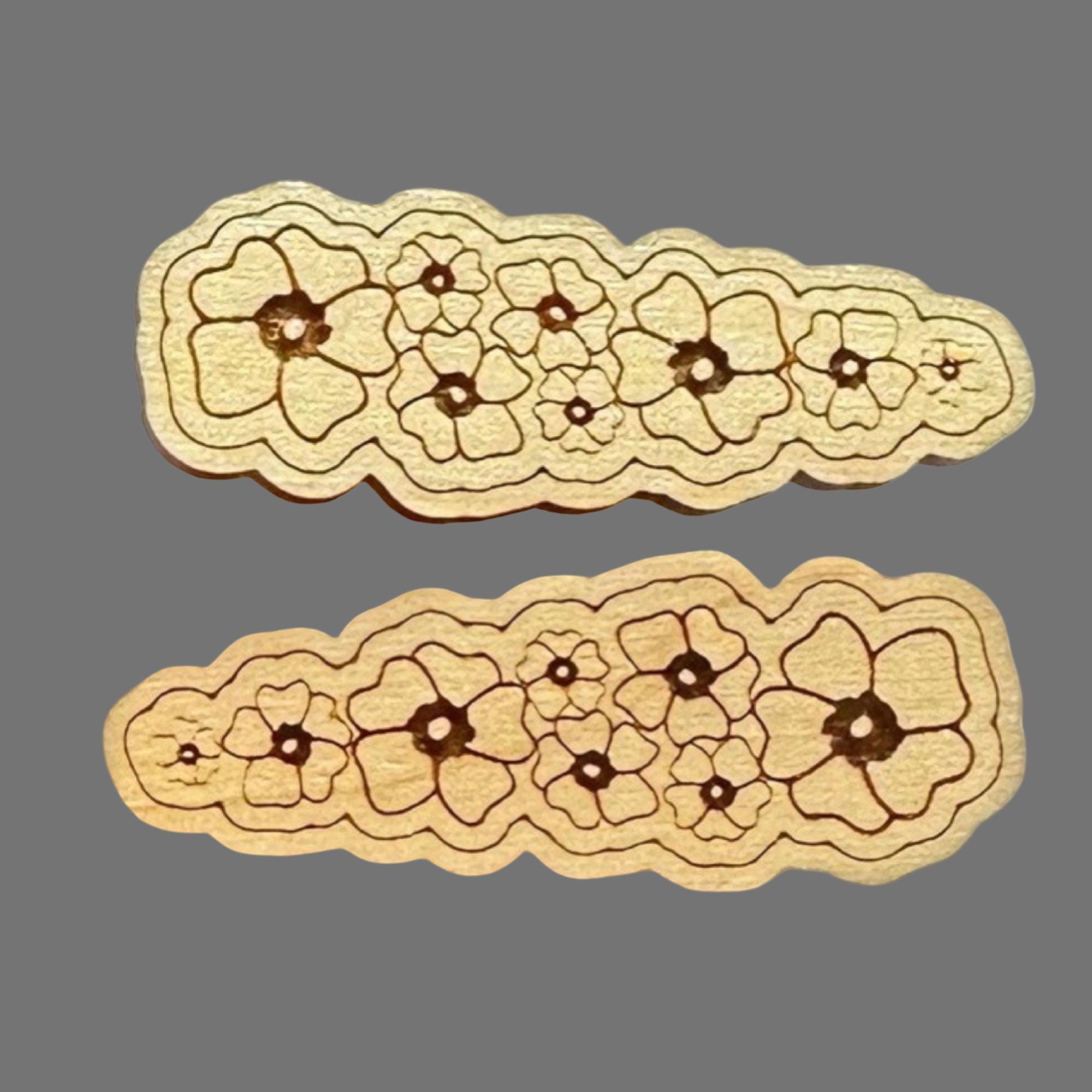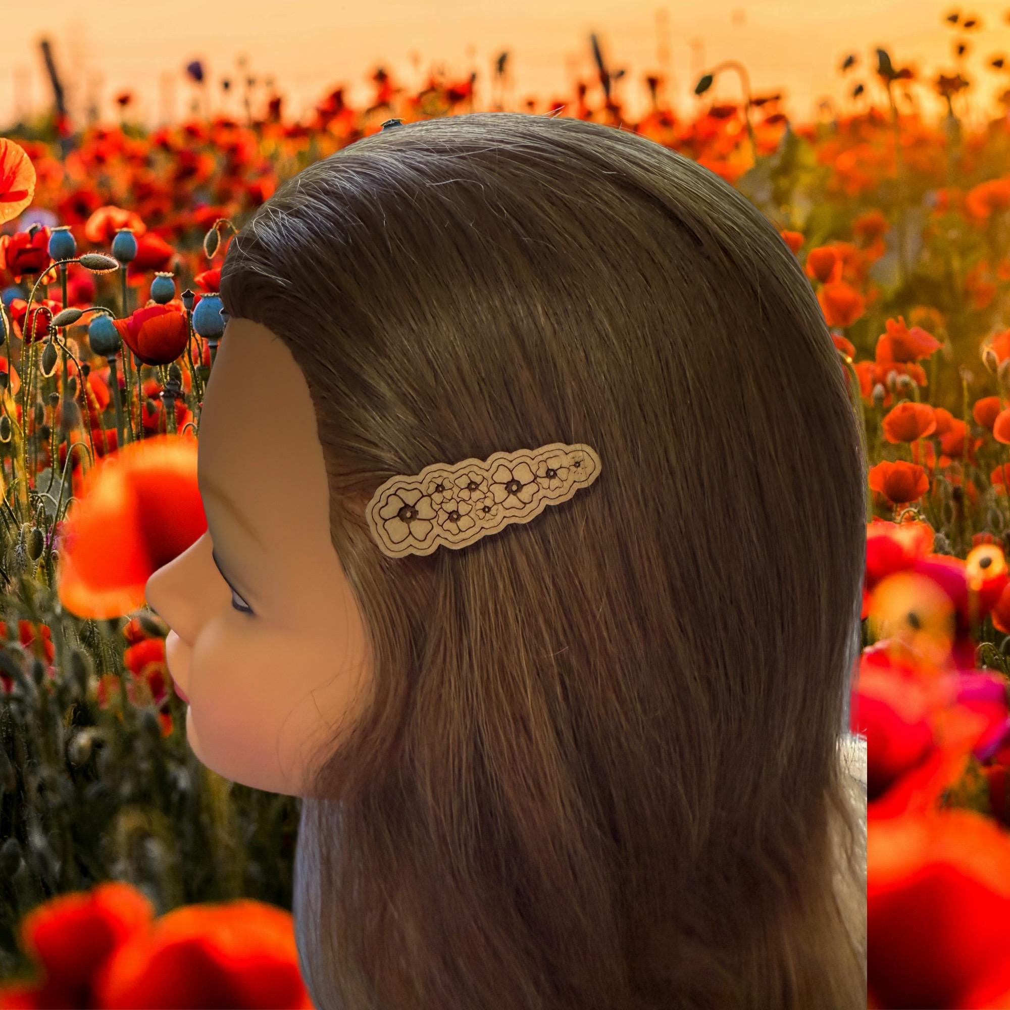 These are a pair of laser cut lightweight poppy flower wood hair barrettes. They are made from 1/8 in thick medium poplar hardwood. They have an alligator clip on them. The clips are nickel plated metal. They are approx. 2” long.