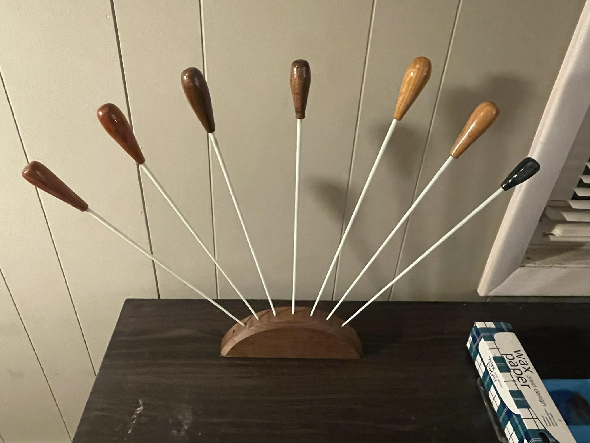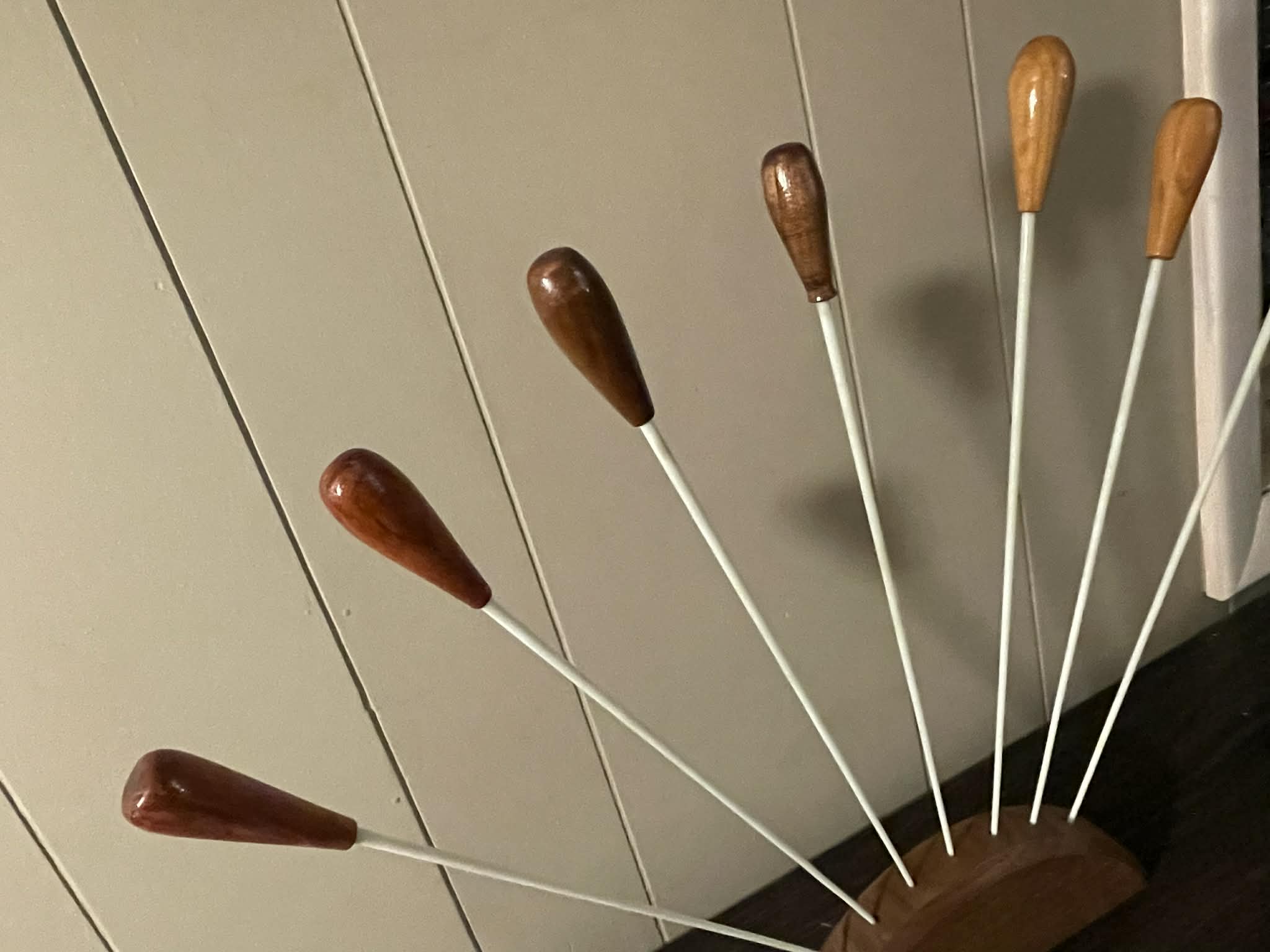 Lathe-turned, wood handled, conductor batons. Approximately 15"-16" depending on the style of handle.