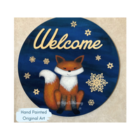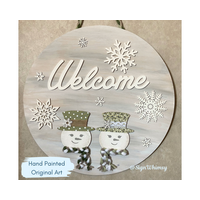 adorable hand painted wooden winter welcome sign with snowflakes and a snowman and snow lady with cozy scarves made of yarn, shades of red, golden yellow, taupe, beige, comes with a yarn braid stapled on the back to aid in hanging the sign