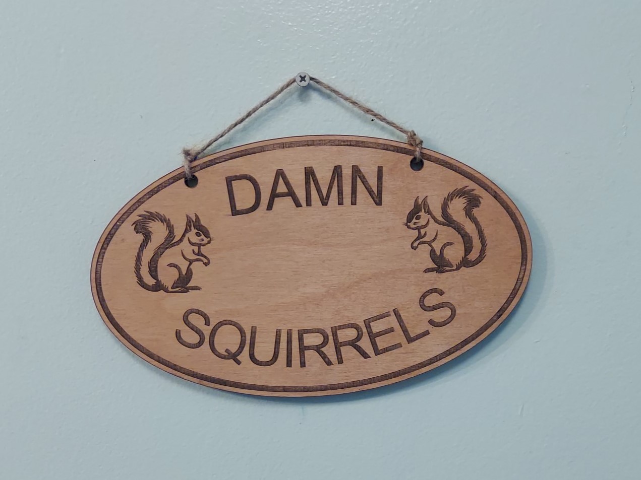 Bring a touch of nature and charm to your home or garden with our laser-engraved wooden sign. Crafted from birch plywood and beautifully detailed for those damn squirrels , this 10" wide by 6" tall oval plaque is perfect for adding personality to your outdoor space.