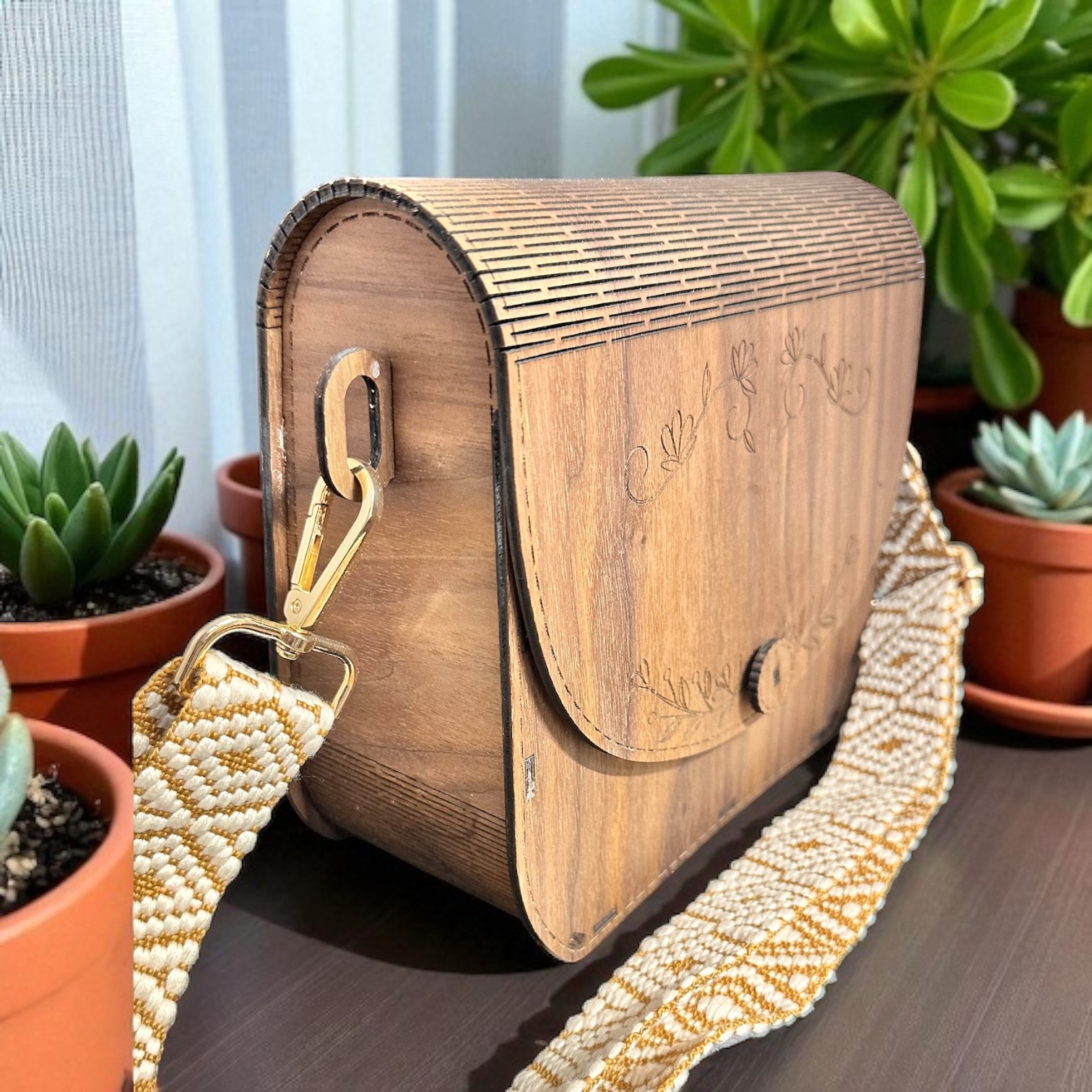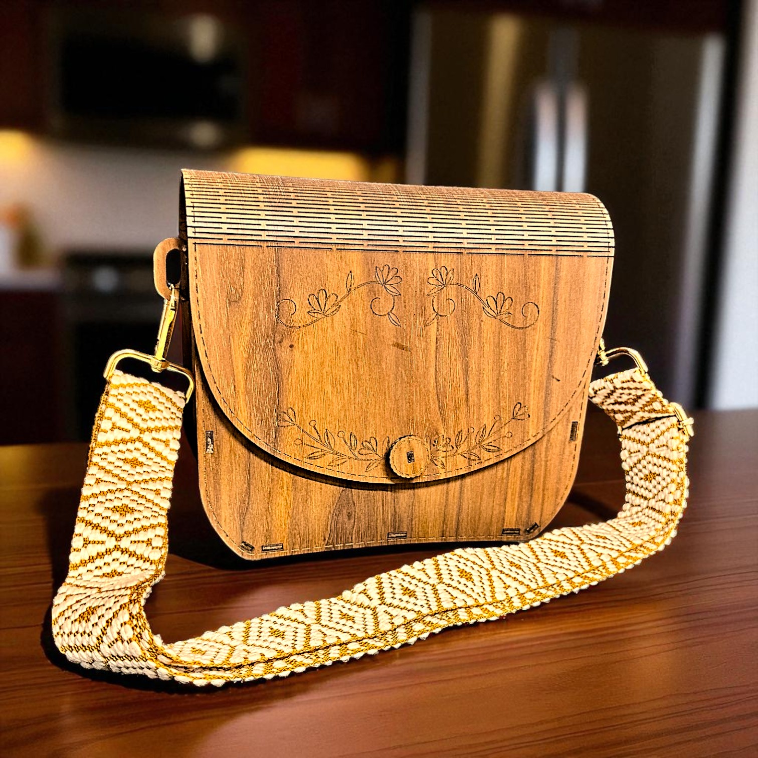 Each piece that makes up the purse is cut to size on a laser machine. Slats are cut into portions of the wood to create unique flexibility allowing the opening flap to bend as needed in a smooth fashion. Some include designs that have been laser engraved into the wood Once all pieces are done, it is then crafted and glued together for the final product.