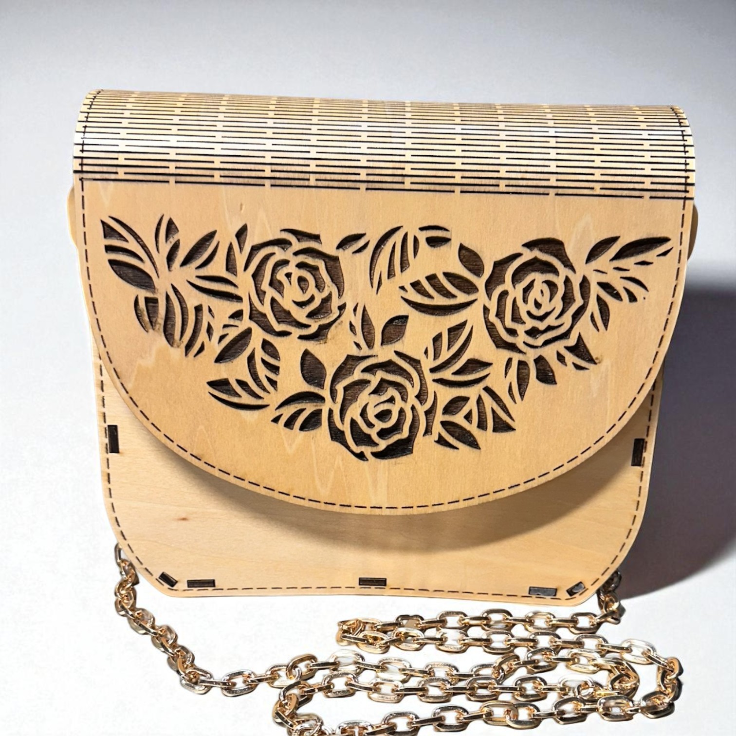 Each piece that makes up the purse is cut to size on a laser machine. Slats are cut into portions of the wood to create unique flexibility allowing the opening flap to bend as needed in a smooth fashion. Some include designs that have been laser engraved into the wood Once all pieces are done, it is then crafted and glued together for the final product.